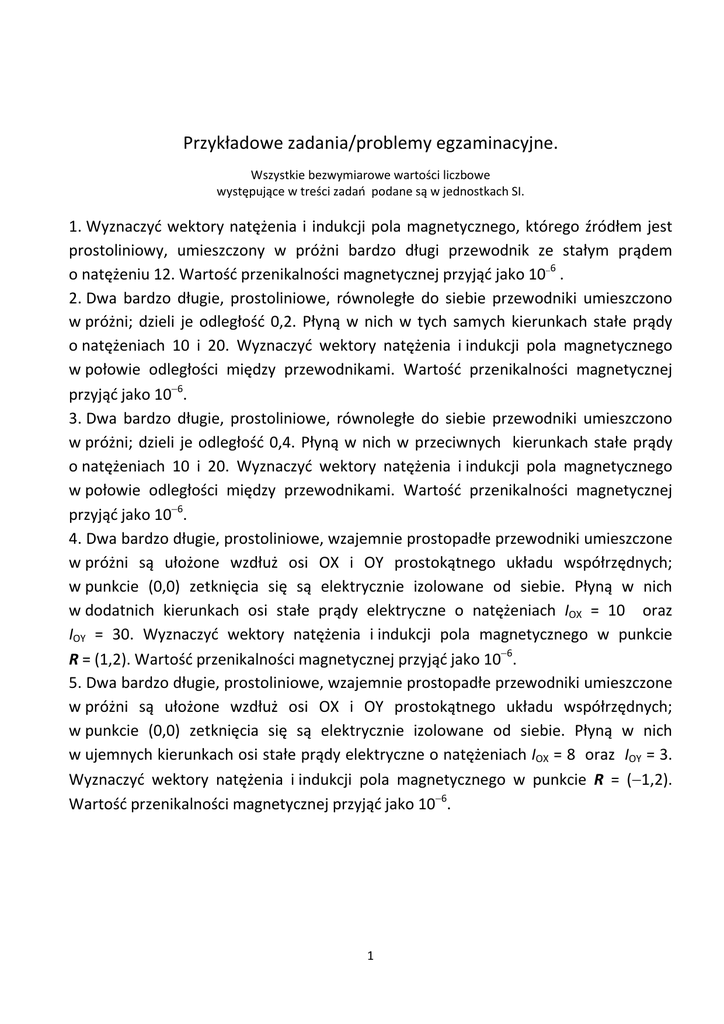 Przykładowe zadania/problemy egzaminacyjne. Wszystkie bezwymiarowe wartości liczbowe występujące w treści zadań podane są w jednostkach SI. 1. Wyznaczyć wektory natężenia i indukcji pola magnetycznego, którego źródłem jest prostoliniowy, umieszczony w próżni bardzo długi przewodnik ze stałym prądem o natężeniu 12. Wartość przenikalności magnetycznej przyjąć jako 10−6 . 2. Dwa bardzo długie, prostoliniowe, równoległe do siebie przewodniki umieszczono w próżni; dzieli je odległość 0,2. Płyną w nich w tych samych kierunkach stałe prądy o natężeniach 10 i 20. Wyznaczyć wektory natężenia i indukcji pola magnetycznego w połowie odległości między przewodnikami. Wartość przenikalności magnetycznej przyjąć jako 10−6. 3. Dwa bardzo długie, prostoliniowe, równoległe do siebie przewodniki umieszczono w próżni; dzieli je odległość 0,4. Płyną w nich w przeciwnych kierunkach stałe prądy o natężeniach 10 i 20. Wyznaczyć wektory natężenia i indukcji pola magnetycznego w połowie odległości między przewodnikami. Wartość przenikalności magnetycznej przyjąć jako 10−6. 4. Dwa bardzo długie, prostoliniowe, wzajemnie prostopadłe przewodniki umieszczone w próżni są ułożone wzdłuż osi OX i OY prostokątnego układu współrzędnych; w punkcie (0,0) zetknięcia się są elektrycznie izolowane od siebie. Płyną w nich w dodatnich kierunkach osi stałe prądy elektryczne o natężeniach IOX = 10 oraz IOY = 30. Wyznaczyć wektory natężenia i indukcji pola magnetycznego w punkcie R = (1,2). Wartość przenikalności magnetycznej przyjąć jako 10−6. 5. Dwa bardzo długie, prostoliniowe, wzajemnie prostopadłe przewodniki umieszczone w próżni są ułożone wzdłuż osi OX i OY prostokątnego układu współrzędnych; w punkcie (0,0) zetknięcia się są elektrycznie izolowane od siebie. Płyną w nich w ujemnych kierunkach osi stałe prądy elektryczne o natężeniach IOX = 8 oraz IOY = 3. Wyznaczyć wektory natężenia i indukcji pola magnetycznego w punkcie R = (−1,2). Wartość przenikalności magnetycznej przyjąć jako 10−6. 1 6. Dwa bardzo długie, prostoliniowe, wzajemnie prostopadłe przewodniki umieszczone w próżni są ułożone wzdłuż osi OX i OY prostokątnego układu współrzędnych; w punkcie (0,0) zetknięcia się są elektrycznie izolowane od siebie. W przewodniku równoległym do osi OX płynie w dodatnim kierunku osi stały prąd elektryczny o natężeniu IOX = 20, natomiast w przewodniku równoległym do osi OY płynie w ujemnym kierunku osi stały prąd elektryczny o natężeniu IOY = 10. Wyznaczyć wektory natężenia i indukcji pola magnetycznego w punkcie R = (1,2). Wartość przenikalności magnetycznej przyjąć jako 10−6. 7. Określić za pomocą jednostek wielkości podstawowych SI jednostki: a) natężenia oraz indukcji pola magnetycznego; b) przenikalności magnetycznej próżni; c) dipolowego momentu magnetycznego. Ws-ka: wielkości podstawowe w SI to m.in.: długość, czas, masa, temperatura, natężenie prądu. 8. Lista zadań z rozdziału 29 III tomu podręcznika D. Halliday, R. Resnick, J. Walker, Podstawy fizyki; numery zadań: 1-4, 6-9, 15-17, 19, 29-30, 33-37, 39, 40, 44, 48-50. 9. Lista zadań z rozdziału 30 III tomu podręcznika D. Halliday, R. Resnick, J. Walker, Podstawy fizyki; numery zadań: 1-2, 4, 21-25, 30, 31, 34, 40-42, 49 . W. Salejda Wrocław, 6 V 2009 2
