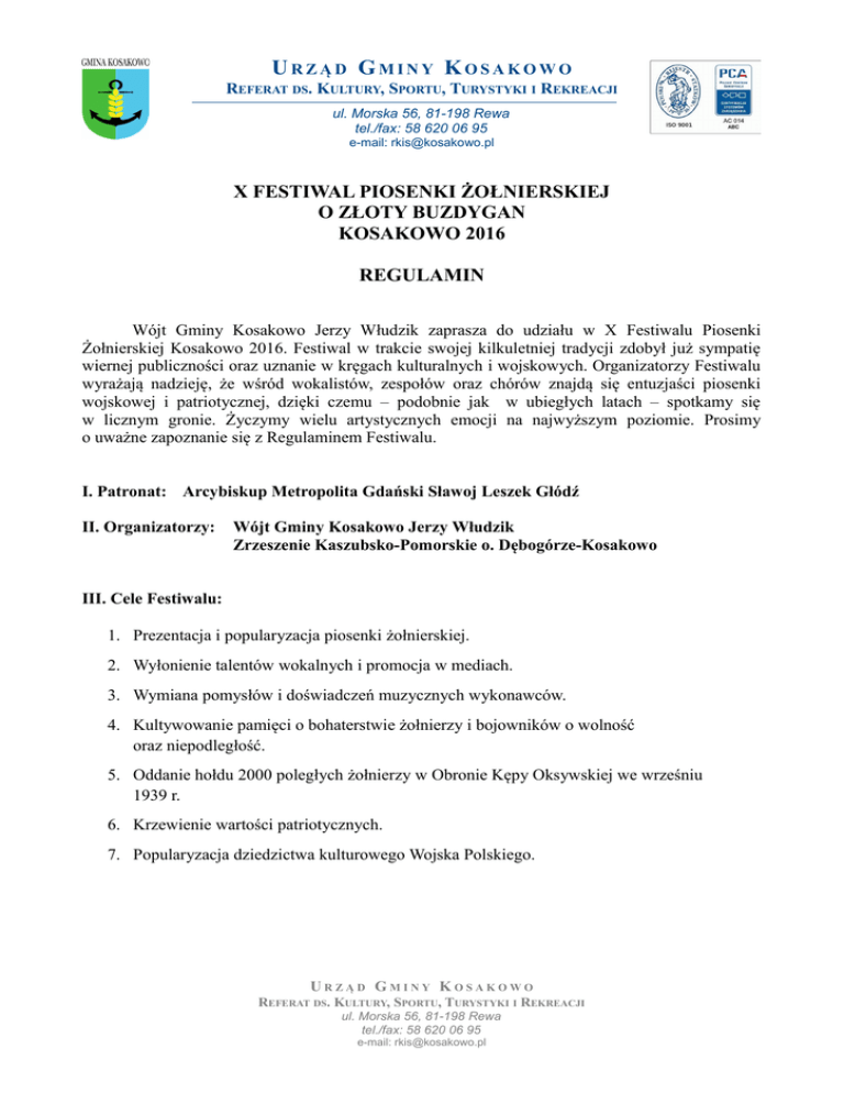 URZĄD GMINY KOSAKOWO REFERAT DS. KULTURY, SPORTU, TURYSTYKI I REKREACJI ul. Morska 56, 81-198 Rewa tel./fax: 58 620 06 95 e-mail: [email protected] X FESTIWAL PIOSENKI ŻOŁNIERSKIEJ O ZŁOTY BUZDYGAN KOSAKOWO 2016 REGULAMIN Wójt Gminy Kosakowo Jerzy Włudzik zaprasza do udziału w X Festiwalu Piosenki Żołnierskiej Kosakowo 2016. Festiwal w trakcie swojej kilkuletniej tradycji zdobył już sympatię wiernej publiczności oraz uznanie w kręgach kulturalnych i wojskowych. Organizatorzy Festiwalu wyrażają nadzieję, że wśród wokalistów, zespołów oraz chórów znajdą się entuzjaści piosenki wojskowej i patriotycznej, dzięki czemu – podobnie jak w ubiegłych latach – spotkamy się w licznym gronie. Życzymy wielu artystycznych emocji na najwyższym poziomie. Prosimy o uważne zapoznanie się z Regulaminem Festiwalu. I. Patronat: Arcybiskup Metropolita Gdański Sławoj Leszek Głódź II. Organizatorzy: Wójt Gminy Kosakowo Jerzy Włudzik Zrzeszenie Kaszubsko-Pomorskie o. Dębogórze-Kosakowo III. Cele Festiwalu: 1. Prezentacja i popularyzacja piosenki żołnierskiej. 2. Wyłonienie talentów wokalnych i promocja w mediach. 3. Wymiana pomysłów i doświadczeń muzycznych wykonawców. 4. Kultywowanie pamięci o bohaterstwie żołnierzy i bojowników o wolność oraz niepodległość. 5. Oddanie hołdu 2000 poległych żołnierzy w Obronie Kępy Oksywskiej we wrześniu 1939 r. 6. Krzewienie wartości patriotycznych. 7. Popularyzacja dziedzictwa kulturowego Wojska Polskiego. URZĄD GMINY KOSAKOWO REFERAT DS. KULTURY, SPORTU, TURYSTYKI I REKREACJI ul. Morska 56, 81-198 Rewa tel./fax: 58 620 06 95 e-mail: [email protected] URZĄD GMINY KOSAKOWO REFERAT DS. KULTURY, SPORTU, TURYSTYKI I REKREACJI ul. Morska 56, 81-198 Rewa tel./fax: 58 620 06 95 e-mail: [email protected] IV. Termin oraz miejsce: Termin: 22 października 2016 r. (sobota), godz. 14.00 – Przesłuchania konkursowe; 23 października 2016 r. (niedziela), godz. 16.00 – Koncert Galowy. Miejsce (Przesłuchania oraz Koncert): Gminny Dom Kultury w Pierwoszynie, ul. Kaszubska 11. V. Kategorie wykonawcze oraz wiekowe: Kategorie wykonawcze: Wokaliści; Zespoły wokalne. Kategorie wiekowe: Młodzież szkół gimnazjalnych oraz ponadgimnazjalnych; Dorośli. VI. Zgłoszenia: 1. Karty zgłoszenia należy pobrać ze strony internetowej gminakosakowo.pl/rkis – w zakładce Dokumenty. 2. Wypełnione Karty należy w nieprzekraczalnym terminie do 10 października 2016 r. do godz. 16.00: a) złożyć osobiście w siedzibie Referatu ds. Kultury, Sportu, Turystyki i Rekreacji Urzędu Gminy Kosakowo – Rewa, ul. Morska 56, 81-198 Kosakowo, b) wysłać drogą elektroniczną na adres e-mail: [email protected], c) wysłać faksem na numer: 58 620 06 95. VII. Repertuar oraz reguły konkursu: 1. Każdy z uczestników przygotowuje do wykonania w trakcie Przesłuchań konkursowych| 2 utwory o tematyce żołnierskiej lub patriotycznej, w czasie nieprzekraczającym łącznie 8 minut dla obu pieśni. 2. Utwory wykonać można a cappella, z towarzyszeniem instrumentów lub z instrumentalnym podkładem muzycznym. Uwaga: instrumentalny podkład muzyczny nie może zawierać URZĄD GMINY KOSAKOWO REFERAT DS. KULTURY, SPORTU, TURYSTYKI I REKREACJI ul. Morska 56, 81-198 Rewa tel./fax: 58 620 06 95 e-mail: [email protected] URZĄD GMINY KOSAKOWO REFERAT DS. KULTURY, SPORTU, TURYSTYKI I REKREACJI ul. Morska 56, 81-198 Rewa tel./fax: 58 620 06 95 e-mail: [email protected] wokalnej ścieżki dźwiękowej (tzw. potocznie chórków). Organizator zapewnia oprawę techniczną występu uczestnika z zastrzeżeniem konieczności dostarczenia realizatorowi dźwięku przed występem płyty CD z podkładem muzycznym – uwaga: nie będą przyjmowane podkłady zarejestrowane na innych nośnikach (np. na USB lub DVD). Organizator nie ponosi odpowiedzialności w przypadku złej jakości dostarczonego materiału dźwiękowego. W trakcie występu nie wolno korzystać z prezentacji multimedialnych. 3. Organizator zapewnia w czasie występu maksymalnie 8 mikrofonów przewodowych. 4. Organizator zapewnia możliwość skorzystania ze znajdującego się w Gminnym Domu Kultury fortepianu klasycznego Yamaha (w tym przypadku prosimy zaznaczyć to w Karcie zgłoszenia). 5. Pod pojęciem piosenki żołnierskiej pojmować się będzie utwory patriotyczne, utwory nawiązujące do szeroko pojmowanej tradycji żołnierskiej oraz oręża polskiego (w tym również pieśni rycerskie), pieśni kultywujące pamięć o wydarzeniach historycznych. 6. W przypadku dużej ilości zgłoszeń Jury Festiwalu zastrzega sobie prawo do skrócenia w dowolnym momencie występu uczestników w czasie przesłuchań konkursowych. 7. Jury Festiwalu spośród wszystkich uczestników wyłoni finalistów, którzy zaprezentują się na Koncercie Galowym. 8. Kryteria oceny Jury: dobór repertuaru, przygotowanie wokalne i muzykalność (najważniejsze kryterium), dykcja, intonacja, interpretacja, ogólne wrażenie artystyczne. 9. Lista finalistów zostanie zamieszczona w porządku alfabetycznym na stronie internetowej Referatu ds. Kultury, Sportu, Turystyki i Rekreacji Urzędu Gminy Kosakowo: www.gminakosakowo.pl/rkis. 10. Zakwalifikowani do drugiego etapu uczestnicy wykonają na Koncercie Galowym jeden utwór – dowolnie wybrany spośród zgłoszonych wcześniej i wykonanych w ramach Przesłuchań Konkursowych. Jury zastrzega sobie prawo zasugerowania finalistom, którą z dwóch piosenek zaleca się do wykonania w czasie Koncertu Galowego. W trakcie Koncertu Galowego nastąpi również wręczenie nagród. 11. Organizatorzy nie zwracają kosztów przejazdu ani pobytu. 12. X Festiwal Piosenki Żołnierskiej Kosakowo 2016 zostanie utrwalony na nośniku cyfrowym. Udział w Festiwalu jest równoznaczny z wyrażeniem zgody na utrwalenie występu, jak również wykorzystanie nagranego materiału w celach promocyjnych oraz dokumentacyjnych. VIII. Nagrody: O podziale nagród i wyróżnień decyduje Jury Festiwalu. 