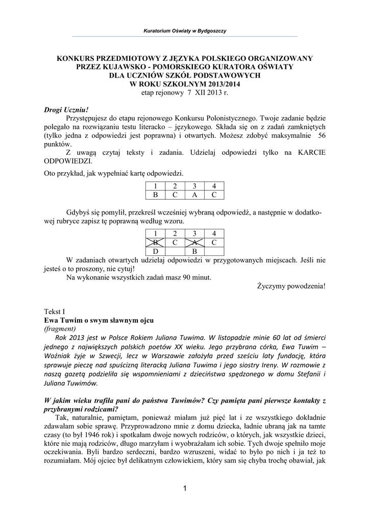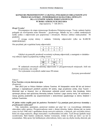 Kuratorium Oświaty w Bydgoszczy KONKURS PRZEDMIOTOWY Z JĘZYKA POLSKIEGO ORGANIZOWANY PRZEZ KUJAWSKO - POMORSKIEGO KURATORA OŚWIATY DLA UCZNIÓW SZKÓŁ PODSTAWOWYCH W ROKU SZKOLNYM 2013/2014 etap rejonowy 7 XII 2013 r. Drogi Uczniu! Przystępujesz do etapu rejonowego Konkursu Polonistycznego. Twoje zadanie będzie polegało na rozwiązaniu testu literacko – językowego. Składa się on z zadań zamkniętych (tylko jedna z odpowiedzi jest poprawna) i otwartych. Możesz zdobyć maksymalnie 56 punktów. Z uwagą czytaj teksty i zadania. Udzielaj odpowiedzi tylko na KARCIE ODPOWIEDZI. Oto przykład, jak wypełniać kartę odpowiedzi. 1 B 2 C 3 A 4 C Gdybyś się pomylił, przekreśl wcześniej wybraną odpowiedź, a następnie w dodatkowej rubryce zapisz tę poprawną według wzoru. 1 2 3 4 B C A C D B W zadaniach otwartych udzielaj odpowiedzi w przygotowanych miejscach. Jeśli nie jesteś o to proszony, nie cytuj! Na wykonanie wszystkich zadań masz 90 minut. Życzymy powodzenia! Tekst I Ewa Tuwim o swym sławnym ojcu (fragment) Rok 2013 jest w Polsce Rokiem Juliana Tuwima. W listopadzie minie 60 lat od śmierci jednego z największych polskich poetów XX wieku. Jego przybrana córka, Ewa Tuwim – Woźniak żyje w Szwecji, lecz w Warszawie założyła przed sześciu laty fundację, która sprawuje pieczę nad spuścizną literacką Juliana Tuwima i jego siostry Ireny. W rozmowie z naszą gazetą podzieliła się wspomnieniami z dzieciństwa spędzonego w domu Stefanii i Juliana Tuwimów. W jakim wieku trafiła pani do państwa Tuwimów? Czy pamięta pani pierwsze kontakty z przybranymi rodzicami? Tak, naturalnie, pamiętam, ponieważ miałam już pięć lat i ze wszystkiego dokładnie zdawałam sobie sprawę. Przyprowadzono mnie z domu dziecka, ładnie ubraną jak na tamte czasy (to był 1946 rok) i spotkałam dwoje nowych rodziców, o których, jak wszystkie dzieci, które nie mają rodziców, długo marzyłam i wyobrażałam ich sobie. Tych dwoje spełniło moje oczekiwania. Byli bardzo serdeczni, bardzo wzruszeni, widać to było po nich i ja też to rozumiałam. Mój ojciec był delikatnym człowiekiem, który sam się chyba trochę obawiał, jak 1 Kuratorium Oświaty w Bydgoszczy to spotkanie wyjdzie, więc byliśmy wszyscy dosyć napięci. Ale wszystko zakończyło się uściskami, pocałunkami… Które utwory Juliana Tuwima najbardziej lubiła pani w dzieciństwie, a które obecnie pani najbardziej sobie ceni? Z wierszy dla dzieci strasznie lubiłam „Słonia Trąbalskiego”, a poza tym „Ptasie radio”. Podobała mi się ta kłótnia między ptaszkami, to, że zwierzątka też czasem nie umieją się porozumieć, tak jak my w przedszkolu. To naprawdę śliczny wierszyk i do tej pory mi się podoba. A jeśli chodzi o twórczość dla dorosłych, to są to wiersze różnego rodzaju, bo ojciec pisał w różnych etapach swojego życia utwory na różne tematy, o różnych nastrojach. Z tym pogodnych bardzo lubię „Czereśnie” i „Daleki tygrys”, z tych poważniejszych wiersz „Do siebie”. Również podoba mi się taki satyryczny w pewnym sensie wiersz „Rachunek”. Z wierszy bardzo dużo dowiaduję się o moim ojcu, który wcześnie umarł. Lubię wiersz „Dziw na niebie”, który mówi o burzy, ale w taki sposób, w jaki nikt nie umie tego opowiedzieć. Wyobrażam sobie, że poeta, który pisał tak genialne, tak dynamiczne wiersze dla dzieci, musiał być człowiekiem, z którym dzieci się nie nudzą. Czy pamięta pani zabawy, a może wycieczki z ojcem? Wycieczek nie pamiętam. Mój ojciec rzadko wychodził z domu, bo cierpiał na lęk przestrzeni. Natomiast dużo bawił się ze mną w pokoju – póki dobrze się czuł. Pod koniec życia dużo chorował i wtedy mniej się bawiliśmy. Ale kiedy byłam jeszcze malutka – miałam 6, 7, 8 lat, wtedy bawił się ze mną w różne zabawy matematyczne, zagadki, rebusy. Kiedyś nawet, jak przyszli do mnie koledzy, to nas uczył tańczyć walca. Był bardzo przyjemnym towarzyszem zabaw. Rozmowę przeprowadziła Danuta Chlup. „Głos Ludu. Gazeta Polaków w Republice Czeskiej”, 2013, nr 23 (LXVIII), s. 3. Zadania do tekstu I 1. Wyjaśnij, jaki był główny powód zamieszczenia tego wywiadu w gazecie? 2. Jaki cel przyświeca fundacji założonej przez córkę Tuwima? 3. W jaki sposób córka przedstawia swojego ojca? A. Dobry, wrażliwy człowiek. B. Miał lęk przestrzeni, rzadko wychodził z domu. C. Lubił bawić się z dziećmi, szczególnie pasjonowały go zabawy matematyczne. D. Wszystkie odpowiedzi są poprawne. 4. Która informacja jest nieprawdziwa? A. Córka pamięta, że ojciec niechętnie wychodził na wycieczki, bo wolał bawić się z nią w domu. B. Córka założyła w Warszawie fundację, nim przybyła do domu poety mieszkała w domu dziecka. C. Przybrana córka miała na imię Ewa, zamieszkała z Tuwimami, kiedy miała pięć lat, obecnie mieszka w Szwecji. D. Przybrana córka poety zachwyca się twórczością ojca, lubi szczególnie wiersze: „Słonia Trąbalskiego”, „Ptasie radio”, „ Czereśnie”, „Dalekiego tygrysa”. 2 Kuratorium Oświaty w Bydgoszczy 5. Mówiąc, wyobrażam sobie, że poeta,[…], musiał być człowiekiem, z którym dzieci się nie nudzą, osoba prowadząca wywiad A. podaje informacje o poecie. B. oczekuje od córki poety potwierdzenia tych słów. C. przytacza opinie innych osób. D. nie wyraża własnego zdania. Tekst II Rozsadzał jak dynamitem szarość i ubóstwo naszego życia (fragment) Jarosław Iwaszkiewicz poznał rodziców Tuwima w latach dwudziestych XX wieku, kiedy przyjaciele poety przyjeżdżali do Łodzi na wieczory czytania poezji. Zapamiętał piękną matkę i ojca, postawnego mężczyznę, w młodości być może nawet przystojniejszego od syna. […] Po ojcu, który gromadził słowniki, a na starość zaczął uczyć się włoskiego, Julek odziedziczył zamiłowania lingwistyczne, po matce miłość do polskiej poezji. Wspominał, jak w 