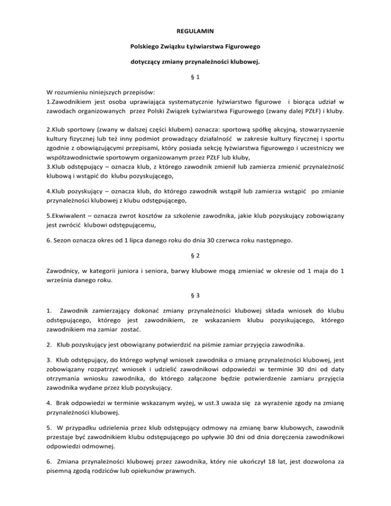 REGULAMIN Polskiego Związku Łyżwiarstwa Figurowego dotyczący zmiany przynależności klubowej. § 1 W rozumieniu niniejszych przepisów: 1.Zawodnikiem jest osoba uprawiająca systematycznie łyżwiarstwo figurowe i biorąca udział w zawodach organizowanych przez Polski Związek Łyżwiarstwa Figurowego (zwany dalej PZŁF) i kluby. 2.Klub sportowy (zwany w dalszej części klubem) oznacza: sportową spółkę akcyjną, stowarzyszenie kultury fizycznej lub też inny podmiot prowadzący działalność w zakresie kultury fizycznej i sportu zgodnie z obowiązującymi przepisami, który posiada sekcję łyżwiarstwa figurowego i uczestniczy we współzawodnictwie sportowym organizowanym przez PZŁF lub kluby, 3.Klub odstępujący – oznacza klub, z którego zawodnik zmienił lub zamierza zmienić przynależność klubową i wstąpić do klubu pozyskującego, 4.Klub pozyskujący – oznacza klub, do którego zawodnik wstąpił lub zamierza wstąpić po zmianie przynależności klubowej z klubu odstępującego, 5.Ekwiwalent – oznacza zwrot kosztów za szkolenie zawodnika, jakie klub pozyskujący zobowiązany jest zwrócić klubowi odstępującemu, 6. Sezon oznacza okres od 1 lipca danego roku do dnia 30 czerwca roku następnego. § 2 Zawodnicy, w kategorii juniora i seniora, barwy klubowe mogą zmieniać w okresie od 1 maja do 1 września danego roku. § 3 1. Zawodnik zamierzający dokonać zmiany przynależności klubowej składa wniosek do klubu odstępującego, którego jest zawodnikiem, ze wskazaniem klubu pozyskującego, którego zawodnikiem ma zamiar zostać. 2. Klub pozyskujący jest obowiązany potwierdzić na piśmie zamiar przyjęcia zawodnika. 3. Klub odstępujący, do którego wpłynął wniosek zawodnika o zmianę przynależności klubowej, jest zobowiązany rozpatrzyć wniosek i udzielić zawodnikowi odpowiedzi w terminie 30 dni od daty otrzymania wniosku zawodnika, do którego załączone będzie potwierdzenie zamiaru przyjęcia zawodnika wydane przez klub pozyskujący. 4. Brak odpowiedzi w terminie wskazanym wyżej, w ust.3 uważa się za wyrażenie zgody na zmianę przynależności klubowej. 5. W przypadku udzielenia przez klub odstępujący odmowy na zmianę barw klubowych, zawodnik przestaje być zawodnikiem klubu odstępującego po upływie 30 dni od dnia doręczenia zawodnikowi odpowiedzi odmownej. 6. Zmiana przynależności klubowej przez zawodnika, który nie ukończył 18 lat, jest dozwolona za pisemną zgodą rodziców lub opiekunów prawnych. 7. W przypadku wystąpienia do klubu odstępującego przez zawodnika, który nie ukończył 18 lat, o wyrażenie zgody na zmianę przynależności w związku ze zmianą miejsca stałego pobytu (do innej miejscowości, w której działa klub pozyskujący) przez zawodnika i jego opiekunów prawnych, z którymi wspólnie zamieszkuje, klub odstępujący zobowiązany jest wyrazić zgodę na zmianę przynależności klubowej, o ile nie zachodzi uzasadniona, konieczność uiszczenia zgodnego z tym regulaminem ekwiwalentu. § 4 Zmiana przynależności klubowej przez zawodnika kadry narodowej wymaga zgody PZŁF. § 5 Zawodnika, który przestał być zawodnikiem klubu odstępującego w trybie określonym w § 5 ust. 5 niniejszego regulaminu, obowiązuje roczna karencja, biegnąca od daty otrzymania odmowy na zmianę przynależności klubowej. Karencja polega na zawieszeniu prawa do reprezentowania przez zawodnika klubu w zawodach sportowych. Zawodnik może być w okresie karencji dopuszczony, za zgodą PZŁF, do udziału w zawodach jako zawodnik niezrzeszony, Klub odstępujący jest zobowiązany do powiadomienia PZŁF o karencji zawodnika. W przypadku rozwiązania Klubu (sekcji) lub zaprzestania szkolenia zawodnika karencja nie biegnie. § 6 Zawodnik po upływie połowy rocznej karencji może wystąpić z wnioskiem do PZŁF o skrócenie okresu karencji. § 7 PZŁF w przypadkach uzasadnionych względami szkoleniowymi, po zasięgnięciu opinii zainteresowanych klubów, może z urzędu zmienić, za zgodą zawodnika jego przynależność klubową. § 8 Zawodnikowi może być udzielone zwolnienie okresowe w razie powołania zawodnika do odbycia zasadniczej służby wojskowej, podjęcia nauki lub studiów poza miejscem dotychczasowego zamieszkania. Zwolnienie okresowe, o którym mowa wyżej w ust.1 udzielane jest na okres odbywania służby wojskowej lub nauki i studiów. Zwolnienie okresowe, o którym mowa wyżej w ust.1 może być udzielone zawodnikowi jeden raz w czasie trwania kariery sportowej na każdy z wyżej wymienionych w ust. 2 zdarzeń. Po zakończeniu zwolnienia okresowego, zawodnik jest obowiązany powrócić do klubu odstępującego, z którego uzyskał zwolnienie okresowe do klubu pozyskującego. § 9 Klub odstępujący, z którego odchodzi zawodnik w wyniku zmiany przynależności klubowej, może żądać od klubu pozyskującego, do którego zawodnik odchodzi ekwiwalentu za szkolenie zawodnika. Ekwiwalent za szkolenie może być ustalony w formie rzeczowej lub finansowej. Wysokość ekwiwalentu za szkolenie zawodnika ustalają zainteresowane kluby. Ekwiwalent za szkolenie zawodnika nie może być wyższy niż 20.000,‐PLN Klub odstępujący żądający ekwiwalentu za szkolenie zawodnika ma obowiązek przedstawić zestawienie kosztów szkolenia, które klub odstępujący poniósł z własnych środków na szkolenie zawodnika. Zestawienie winno być załączone do odpowiedzi klubu odstępującego na wniosek zawodnika zwracającego się o zmianę przynależności klubowej. Do kosztów szkolenia zawodnika nie zalicza się środków finansowych i rzeczowych uzyskanych przez klub odstępujący z dotacji udzielonych klubowi odstępującemu przez administrację publiczną, PZŁF, od rodziców zawodnika – na szkolenie. Kluby mogą zawierać między sobą porozumienia, o ile nie pozostają one w sprzeczności z tym regulaminem. § 10 Ekwiwalent za szkolenie zawodnika nie przysługuje w razie zwolnienia okresowego, którego okres 
