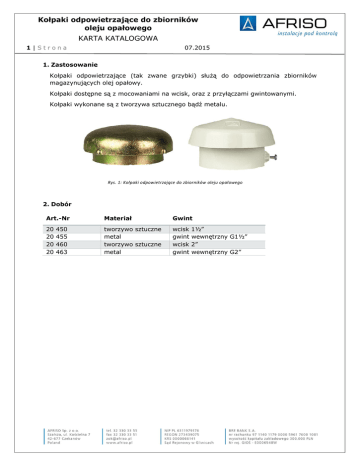 Kołpaki odpowietrzające do zbiorników oleju opałowego KARTA KATALOGOWA 1|Strona 07.2015 1. Zastosowanie Kołpaki odpowietrzające (tak zwane grzybki) służą do odpowietrzania zbiorników magazynujących olej opałowy. Kołpaki dostępne są z mocowaniami na wcisk, oraz z przyłączami gwintowanymi. Kołpaki wykonane są z tworzywa sztucznego bądź metalu. Rys. 1: Kołpaki odpowietrzające do zbiorników oleju opałowego 2. Dobór Art.-Nr Materiał Gwint 20 20 20 20 tworzywo sztuczne metal tworzywo sztuczne metal wcisk gwint wcisk gwint 450 455 460 463 1½” wewnętrzny G1½” 2” wewnętrzny G2”