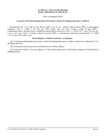 UCHWAŁA NR LXXXIX/456/2010 RADY MIEJSKIEJ W JEDLICZU z dnia 10 listopada 2010 r. w sprawie uchwalenia Regulaminu korzystania z Domu Przedpogrzebowego w Jedliczu Na podstawie art. 7 ust. 1 pkt 13 i art. 40 ust. 2 pkt 4 i art. 41 ust. 1 ustawy z dnia 8 marca 1990 r. o samorządzie gminnym ( Dz. U. z 2001 r., Nr 142, poz. 1591 z późn. zm.), art. 4 ust. 1 ustawy z dnia 20 lipca 2000 r. o ogłaszaniu aktów normatywnych i niektórych innych aktów prawnych ( Dz. U. z 2010, Nr 17, poz. 95) oraz art. 1 ust. 1 i art. 5 ust. 2 pkt 1 i 3 ustawy z dnia 31 stycznia 1959 r. o cmentarzach i chowaniu zmarłych (Dz. U. z 2000 r. Nr 23, poz. 295 z późn. zm.) Rada Miejska w Jedliczu uchwala, co następuje: § 1. Uchwala się Regulamin korzystania z Domu Przedpogrzebowego w Jedliczu, stanowiący załącznik nr 1 do niniejszej uchwały. § 2. Wykonanie uchwały powierza się Burmistrzowi Gminy Jedlicze. § 3. Uchwała wchodzi w życie po upływie 14 dni od dnia ogłoszenia w Dzienniku Urzędowym Województwa Podkarpackiego Id: YXLOH-EVCZX-GKPVA-GLQOL-BURNJ. Podpisany Strona 1 Załącznik do Uchwały Nr LXXXIX/456/2010 Rady Miejskiej w Jedliczu z dnia 10 listopada 2010 r. Regulamin korzystania z Domu Przedpogrzebowego w Jedliczu Rozdział I. Przepisy ogólne § 1. Dom Przedpogrzebowy wraz z znajdującą się w nim chłodnią położony w Jedliczu stanowi własność Gminy Jedlicze. § 2. Domem Przedpogrzebowym zarządza Zarządca wyłoniony zgodnie z obowiązującymi przepisami przez Gminę Jedlicze zwanym dalej „zarządcą”. § 3. Korzystanie z Domu Przedpogrzebowego oraz chłodni jest odpłatne. Opłatę pobiera zarządca zgodnie z cennikiem. § 4. Dom Przedpogrzebowy może być udostępniany również w przypadku, gdy pogrzeb będzie mieć miejsce na innym cmentarzu. § 5. 1. Za utrzymanie ładu i porządku w czasie przechowywania zwłok odpowiada zarządca. Organizator pogrzebu jest zobowiązany podporządkować się jego zaleceniom. 2. Na zarządcy ciąży również obowiązek postępowania zgodnie z przepisami sanitarnymi dotyczącymi postępowania ze zwłokami. § 6. Drzwi zewnętrzne należy zamykać w celu zabezpieczenia pomieszczeń przed zwierzętami, owadami i wysoką temperaturą. § 7. Nadzór nad prawidłowym funkcjonowaniem Domu Przedpogrzebowego sprawują odpowiednie referaty Urzędu Gminy w Jedliczu, przy ul. Rynek 6. Rozdział II. Korzystanie z pomieszczeń Domu Przedpogrzebowego. § 8. Dom Przedpogrzebowy służy do przechowywania zwłok i wykonywania ceremonii pogrzebowych. Jest miejscem ciszy i powagi. § 9. 1. Prawo przechowywania zwłok ludzkich w Domu Przedpogrzebowym ma najbliższa pozostała rodzina osoby zmarłej, a mianowicie: 1) pozostały małżonek(-ka), 2) krewni zstępni, 3) krewni wstępni, 4) krewni boczni do 4 stopnia pokrewieństwa, 5) powinowaci w linii prostej do 1 stopnia. 2. Ponadto prawo przechowywania zwłok ludzkich w Domu Przedpogrzebowym przysługuje osobom wskazanym w art. 10 ust. 1 ustawy z dnia 31 stycznia 1959 r. o cmentarzach i chowaniu zmarłych (Dz. U. z 2000 r. Nr 23, poz. 295 z późn. zm.). § 10. W skład Domu Przedpogrzebowego wchodzi sala ceremonialna. Sala ceremonialna udostępniana jest na życzenie osób uprawnionych do pochowania zwłok oraz dla osób biorących udział w ceremonii pogrzebowej na godzinę przez pogrzebem. § 11. Dom Przedpogrzebowy czynny jest w dni robocze w godzinach od 700 do 1500 a w soboty w godzinach od 700 do 1100. Poza godzinami pracy pełniony jest dyżur telefoniczny. Numer telefonu podany jest na tablicy informacyjnej. Id: YXLOH-EVCZX-GKPVA-GLQOL-BURNJ. Podpisany Strona 1 § 12. Dom Przedpogrzebowy przyjmuje i organizuje pochówki osób bez względu na ich wyznanie. § 13. Na godzinę przed planowaną uroczystością pracownicy zarządcy wystawiają trumnę z ciałem. § 14. W Domu Przedpogrzebowym możliwe jest otwarcie trumny w celu pożegnania osoby zmarłej przez rodzinę i osoby bliskie oraz położenia przy trumnie wieńców i kwiatów. § 15. Nie zezwala się na przechowywanie w Domu Przedpogrzebowym zwłok będących w daleko posuniętym rozkładzie lub po śmierci będącej przyczyną chorób zakaźnych. § 16. Za przedmioty prywatne użyte do dekoracji lub obrządku pogrzebowego zarządca Domu Przedpogrzebowego nie ponosi odpowiedzialności. Rozdział III. Korzystanie z chłodni § 17. Chłodnia przyjmuje do przechowywania ciała osób zmarłych przez całą dobę, we wszystkie dni tygodnia, za wyjątkiem przypadków wymienionych w § 15 . § 18. Ciała do chłodni przyjmowane są w dni robocze w godzinach od 700 do 1500 przez pracownika zarządcy Domu Przedpogrzebowego, w pozostałe dni i po godzinach przez osoby upoważnione przez zarządcę. § 19. Dokumentem uprawnionym do przyjęcia ciała osoby zmarłej do chłodni jest karta zgonu wydana przez lekarza. W przypadku gdy przyczyną zgonu było przestępstwo, na pochowanie zwłok oprócz karty zgonu wymagane jest zezwolenie prokuratora. § 20. Do chłodni przyjmowane są osoby zmarłe w szpitalu jak i poza szpitalem. § 21. Przechowywanie ciała osoby zmarłej odbywa się z reguły do 48 godzin, a w sytuacjach szczególnych dopuszcza się dłuższe przechowywanie. § 22. Wydawanie ciała osoby zmarłej osobom uprawnionym do ich pochowania odbywa się w dni robocze w godzinach od 7.00 do 15.00 a w soboty w godzinach od 7.00 do 11.00, poza godzinami pracy pełniony jest dyżur telefoniczny. Numer telefonu podany jest na tablicy informacyjnej. § 23. Zarządca Domu Przedpogrzebowego nie ponosi odpowiedzialności za osoby prowadzące usługi pogrzebowe. § 24. W sprawach nieuregulowanych w regulaminie zastosowanie mają przepisy ustawy z dnia 31 stycznia 1959 r. o cmentarzach i chowaniu zmarłych (Dz. U. z 2000 r. Nr 23, poz. 295 z późn. zm.). Przewodniczący Rady Piotr Krawczyk Id: YXLOH-EVCZX-GKPVA-GLQOL-BURNJ. Podpisany Strona 2