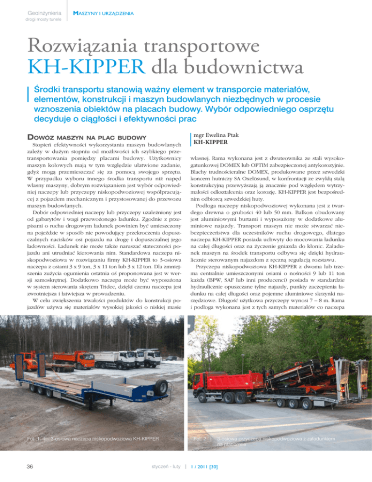 Geoinżynieria MASZYNY I URZĄDZENIA drogi mosty tunele Rozwiązania transportowe KH-KIPPER dla budownictwa Środki transportu stanowią ważny element w transporcie materiałów, elementów, konstrukcji i maszyn budowlanych niezbędnych w procesie wznoszenia obiektów na placach budowy. Wybór odpowiedniego osprzętu decyduje o ciągłości i efektywności prac DOWÓZ MASZYN NA PLAC BUDOWY Stopień efektywności wykorzystania maszyn budowlanych zależy w dużym stopniu od możliwości ich szybkiego przetransportowania pomiędzy placami budowy. Użytkownicy maszyn kołowych mają w tym względzie ułatwione zadanie, gdyż mogą przemieszczać się za pomocą swojego sprzętu. W przypadku wyboru innego środka transportu niż napęd własny maszyny, dobrym rozwiązaniem jest wybór odpowiedniej naczepy lub przyczepy niskopodwoziowej współpracującej z pojazdem mechanicznym i przystosowanej do przewozu maszyn budowlanych. Dobór odpowiedniej naczepy lub przyczepy uzależniony jest od gabarytów i wagi przewożonego ładunku. Zgodnie z przepisami o ruchu drogowym ładunek powinien być umieszczony na pojeździe w sposób nie powodujący przekroczenia dopuszczalnych nacisków osi pojazdu na drogę i dopuszczalnej jego ładowności. Ładunek nie może także naruszać stateczności pojazdu ani utrudniać kierowania nim. Standardowa naczepa niskopodwoziowa w rozwiązaniu firmy KH-KIPPER to 3-osiowa naczepa z osiami 3 x 9 ton, 3 x 11 ton lub 3 x 12 ton. Dla zmniejszenia zużycia ogumienia ostatnia oś proponowana jest w wersji samoskrętnej. Dodatkowo naczepa może być wyposażona w system sterowania skrętem Tridec, dzięki czemu naczepa jest zwrotniejsza i łatwiejsza w prowadzeniu. W celu zwiększenia trwałości produktów do konstrukcji pojazdów używa się materiałów wysokiej jakości o niskiej masie Fot. 1. | 36 3-osiowa naczepa niskopodwoziowa KH-KIPPER styczeń - luty mgr Ewelina Ptak KH-KIPPER własnej. Rama wykonana jest z dwuteownika ze stali wysokogatunkowej DOMEX lub OPTIM zabezpieczonej antykorozyjnie. Blachy trudnościeralne DOMEX, produkowane przez szwedzki koncern hutniczy SA Oxelösund, w konfrontacji ze zwykłą stalą konstrukcyjną przewyższają ją znacznie pod względem wytrzymałości odkształcenia oraz korozję. KH-KIPPER jest bezpośrednim odbiorcą szwedzkiej huty. Podłoga naczepy niskopodwoziowej wykonana jest z twardego drewna o grubości 40 lub 50 mm. Balkon obudowany jest aluminiowymi burtami i wyposażony w dodatkowe aluminiowe najazdy. Transport maszyn nie może stwarzać niebezpieczeństwa dla uczestników ruchu drogowego, dlatego naczepa KH-KIPPER posiada uchwyty do mocowania ładunku na całej długości oraz na życzenie gniazda do kłonic. Załadunek maszyn na środek transportu odbywa się dzięki hydraulicznie sterowanym najazdom z ręczną regulacją rozstawu. Przyczepa niskopodwoziowa KH-KIPPER z dwoma lub trzema centralnie umieszczonymi osiami o nośności 9 lub 11 ton każda (BPW, SAF lub inni producenci) posiada w standardzie hydraulicznie opuszczane tylne najazdy, punkty zaczepienia ładunku na całej długości oraz pojemne aluminiowe skrzynki narzędziowe. Długość użytkowa przyczepy wynosi 7 – 8 m. Rama i podłoga wykonana jest z tych samych materiałów co naczepa Fot. 2. | 3-osiowa przyczepa niskopodwoziowa z załadunkiem na platformie 1 / 2011 [30] MASZYNY I URZĄDZENIA Geoinżynieria drogi mosty tunele Fot. 3. | 2-osiowa przyczepa niskopodwoziowa KH-KIPPER prezentowana na Targach Infrastruktura w Warszawie niskopodwoziowa. Opcjonalnie przyczepa może posiadać aluminiowe burty. TRANSPORT Fot. 4. | Przyczepa - wywrotka budowlana off-road świetnie sprawdza się w trudnym terenie przed uszkodzeniem. Przyczepa stwarza szerokie możliwości transportowe: zmiana rozstawu osi od 6,5 do 11 m pozwala na transport ładunków o długości 8 – 14 m. Przyczepa posiada bębnowe hamulce pneumatyczne, a dodatkowy hamulec ręczny tylnej osi umożliwia zsuwanie i rozsuwanie. MATERIAŁÓW W TRUDNYM TERENIE Przyczepa – wywrotka budowlana off –road według konstrukcji KH-KIPPER przeznaczona jest do pracy w trudnym terenie, takim jak nieutwardzone drogi i pola. Oprócz zastosowań przy robotach ziemnych może być z powodzeniem wykorzystywana W celu uzyskania dodatkowych informacji na temat opisyrównież do transportu w rolnictwie. wanych produktów zachęcamy do odwiedzenia strony interDzięki półokrągłemu kształtowi skrzyni przyczepa świetnie netowej producenta www.kh-kipper.pl lub do kontaktu z aunadaje się do przewozu półpłynnych mas, piasku, gruzu butorem artykułu. dowlanego, wywozu ziemi z placu budowy. Przyczepa-wywrotka posiada 2 osie o Fot. 5, 6. | Zmiana rozstawu osi przyczepy do przewozu nośności 11 ton ze specjalną konstrukcją zawieszenia niezależnego sprawdzającego się w trudnym terenie. Skrzynia o objętości około 15 m3 wykonana jest ze stali trudnościeralnych (podłoga HARDOX lub OPTIM, burty HARDOX, DOMEX lub OPTIM). Opcjonalnie nadstawki (demontowalne lub zamocowane na stałe) zwiększają objętość przyczepy z 15 do 20 m3 . PRZEWÓZ DŁUŻYCY Dwuosiowa rozsuwana przyczepa z obrotnicą KH-KIPPER, dedykowana firmom zajmującym się budową, modernizacją i remontami instalacji gazowych i wodociągowych, z powodzeniem może współpracować z maszynami budowlanymi lub ciągnikami rolniczymi. Dzięki mechanicznemu zawieszeniu z osiami 9 ton przyczepa przystosowana jest do jazdy w trudnym terenie. Rama przyczepy wykonana została z wysokogatunkowej stali, wewnętrzne powierzchnie rozsuwanych na boki kłonic są wyłożone gumą. Pasy transportowe oraz zabezpieczenia przed przesuwaniem umiejscowione z przodu przyczepy zabezpieczają ładunek Fot. 6 | Przyczepa KH-KIPPER przeznaczona do przewozu dłużycy styczeń - luty 1 / 2011 [30] 37