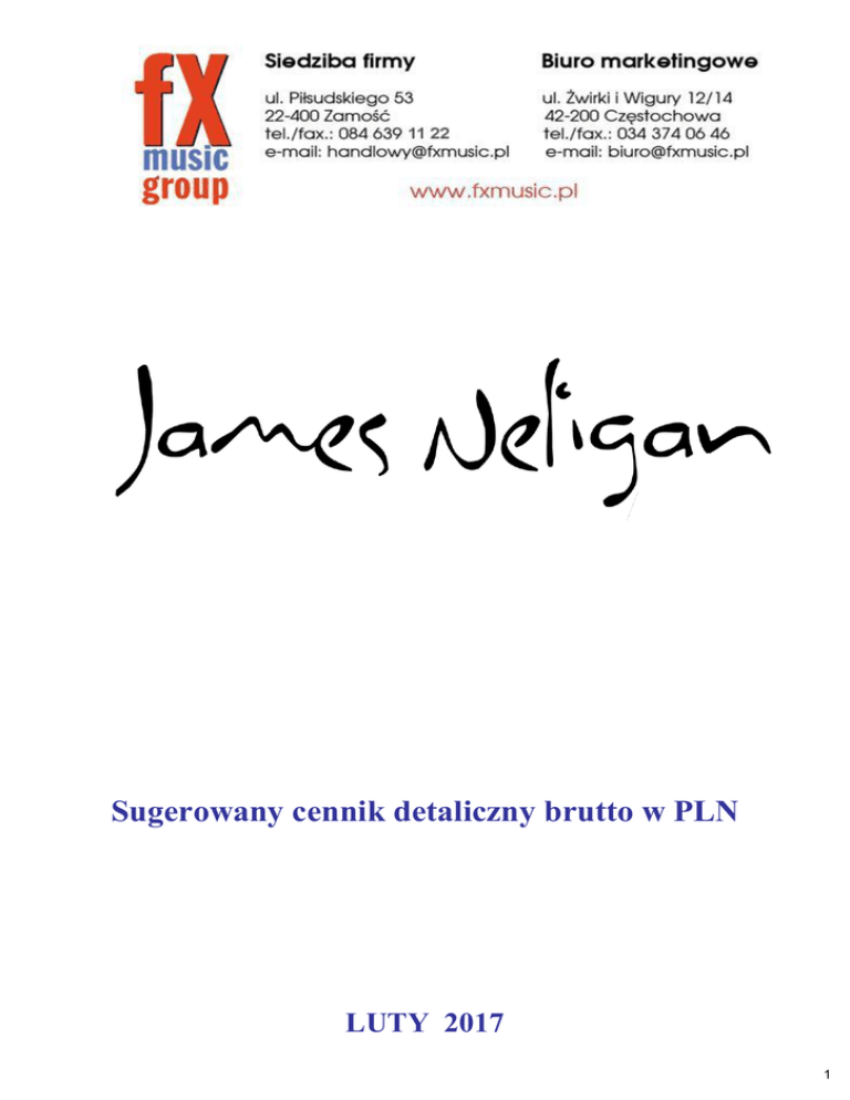 Sugerowany cennik detaliczny brutto w PLN LUTY 2017 1 Model Opis Sugerowana cena detal. brutto PLN Seria ASYLA ASY-D ASY-D LH ASY-A ASY-A LH ASY-A MINI ASY-A MINI LH ASY-DCE ASY-DCE LH ASY-ACE ASY-ACE LH Korpus Dreadnought, boki i tył mahoń, płyta wierzchnia lity świerk, gryf mahon, podstrunnica palisander. Korpus Dreadnought, boki i tył mahoń, płyta wierzchnia lity świerk, gryf mahon, podstrunnica palisander, leworęczna. Korpus Auditorium, boki i tył mahoń, płyta wierzchnia lity świerk, gryf mahon, podstrunnica palisander. Korpus Auditorium, boki i tył mahoń, płyta wierzchnia lity świerk, gryf mahon, podstrunnica palisander, leworęczna. Korpus Auditorium Traveler, boki i tył mahoń, płyta wierzchnia lity świerk, gryf mahon, podstrunnica palisander. Korpus Auditorium Traveler, boki i tył mahoń, płyta wierzchnia lity świerk, gryf mahon, podstrunnica palisander, leworęczna. Korpus Dreadnought cutaway, boki i tył mahoń, płyta wierzchnia lity świerk, gryf mahon, podstrunnica palisander, elektronika James Neligan. Korpus Dreadnought cutaway, boki i tył mahoń, płyta wierzchnia lity świerk, gryf mahon, podstrunnica palisander, elektronika James Neligan, leworęczna. Krpus Auditorium cutaway, boki i tył mahoń, płyta wierzchnia lity świerk, gryf mahon, podstrunnica palisander, elektronika James Neligan. Korpus Auditorium cutaway, boki i tył mahoń, płyta wierzchnia lity świerk, gryf mahon, podstrunnica palisander, elektronika James Neligan, leworęczna. 879 PLN 909 PLN 879 PLN 909 PLN 929 PLN 949 PLN 1 110 PLN 1 140 PLN 1 110 PLN 1 130 PLN Seria DEVRON DEV-D DEV-D BBST DEV-D LH DEV-A DEV-A BBST DEV-A MINI DEV-A MINI BBST DEV-DCFI DEV-DCFI LH DEV-DCFI BBST DEV-DFI LH DEV-ACFI DEV-ACFI BBST DEV-PFI DEV-PFI BBST Korpus Dreadnought, boki i tył mahoń, płyta wierzchnia lity mahoń, gryf mahoń, podstrunnica palisander. Korpus Dreadnought, boki i tył mahoń, płyta wierzchnia lity mahoń, gryf mahoń, podstrunnica palisander, kolor bourbon burst. Korpus Dreadnought, boki i tył mahoń, płyta wierzchnia lity mahoń, gryf mahoń, podstrunnica palisander, leworęczna. Korpus Auditorium, boki i tył mahoń, płyta wierzchnia lity mahoń, gryf mahoń, podstrunnica palisander. Korpus Auditorium, boki i tył mahoń, płyta wierzchnia lity mahoń, gryf mahoń, podstrunnica palisander, kolor bourbon burst. Krpus Auditorium Traveler, boki i tył mahoń, płyta wierzchnia lity mahoń, gryf mahoń, podstrunnica palisander. Krpus Auditorium Traveler, boki i tył mahoń, płyta wierzchnia lity mahoń, gryf mahoń, podstrunnica palisander, kolor bourbon burst. Korpus Dreadnought cutaway, boki i tył mahoń, płyta wierzchnia lity mahoń, gryf mahoń, podstrunnica palisander, elektronika Fishman ISYS-201. Korpus Dreadnought cutaway, boki i tył mahoń, płyta wierzchnia lity mahoń, gryf mahoń, podstrunnica palisander, elektronika Fishman ISYS-201, leworęczna. Korpus Dreadnought cutaway, boki i tył mahoń, płyta wierzchnia lity mahoń, gryf mahoń, podstrunnica palisander, elektronika Fishman ISYS-201, kolor bourbon burst. Korpus Dreadnought, boki i tył mahoń, płyta wierzchnia lity mahoń, gryf mahoń, podstrunnica palisander, elektronika Fishman ISYS-201, leworęczna. Korpus Auditorium cutaway, boki i tył mahoń, płyta wierzchnia lity mahoń, gryf mahoń, podstrunnica palisander, elektronika Fishman ISYS-201. Korpus Auditorium cutaway, boki i tył mahoń, płyta wierzchnia lity mahoń, gryf mahoń, podstrunnica palisander, elektronika Fishman ISYS-201, kolor bourbon burst. Korpus Parlor, boki i tył mahoń, płyta wierzchnia lity mahoń, gryf mahoń, podstrunnica palisander, elektronika Fishman ISYS-201. Korpus Parlor, boki i tył mahoń, płyta wierzchnia lity mahoń, gryf mahoń, podstrunnica palisander, elektronika Fishman ISYS-201, kolor bourbon burst. 1 110 PLN 1 110 PLN 1 150 PLN 1 099 PLN 1 099 PLN 1 170 PLN 1 170 PLN 1 490 PLN 1 530 PLN 1 490 PLN 1 530 PLN 1 480 PLN 1 480 PLN 1 450 PLN 1 450 PLN Seria LYNE LYN-D LYN-A MINI LYN-D12 LYN-DCFI LYN-ACFI LYN-A MINI FI Korpus Dreadnought, boki i tył palisander, płyta wierzchnia lity świerk, gryf mahoń, podstrunnica palisander. Korpus Auditorium traveler, boki i tył palisander, płyta wierzchnia lity świerk, gryf mahoń, podstrunnica palisander. Korpus Dreadnought, 12 strunowa, boki i tył palisander, płyta wierzchnia lity świerk, gryf mahoń, podstrunnica palisander. Korpus Dreadnought cutaway, boki i tył palisander, płyta wierzchnia lity świerk, gryf mahoń, podstrunnica palisander, elektronika Fishman ISYS-201. Korpus Auditorium cutaway, boki i tył palisander, płyta wierzchnia lity świerk, gryf mahoń, podstrunnica palisander, elektronika Fishman ISYS 201. Korpus Auditorium traveler, boki i tył palisander, płyta wierzchnia lity świerk, gryf mahoń, podstrunnica palisander, elektronika Fishman ISYS 201. 1 450 PLN 1 520 PLN 1 760 PLN 1 770 PLN 1 770 PLN 1 760 PLN 2 Model Sugerowana cena detal. brutto PLN Opis Seria LISMORE Korpus Dreadnought, boki i tył mahoń, płyta wierzchnia lity świerk, gryf mahoń, podstrunnica palisander. Korpus Auditorium, boki i tył mahoń, płyta wierzchnia lity świerk, gryf mahoń, podstrunnica palisander. Korpus Parlor, boki i tył mahoń, płyta wierzchnia lity świerk, gryf mahoń, podstrunnica palisander. Korpus Dreadnought cutaway, boki i tył mahoń, płyta wierzchnia lity świerk, gryf mahoń, podstrunnica palisander, elektronika Fishman ISYS 201. Korpus Auditorium cutaway, boki i tył mahoń, płyta wierzchnia lity świerk, gryf mahoń, podstrunnica palisander, elektronika Fishman ISYS 201. Korpus Mini Jumbo cutaway, boki i tył mahoń, płyta wierzchnia lity świerk, gryf mahoń, podstrunnica palisander, elektronika Fishman ISYS 201. Korpus Parlor, boki i tył mahoń, płyta wierzchnia lity świerk, gryf mahoń, podstrunnica palisander, elektronika Fishman ISYS 201. 1 700 PLN Korpus Dreadnought, boki i tył sapeli, płyta wierzchnia lity cedr, gryf mahoń,