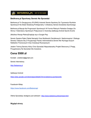 BetArena.pl Sportowy Serwis Na Sprzedaż BetArena.pl To Dwujęzyczny (PL/ENG) Autorski Serwis Sportowy Do Typowania Wyników Sportowych Na Skale Światową.Profesjonalny I Unikatowy Serwis Doradztwa Sportowego. BetArena.pl Bazuje Na Prognozach Sportowych W Formie Płatnych Pakietów Dostępu Do Strony I Kalendarzu Sportowym Połączonym Z Autorską Aplikacją Android Sports Events (Możliwa Wersja Płatna)Znajduje się w Google Play Serwis Zawiera Pełen Pakiet Narzędzi Oraz Możliwośći Zarobkowych. Nadzorowanie I Obsługa Serwisu Odbywa Się Z Przyjaznego Panelu Administratora.Serwis Nie Wymaga Dużych Nakładów Finansowych Oraz Inwestycji Rozwojowych. Jestem Twórcą Serwisu Który Chce Sprzedać Niepowtarzalny Projekt Stworzony Z Pasją. Przygotowany Na Sprzedaż Dla Inwestora. Cena 5500 zł Kontakt : [email protected] Serwis Internetowy http://betarena.pl Aplikacja Android https://play.google.com/store/apps/details?id=pl.betarena.sportsevents Facebook+Sklep https://www.facebook.com/Betarenapl Oferta Sprzedaży dostępna pod adresem http://www.betarena.pl/download.html Wygląd strony W Betarena.pl i aplikacji android Sports Events dominują kolory czarny i żółty.Czcionki są białe dzięki czemu wszystko jest czytelne. Takie połączenie kolorów jest bardzo stylowe i nie męczy oczu podczas dłuższego pobytu na portalu. Design serwisu podkreśla i uwydatnia jego profesjonalizm i rzetelność. Logo Nowoczesny kształt przypominający stadion z gwiazdami tworzącymi piłkę odrazu kojarzy się ze światem sportu. Złoto symbolizuje profity a wydobywające z spod kopuły gwiazd światło reflektorów nawiązuje do Unikalnośći Serwisu.Całość tworzy niepowtarzalne logo które jest wizytówką BetArena.pl.Logo jest objęte prawa autorskimi właściciela. Własne konto Dostępna jest możliwość założenia własnego konta w serwisie. Konto pozwala na przegląd typów oraz na typowanie wyników poszczególnych meczy i uczestnictwo w rozwoju serwisu. Po Zalogowaniu do Konta Użytkownik Otrzymuje Możliwość Dostępu do Prognoz Sportowych Możliwosć Dostępu do Oceny Prognoz Możliwość dodawania Wydarzeń Sportowych do Kalendarza Dodatkowo posiadając konto możemy zdobyć atrakcyjne nagrody oraz punkty. Funkcjonalności Na stronie dostępny jest newsletter dzięki któremu będziemy na bieżąco ze wszystkimi zmianami oraz nowościami. Możliwość Rekomendacji mailowej i Social Bar pozwala poinformować naszych znajomych i zaprosznie ich do odwiedzin.Betarena.pl jest dostępna w dwóch wersjach językowych angielskim i polskim.Aktywna Geolokalizacja pozwala zagranicznym klientom skorzystać automatycznie z strony w języku angielskim. Kalendarz wydarzeń W Kalendarzu sportowym znajdziemy wszystkie ważne wydarzenia sportowe. Nawigacja w kalendarzu jest banalnie prosta.Dostępny dla każdego na stronie oraz Mobilnie poprzez aplikację android Sports Events. Dodatkową funkcją Kalendarza jest możliwosć Dzielenia się z użytkownikami Betarena.pl i aplikacji Sports Events zbliżającymi wydarzeniami sportowymi oraz dodawanie własnych. Artykuły W zakładce artykuły znajdziemy pomocne i interesujące teksty. Teksty opisują poszczególne funkcje dostępne na stronie. Artykuły poddawane są ocenie innych użytkowników. Typowanie Typowanie meczy to bardzo ciekawa zabawa w której możemy zdobyć nagrody. W grze za poprawne wytypowanie wyników meczy otrzymujemy punkty. Możemy typować po prostu która drużyna wygra ale także możemy podać dokładny wynik meczu.. Typowanie jest w pełni darmowe. Aplikacja Android Sports Events Kalendarz sportowy ze wszystkimi ważnymi wydarzenia dostęny w zasięgu Twojej ręki i w jednym miejscu.Aplikacja Sports Events umożliwia przeglądanie wszystkich najważniejszych wydarzeń sportowych.Dostępne są rózne kategorie wydarzeń oraz możliwość widoku tygodnia,miesiąca bądź całego roku.Wydarzenia sportowe do Aplikacji moga dodawać również użytkownicy. Liga Typerów Liga typerów to świetna zabawa dla wszystkich pragnących rywalizacji. W zabawie mamy wyświetlonych 6 meczy i naszym zadaniem jest wytypowanie ich dokładnych wyników. Za typowanie otrzymujemy punkty. Za każdy trafiony typ otrzymujemy 1 punkt. Za wytypowanie prawidłowego rozstrzygnięcia także otrzymujemy 1 punkt. Za trafienie dokładnego wyniku otrzymujemy 2 punkty plus dodatkowo 10 punktów za każdy kolejny trafiony mecz. Wszystkie punkty oczywiście pod koniec sumują się. Za błędne wytypowanie nie otrzymujemy punktów. Typerfight to specjalny tryb w którym możemy zdobyć dodatkowo punkty rywalizując z innym graczem. Gdy obydwoje gracze trafią wybrane przez siebie spotkanie każdy z nich otrzyma po 10 punktów a gdy trafi tylko jeden to otrzymuje on aż 20 punktów drugi z kolei 0. Typy Serwis daje możliwość przeglądania statystyk typów w danym miesiącu. Mamy wyświetlone wszystkie mecze które się odbyły i statystyki odnośnie typowania użytkowników. Dostępne są także prognozy sportowe cechują się one bardzo dużą skutecznością.Skrypt posiada wiele funkcji i z pewnoscią usatysfakcjonuje najbardziej wymagających klientów.Rozbudowane Archiwum typów,Automatyczny Monitoring dodawania typów potwierdza w pełni rzetelność serwisu. Test typera Test typera jest to zbiór pytań które pozwalają określić jak dobrym typerem jesteś. W teście występują bardzo skomplikowane pytania które wymagają od nas specjalistycznej wiedzy. Na podstawie naszych odpowiedzi wystawiana jest ocena mówiąca o tym jak dobrymi typerami jesteśmy. Prediction Rate Prediction rate jest to specjalny tryb oceny typów w którym możemy wytypować wynik spotkania procentowo. Każdy użytkownik ma możliwość typowania danego wydrzenia sportowego.Typy Prediction rate są widoczne dla wszystkich zarejestrowanych użytkowników. Social Media Jesteśmy obecni także w mediach społecznościowych. Pierwszym serwisem na którym można nas znaleźć je