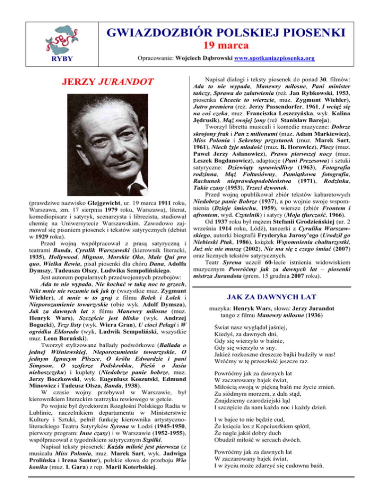 GWIAZDOZBIÓR POLSKIEJ PIOSENKI 19 marca RYBY Opracowanie: Wojciech Dąbrowski www.spotkaniazpiosenka.org JERZY JURANDOT (prawdziwe nazwisko Glejgewicht, ur. 19 marca 1911 roku, Warszawa, zm. 17 sierpnia 1979 roku, Warszawa), literat, komediopisarz i satyryk, scenarzysta i librecista, studiował chemię na Uniwersytecie Warszawskim. Zawodowo zajmował się pisaniem piosenek i tekstów satyrycznych (debiut w 1929 roku). Przed wojną współpracował z prasą satyryczną i teatrami Banda, Cyrulik Warszawski (kierownik literacki, 1935), Hollywood, Mignon, Morskie Oko, Małe Qui pro quo, Wielka Rewia, pisał piosenki dla chóru Dana, Adolfa Dymszy, Tadeusza Olszy, Ludwika Sempolińskiego. Jest autorem popularnych przedwojennych przebojów: Ada to nie wypada, Nie kochać w taką noc to grzech, Nikt mnie nie rozumie tak jak ty (wszystkie muz. Zygmunt Wiehler), A mnie w to graj z filmu Bolek i Lolek i Nieporozumienie towarzyskie (obie wyk. Adolf Dymsza), Jak za dawnych lat z filmu Manewry miłosne (muz. Henryk Wars), Szczęście jest blisko (wyk. Andrzej Bogucki), Trzy listy (wyk. Wiera Gran), U cioci Pelagi i W ogródku Eldorado (wyk. Ludwik Sempoliński, wszystkie muz. Leon Boruński). Tworzył stylizowane ballady podwórkowe (Ballada o jednej Wiśniewskiej, Nieporozumienie towarzyskie, O jednym Ignacym Pliszce, O królu Edwardzie i pani Simpson, O szoferze Podskrobku, Pieśń o Jasiu nieboszczyku) i kuplety (Niedobrze panie bobrze, muz. Jerzy Boczkowski, wyk. Eugeniusz Koszutski, Edmund Minowicz i Tadeusz Olsza, Banda, 1938). W czasie wojny przebywał w Warszawie, był kierownikiem literackim teatrzyku rewiowego w getcie. Po wojnie był dyrektorem Rozgłośni Polskiego Radia w Lublinie, naczelnikiem departamentu w Ministerstwie Kultury i Sztuki, pełnił funkcję kierownika artystycznoliterackiego Teatru Satyryków Syrena w Łodzi (1945-1950, pierwszy program: Inne czasy) i w Warszawie (1952-1955), współpracował z tygodnikiem satyrycznym Szpilki. Napisał teksty piosenek: Każda miłość jest pierwsza (z musicalu Miss Polonia, muz. Marek Sart, wyk. Jadwiga Prolińska i Irena Santor), polskie słowa do przeboju Wio koniku (muz. I. Gara) z rep. Marii Koterbskiej. Napisał dialogi i teksty piosenek do ponad 30. filmów: Ada to nie wypada, Manewry miłosne, Pani minister tańczy, Sprawa do załatwienia (reż. Jan Rybkowski, 1953, piosenka Chcecie to wierzcie, muz. Zygmunt Wiehler), Jutro premiera (reż. Jerzy Passendorfer, 1961, I wciąż się na coś czeka, muz. Franciszka Leszczyńska, wyk. Kalina Jędrusik), Mąż swojej żony (reż. Stanisław Bareja). Tworzył libretta musicali i komedie muzyczne: Dobrze skrojony frak i Pan z milionami (muz. Adam Markiewicz), Miss Polonia i Sekretny przystanek (muz. Marek Sart, 1961), Niech żyje młodość (muz. B. Horowicz), Plecy (muz. Paweł Jerzy Asłanowicz), Prawo pierwszej nocy (muz. Leszek Bogdanowicz), adaptacje (Pani Prezesowa) i sztuki satyryczne: Dziewiąty sprawiedliwy (1963), Fotografia rodzinna, Mąż Fołtasiówny, Pamiątkowa fotografia, Rachunek nieprawdopodobieństwa (1971), Rodzinka, Takie czasy (1953), Trzeci dzwonek. Przed wojną opublikował zbiór tekstów kabaretowych Niedobrze panie Bobrze (1937), a po wojnie swoje wspomnienia (Dzieje śmiechu, 1959), wiersze (zbiór Frontem i afrontem, wyd. Czytelnik) i satyry (Moja tfurczość, 1966). Od 1937 roku był mężem Stefanii Grodzieńskiej (ur. 2 września 1914 roku, Łódź), tancerki z Cyrulika Warszawskiego, autorki biografii Fryderyka Jarosy’ego (Urodził go Niebieski Ptak, 1986), książek Wspomnienia chałturzystki, Już nic nie muszę (2002), Nie ma się z czego śmiać (2007) oraz licznych tekstów satyrycznych. Teatr Syrena uczcił 60-lecie istnienia widowiskiem muzycznym Powróćmy jak za dawnych lat – piosenki mistrza Jurandota (prem. 15 grudnia 2007 roku). JAK ZA DAWNYCH LAT muzyka: Henryk Wars, słowa: Jerzy Jurandot tango z filmu Manewry miłosne (1936) Świat nasz wyglądał jaśniej, Kiedyś, za dawnych dni, Gdy się wierzyło w baśnie, Gdy się wierzyło w sny. Jakież rozkoszne dreszcze bajki budziły w nas! Wróćmy w tę przeszłość jeszcze raz. Powróćmy jak za dawnych lat W zaczarowany bajek świat, Miłością swoją w piękną baśń me życie zmień. Za siódmym morzem, z dala stąd, Znajdziemy czarodziejski ląd I szczęście da nam każda noc i każdy dzień. I w bajce to nie będzie cud, Że księcia los z Kopciuszkiem splótł, Że nagle jakiś dobry duch Obudził miłość w sercach dwóch. Powróćmy jak za dawnych lat W zaczarowany bajek świat, I w życiu może zdarzyć się cudowna baśń. Gwiazdozbiór polskiej piosenki – Jerzy Jurandot NIE KOCHAĆ W TAKĄ NOC TO GRZECH Muzyka: Zygmunt Wiehler, słowa: Jerzy Jurandot Można zamknąć serce przed miłością I uczynić najsilniejszą z twierdz. W taką noc ktoś jakby więzy rozciął, Miłość wchodzi w taka noc do serc. Czy dzień, czy wiek cię znam, To przecież rzecz obojętna. Przyjemnie z sobą nam W tę dziwną pijaną noc. Nie kochać w taką noc to grzech, Gdy sercu serca brak. Bez tego pusty dźwięk ma śmiech I wino traci smak. Nie kochać w taką noc to grzech, Kochajmy póki czas, Niech miłość wejdzie w krew i myśl, Niech porwie dziś i nas! Nie kochać w taką noc to grzech, Gdy tęsknią serca dwa, Gdy ktoś miłości wart jak ty, Ktoś o niej śni, jak ja. Świat zatonął w księżycowej ciszy, Nad głowami mlecznej drogi szlak, Noc jest blisko, noc miłością dyszy, Serce w piersi tłucze się jak ptak. Nie kochać w taką noc...