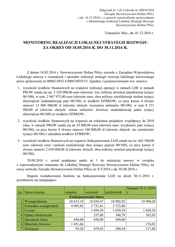 Załącznik nr 1 do Uchwały nr XIII/6/2016 Zarządu Stowarzyszenia Dolina Pilicy z dn. 14.12.2016 r. w sprawie zatwierdzenia sprawozdania z Monitoringu realizacji Lokalnej Strategii Rozwoju Stowarzyszenia Dolina Pilicy Tomaszów Maz., dn. 01.12.2016 r. MONITORING REALIZACJI LOKALNEJ STRATEGII ROZWOJU ZA OKRES OD 18.05.2016 R. DO 30.11.2016 R. Z dniem 18.05.2016 r. Stowarzyszenie Dolina Pilicy zawarło z Zarządem Województwa Łódzkiego umowę o warunkach i sposobie realizacji strategii rozwoju lokalnego kierowanego przez społeczność nr 00002-6933-UM0510019/15. Zgodnie z postanowieniami ww. umowy: 1. wysokość środków finansowych na wsparcie realizacji operacji w ramach LSR w ramach PROW ustala się na: 3 250 000,00 euro (słownie: trzy miliony dwieście pięćdziesiąt tysięcy 00/100), w tym: 2 067 975,00 euro (słownie euro: dwa miliony sześćdziesiąt siedem tysięcy dziewięćset siedemdziesiąt pięć 00/100) ze środków EFRROW, co przy kursie 4 zł/euro stanowi 13 000 000,00 zł (słownie złotych: trzynaście milionów 00/100), w tym 8 271 900,00 zł (słownie złotych: osiem milionów dwieście siedemdziesiąt jeden tysięcy dziewięćset 00/100) ze środków EFRROW; 2. wysokość środków finansowych na wsparcie na wdrażanie projektów współpracy do 2018 roku, w ramach PROW ustala się na 35 000,00 euro (słownie euro: trzydzieści pięć tysięcy 00/100), co przy kursie 4 zł/euro stanowi 140 000,00 zł (słownie złotych: sto czterdzieści tysięcy 00/100) z udziałem środków EFRROW; 3. wysokość środków finansowych na wsparcie funkcjonowania LGD ustala się na: 662 500,00 euro (słownie euro: sześćset sześćdziesiąt dwa tysiące pięćset 00/100), co przy kursie 4 zł/euro stanowi 2 650 000,00 zł (słownie złotych: dwa miliony sześćset pięćdziesiąt tysięcy 00/100). 29.08.2016 r. został podpisany aneks nr 1 do niniejszej umowy w związku z wprowadzonymi zmianami do Lokalnej Strategii Rozwoju Stowarzyszenia Dolina Pilicy na mocy uchwały Zarządu Stowarzyszenia Dolina Pilicy nr X/1/2016 z dn. 03.08.2016 r. Stopień wydatkowania budżetu na funkcjonowanie LGD na dzień 30.11.2016 r. przedstawia się następująco: Lp. Nazwa kosztu 1 2 3 4 5 6 7 Wynagrodzenia Pochodne wynagrodzeń Czynsz Opłaty telefoniczne Sprzątanie biura Materiały biurowe Delegacje listopad 30.11.2016 sierpień wrzesień październik r. Funkcjonowanie biura 20 633,18 18 856,47 18 902,92 19 908,20 4 095,82 3 731,41 3 723,06 1 039,39 1 039,39 1 039,39 337,08 340,79 182,03 450,00 450,00 450,00 1 451,66 176,01 95,28 479,93 290,54 517,88 8 9 10 11 12 13 14 Naprawa sprzętu biurowego Sprzęt biurowy Meble biurowe Szkolenie dla pracowników Szkolenia bhp Abonament Omikron Gadżety promocyjne Razem 2 054,10 12 214,00 3 974,99 2 162,00 1 000,00 800,00 46,00 2 388,00 50,00 1 476,00 35 231,03 27 856,28 37 010,70 399,75 24 657,26 Zgodnie z planem szkoleń dla członków organu decyzyjnego i pracowników biura LGD zostało przeszkolonych: w terminie 23 sierpnia - 5 pracowników biura z zakresu oceny wniosków w generatorze on-line w wymiarze 7 godzin szkoleniowych /szkolenie finansowane w ramach PROW 2014-2020/; w dniach 14-16 września – 2 pracowników biura z zakresu „Sprzedaż bezpośrednia w gospodarstwach agroturystycznych. Inkubatory przetwórstwa lokalnego” w wymiarze 24,5 godzin /szkolenie finansowane w ramach PROW 2014-2020/; 13-14 października - 2 pracowników biura z zakresu: procedury wniosków grantowych – ocena formalna i merytoryczna, umowa grantowa, procedury wniosków poza grantowych, warsztatów zmiany procedur grantowych w wymiarze 4 godzin /szkolenie finansowane z PROW 2014-2020/; w terminie 14-16 listopada - 3 pracowników biura z zakresu „Biznesplan dla operacji związanych z podejmowaniem lub rozwijaniem działalności gospodarczej” w wymiarze 23,5 godzin szkoleniowych /szkolenie finansowane w ramach PROW 2014-2020/ ; w terminie 28-30 listopada – 2 pracowników biura z zakresu „Budowa zintegrowanych produktów turystyki wiejskiej (programów turystycznych) w ramach realizacji LSR” w wymiarze 21 godzin szkoleniowych /szkolenie finansowane w ramach PROW 20142020/. Ponadto, w dniach : 23-25 maja – 4 pracowników biura uczestniczyło w szkoleniu w zakresie: „Metodyka doradztwa, wsparcie przy opracowaniu projektu, wniosku o przyznanie pomocy oraz opracowaniu biznesplanu” w wymiarze 22 godzin szkoleniowych /szkolenie współfinansowane ze środków Krajowego Funduszu Szkoleniowego oraz środków własnych LGD/; 31 maja - 1 pracownik biura uczestniczył w szkoleniu „Jak utworzyć podmiot ekonomii społecznej – aspekty prawno-księgowe” /udział w szkoleniu bezpłatny/; 6-8 czerwca - 4 pracowników biura uczestniczyło w szkoleniu w zakresie: „Organizacja pracy i komunikacja w procesie wdrażania LSR” w wymiarze 23 godzin szkoleniowych /szkolenie współfinansowane ze środków Krajowego Funduszu Szkoleniowego oraz środków własnych LGD/; 15-16 czerwca – 2 pracowników biura uczestniczyło w szkoleniu w zakresie: „Procedury wniosków grantowych, ocena formalna i merytoryczna, ocena Rady, umowa o powierzenie grantu” /szkolenie finansowane ze środków własnych LGD/; 28 października - 2 pracowników biura uczestniczyło w szkoleniu „Realizacja projektów w ramach Osi VIII i IX Regionalnego Programu Operacyjnego Województwa Łódzkiego na lata 2014-2020" w wymiarze 8 h /udział w szkoleniu bezpłatny/; 10 listopada - 3 pracowników biura uczestniczyło w szkoleniu „Zasada równości szans i niedyskryminacji w kontekście realizacji projektów w ramach Osi VIII i IX Regionalnego Programu Operacyjnego Województwa Łódzkiego"/udział w szkoleniu bezpłatny/, 24 listopada – 3 pracowników biura uczestniczyło w szkoleniu „Przygotowanie projektów w ramach Osi VIII i IX Regionalnego Programu Operacyjnego Województwa Łódzkiego na lata 2014-2020” /udział w szkoleniu bezpłatny/. Z porad doradczych w zakresie założeń pr