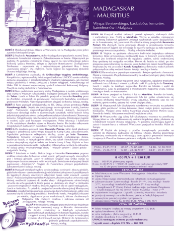 MADAGASKAR - MAURITIUS Wyspa Beniowskiego, baobabów, lemurów, kameleonów i Malgaszy Dzień 1 Zbiórka na lotnisku Okęcie w Warszawie, lot na Madagaskar przez jeden z portów lotniczych Europy. Dzień 2 Przylot do Antananarivo, stolicy Madagaskaru (popularnie zwanej Tana), załatwienie formalności wizowych. Zakwaterowanie w hotelu. Odpoczynek po podróży. Po południu zwiedzanie miasta, spacer do ruin królewskiego pałacu Królowej i pałacu Premiera. Wizyta w Ogrodzie Botanicznym i Zoologicznym Tsimbazaza - zapoznanie się z najważniejszymi gatunkami flory i fauny „Czerwonej Wyspy”. Dla chętnych, nocne wyjście do najgorętszej dyskoteki Oceanu Indyjskiego. Nocleg. Dzień 3 Całodzienna wycieczka, do Królewskiego Wzgórza Ambohimanga. Kompleks ten, wpisany na listę światowego dziedzictwa UNESCO zawiera obiekty zarówno powiązane z przedkolonialnymi władcami Madagaskaru, jak również miejsca pochówku i miejsca związane z kultem religijnym. Ambohimanga od blisko 500 lat stanowi najważniejszy symbol tożsamości kulturowej Malgaszy. Powrót na nocleg do hotelu w Antananarivo. Dzień 4 Rano podziwianie panoramy stolicy Madagaskaru z punktu widokowego oraz wizyta w Muzeum Andafivaratra. Następnie przejazd na lotnisko i przelot do Tulear. Lunch w Tulear. Po południu przejazd w kierunku Ranohiry przez las Zombitse, przystanek na podziwianie miejscowych baobabów, zwiedzanie grobowców Mohafaly. Późnym popołudniem przyjazd do hotelu, kolacja, nocleg. Dzień 5 Rano przejazd półciężarówką na klif. Dalsza piesza penetracja Parku Narodowego Isalo. Dojście do porażającego swym ogromem i urodą „kanionu małp”. Podziwianie nieprawdopodobnych formacji skalnych, tworzących księżycowe dziwolągi skalne o zwariowanych kształtach, wśród których rosną jedynie tutaj spotykane aloesy: pachypodium rosulatum i aloeisaloensis. Obserwacja lemurów. Fotografowanie dziwów natury na różne sposoby. Orzeźwiające kąpiele w wodnej oazie pod huczącym wodospadem. Pełna rekreacja i nabieranie sił. Po rustykalnym obiedzie spacer w kierunku hotelu. Po drodze odkrywanie niespotykanych karłowatych baobabów. Powrót do bazy na nocleg. Dzień 6 Po śniadaniu przejazd przez Horombe Plateau, które dzieli płaskowyż malgaski i południową cześć wyspy. Dojazd do Camp Catta, zakwaterowanie. Popołudnie poświęcone odkrywaniu okolicy, spacer po lesie Tsaranoro. Podglądanie lemurów żerujących w promieniach wschodzącego słońca. Spacer po lasach, w których gołym okiem, bez szkieł i binokularów zobaczyć można niespotykaną nigdzie indziej na świecie faunę i florę. Wyjście w busz w poszukiwaniu lemurów catta - najbardziej zbliżonych w ewolucji do człowieka. Po kolacji próba wycieczkowego chóru - wieczór tańców i pieśni polsko malgaskich. Nocleg. Dzień 7 Śniadanie w hotelu. Dalsza droga w kierunku Fianarantsoa poprzez urokliwe miasteczko Ambalavao wśród winnic, pól papirusowych, niezwykłych grot i formacji górskich. Lunch w pobliskiej knajpce oraz krótka wizyta na miejscowym bazarze znanym z roślin leczniczych. Zwiedzanie tradycyjnej fabryki papirusowej „Antaimaro’s”. Przyjazd do Fianarantsoa późnym popołudniem. Zakwaterowanie i kolacja, nocleg. Dzień 8 Przejazd wśród jedynych w swoim rodzaju wzniesień i zboczy górskich, gdzie kolor rdzawo - czerwony dominuje wśród zieleni pól ryżowych przyklejonych do łagodnych zboczy, otoczonych olbrzymim lasem roślin zwanych „uszami słonia”. Podziwianie piętrowych chat Malgaszów, zbudowanych z czerwonej cegły błotnej, możliwość zajrzenia do środka chaty i sfotografowania uśmiechniętej od ucha do ucha gospodyni. Krótki postój w „Zafimary arts shop” w Ambositra - pracowni oryginalnych rzeźb w drewnie, typowych dla tej części Madagaskaru. Lunch w Ambositra. Po południu przejazd w kierunku dawnej stacji klimatycznej Antsirabe, niegdyś bardzo znanego, urokliwego kurortu francuskiego, gdzie czas zatrzymał się na kolonialnej przeszłości. Transfer do hotelu. Przejażdżka rikszami po mieście, ciągnionymi przez muskularnych, dobrze zbudowanych Malgaszów (dla chętnych możliwa i zalecana zamiana ról z Malgaszem). Kolacja i nocleg. Dzień 9 Po śniadaniu przejazd przez malownicze krajobrazy płaskowyżu czerwonej wyspy w kierunku Antananarivo. Po drodze odwiedziny w lokalnych wytwórniach rzemieślniczych produkujących słomiane kapelusze, wyroby z rogów i wyroby hafciarskie. Lunch i wizyta w tradycyjnej wytwórni aluminiowych naczyń. Dotarcie do Antananarivo w późnych godzinach popołudniowych. Kolacja, nocleg. 72 Dzień 10 Przejazd wzdłuż zielonych poletek ryżowych, ciekawych dolin i wschodniego lasu. Postój w Mandraka. Wizyta w ośrodku, zajmującym się ochroną niektórych gatunków zwierząt wschodnich lasów deszczowych, m. in. kameleonów, żab, jaszczurek. Po obiedzie dalszy przejazd do Rezerwatu Perinet. Dla chętnych nocna penetracja dżungli w poszukiwaniu lemurów i innych nocnych żyjątek lub też okazja do spaceru trzymając za rękę naprędce poznanego towarzysza podróży… Nocleg w hotelu Andasibe. Dzień 11 Wyjście na spotkanie olbrzymich Indri-Indri (największa odmiana lemurów), które przypominają niedźwiadki koala w kolorach czarno-białych. Perinet jest świetnym miejscem do oglądania ptaków, wśród endemicznej flory spotkamy też malgaskie orchidee. Powrót do hotelu na obiad, po nim przeprawa przez dziewiczy las do celu, jakim będzie tym razem Kanał Pangalan. Majestatyczny rejs po wodach Kanału Pangalan oraz łańcuszku małych jeziorek połączonych ze sobą wodami Kanału. Kolacja i nocleg w hotelu. Dzień 12 Rano wizyta w prywatnym rezerwacie i kolejne spotkanie z lemurami. Piknik w rezerwacie. Po południu czas wolny na odpoczynek przy plaży. Kolacja w hotelu. Nocleg. Dzień 13 Po śniadaniu dalszy rejs przez kanał Pangalanes, oglądanie tropikalnej roślinności oraz lokalnych wiosek z pokładu barki. Przypł