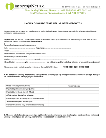 4 1 -2 0 0 So s n o w ie c , u l. P iłsu d s k ie g o 8 UMOWA O ŚWIADCZENIE USŁUG INTERNETOWYCH Umowę uważa się za zawartą z chwilą uznania rachunku bankowego Usługodawcy w wysokości odpowiadającej kwocie wskazanej przez operatora. ImpresjaNet s.c. Michał Dudek & Aleksander Brzeziński z siedzibą w Sosnowcu ul. Piłsudskiego 8, NIP: 6443437851 zwanym w dalszej części umowy Usługodawcą a Panem/Panią zwanym dalej Abonentem: Imię: ..................................................... Nazwisko: ..................................................... Pesel: …............................................ Adres miejsca świadczenia usługi/Zakończenia sieci: …........................................................................................................... Adres stałego zameldowania: …................................................................................................................................................ telefon. ….............................................. e-mail:…..........………................…......... identyfikator: .................. pin: …............................. ; do wirtualnego biura obsługi klienta: www.bok.impresjanet.pl Abonament płatny na indywidualny nr konta w Banku BZ WBK S.A.: _ _ 1090 0004 9261 0000 0000 _ _ _ _ 1. Na podstawie umowy Abonenckiej Usługodawca zobowiązuje się do zapewnienia Abonentowi stałego dostępu do sieci internet na następujących warunkach: Okres obowiązywania umowy: nieokreślony Prędkość pobierania danych [Mb/s]: Prędkość wysyłania danych [Mb/s]: CENA usługi (brutto) za miesiąc: Cena częściowa w miesiącu podpisania umowy Jednorazowa opłata instalacyjna: Standardowa cena przy umowie bezterminowej: 2. Abonent oświadcza że zapoznał się z ogólnymi warunkami umowy oraz że akceptuje postanowienia niniejszej umowy i przystępuje do Umowy Abonenckiej , na zasadach w niej określonych. OGÓLNE WARUNKI UMOWY ABONENCKIEJ §1 Zobowiązania Usługodawcy 1. Usługodawca zobowiązuje się do: a) świadczenia usług internetowych, w tym do zapewnienia Abonentowi stałego dostępu do sieci internet poprzez sieć lokalną zestawioną pomiędzy węzłem dostępowym a wskazanym przez Abonenta lokalem. b) doprowadzenia do wskazanego lokalu kabla przyłączeniowego; c) jednorazowego skonfigurowania komputera do korzystania z internetu. d) usunięcia przerwy w dostępie do internetu powstałej z winy Usługodawcy w ciągu 24 godzin od chwili zgłoszenia. e) usunięcia odpłatnie na życzenie Abonenta przerwy w dostępie do internetu powstałej z winy Abonenta w ciągu 48 godzin od chwili zgłoszenia za wyjątkiem sobót, niedziel i świąt. 2. W przypadku przerwy technicznej dłuższej niż 24 godziny Abonent uprawniony jest do zgłoszenia pisemnego wniosku o obniżenie abonamentu o 1/30 abonamentu za każdy dzień przerwy. Po zaakceptowaniu wniosku przez usługodawcę abonament zostanie odpowiednio obniżony. §2 Opłaty 1. Abonent zobowiązuje się do uiszczania co miesiąc opłaty za zapewnienie dostępu do internetu. 2. Za okres rozliczeniowy przyjmuje się miesiąc kalendarzowy z terminem płatności do piętnastego dnia każdego miesiąca. Wpłaty należy dokonać na przyznany Abonentowi indywidualny nr konta bankowego który został wyszczególniony na pierwszej stronie umowy. 3. W przypadku gdy opłata za świadczoną usługę nie wpłynie na indywidualne konto klienta do końca danego miesiąca Abonentowi może zostać założona blokada dostępu do internetu, automatycznie przez system bez konieczności uprzedniego wzywania do zapłaty zaległego abonamentu. Ponowne podłączenie do sieci internetowej może nastąpić po zapłacie zaległego abonamentu. 4. Wartość ulgi przyznanej Abonentowi, który zawarł Umowę Abonencką na czas określony stanowi iloczyn miesięcy, na który została zawarta Umowa Abonencka na czas określony oraz różnicy pomiędzy ceną Usługi w przypadku zawarcia Umowy Abonenckiej na czas określony, a kwotą, którą Abonent zobowiązany byłby uiścić, gdyby korzystał z Usługi na podstawie umowy zawartej na czas nieokreślony. 5. W przypadku jednostronnego rozwiązania Umowy Abonenckiej, zawartej na czas określony przez Abonenta lub przez Dostawcę usług z winy Abonenta przed upływem okresu obowiązywania Umowy Abonenckiej zawartej na czas określony, Abonent będzie zobowiązany do zapłaty kwoty w wysokości ulgi przyznanej Abonentowi w związku z zawarciem Umowy Abonenckiej na czas określony, pomniejszonej o proporcjonalną jej wartość za okres od dnia zawarcia Umowy Abonenckiej do dnia jej rozwiązania. 6. Abonentowi udostępniana jest historia operacji finansowych oraz faktury po wpisaniu swojego identyfikatora oraz pinu w wirtualnym biurze obsługi klienta dostępnym pod adresem www.bok.impresjanet.pl 7. Udostępnianie internetu osobom trzecim znajdującym się poza lokalem abonenta podlega karze umownej równej 500PLN §3 Odpowiedzialność 1. Usługodawca nie ponosi odpowiedzialności za: a) przerwę lub nienależyte wykonanie usługi spowodowane poprzez działanie siły wyższej czyli nadzwyczajnego zdarzenia zewnętrznego niemożliwego do przewidzenia i niemożliwego do zapobieżenia, mimo dołożenia najwyższej staranności np. katastrofalne działanie sił przyrody, wojna, strajki generalne, akty władzy publicznej, którym nie może przeciwstawić się jednostka itp. b) niewłaściwą ochronę danych w komputerze Abonenta, w szczególności za zabezpieczenie antywirusowe oraz ingerencję osób trzecich. c) treść i zawartość danych przechowywanych w komputerze Abonenta oraz transmitowanych przez Abonenta za pomocą sieci usługodawcy i sieci internet, jak również straty wynikłe z zastosowania lub niemożności zastosowania informacji lub oprogramowania uzyskanego tą drogą. d) uszkodzeń sprzętu wynikających z nieodłączenia urządzenia z sieci elektrycznej oraz internetowej w czasie trwania wyładowań 