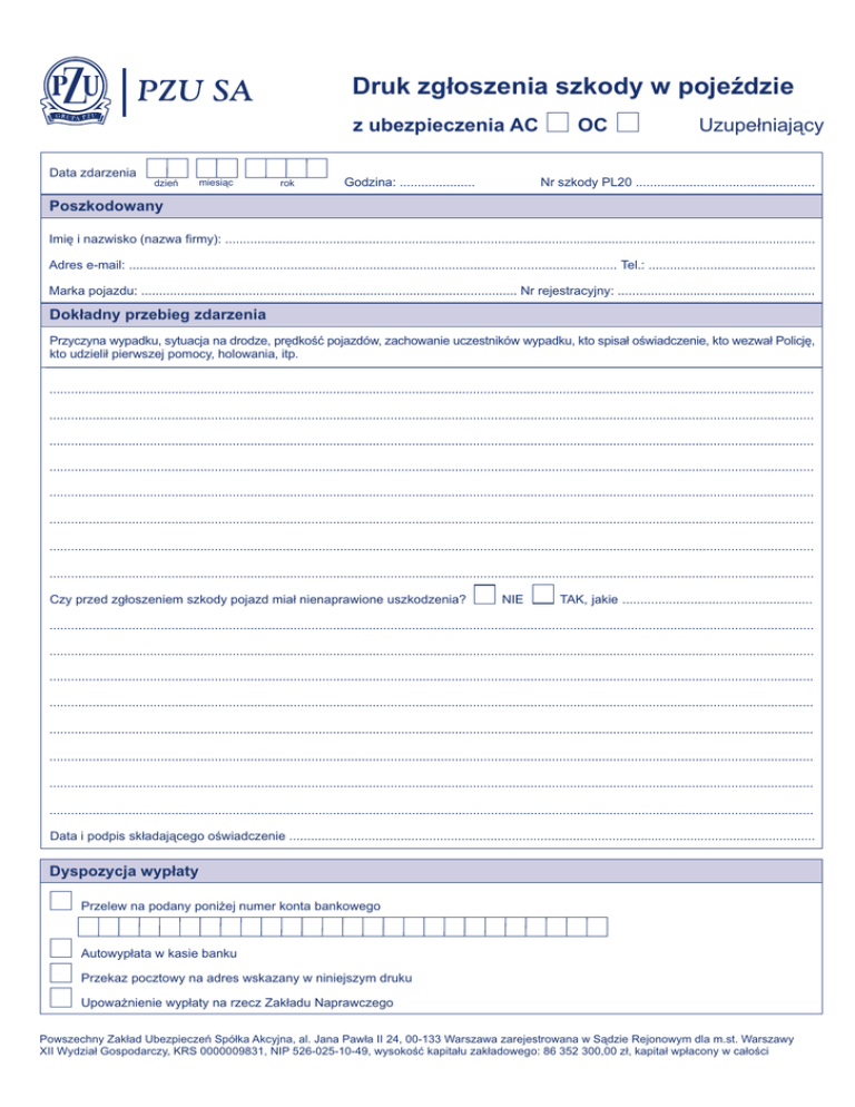Druk zgłoszenia szkody w pojeździe z ubezpieczenia AC Data zdarzenia dzień miesiąc rok Godzina: ..................... OC Uzupełniający Nr szkody PL20 .................................................. Poszkodowany Imię i nazwisko (nazwa firmy): ..................................................................................................................................................................... Adres e-mail: ........................................................................................................................................ Tel.: .............................................. Marka pojazdu: ......................................................................................................... Nr rejestracyjny: ....................................................... Dokładny przebieg zdarzenia Przyczyna wypadku, sytuacja na drodze, prędkość pojazdów, zachowanie uczestników wypadku, kto spisał oświadczenie, kto wezwał Policję, kto udzielił pierwszej pomocy, holowania, itp. ..................................................................................................................................................................................................................... ..................................................................................................................................................................................................................... ..................................................................................................................................................................................................................... ..................................................................................................................................................................................................................... ..................................................................................................................................................................................................................... ..................................................................................................................................................................................................................... ..................................................................................................................................................................................................................... ..................................................................................................................................................................................................................... Czy przed zgłoszeniem szkody pojazd miał nienaprawione uszkodzenia? NIE TAK, jakie ..................................................... ..................................................................................................................................................................................................................... ..................................................................................................................................................................................................................... ..................................................................................................................................................................................................................... ..................................................................................................................................................................................................................... ..................................................................................................................................................................................................................... ..................................................................................................................................................................................................................... ..................................................................................................................................................................................................................... ..................................................................................................................................................................................................................... Data i podpis składającego oświadczenie ................................................................................................................................................... Dyspozycja wypłaty Przelew na podany poniżej numer konta bankowego Autowypłata w kasie banku Przekaz pocztowy na adres wskazany w niniejszym druku Upoważnienie wypłaty na rzecz Zakładu Naprawczego Powszechny Zakład Ubezpieczeń Spółka Akcyjna, al. Jana Pawła II 24, 00-133 Warszawa zarejestrowana w Sądzie Rejonowym dla m.st. Warszawy XII Wydział Gospodarczy, KRS 0000009831, NIP 526-025-10-49, wysokość kapitału zakładowego: 86 352 300,00 zł, kapitał wpłacony w całości Oświadczenie właściciela pojazdu poszkodowanego Oświadczam, że: 1) Pojazd został użyty w dniu zdarzenia za moją zgodą i wiedzą. 2) Z tytułu zaistniałej szkody nie otrzymałem(am) odszkodowania z innego zakładu ubezpieczeń i nie ubiegam się o odszkodowanie w innym zakładzie ubezpieczeń lub innej jednostce PZU SA. 3) Jestem/nie jestem* płatnikiem podatku VAT. 4) Po zakupie pojazdu dokonałem(am)/nie dokonałem(am)* odliczenia podatku VAT naliczonego przy jego zakupie. 5) Samochód, w którym powstała szkoda jest/nie jest* ubezpieczony w innym zakładzie ubezpieczeń; w przypadku zaznaczenia odpowiedzi jest", na podstawie przepisu art. 8241 § 2 kodeksu cywilnego, prosimy o wypełnienie poni
