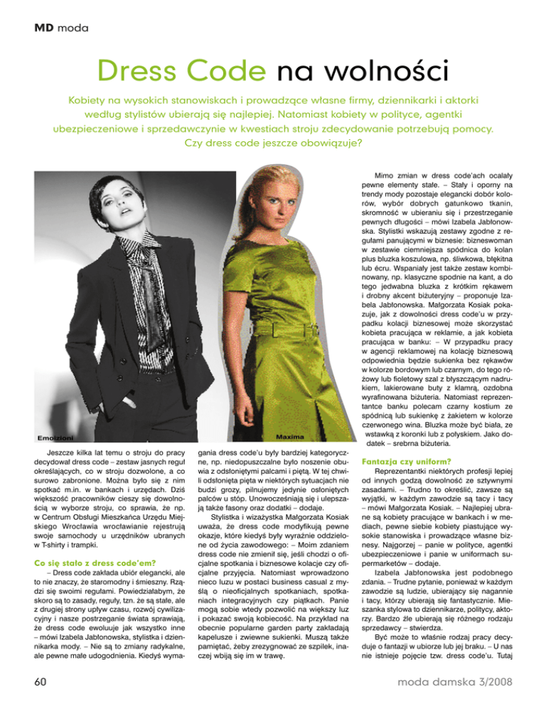 MD moda Dress Code na wolnoÊci Kobiety na wysokich stanowiskach i prowadzàce w∏asne firmy, dziennikarki i aktorki wed∏ug stylistów ubierajà si´ najlepiej. Natomiast kobiety w polityce, agentki ubezpieczeniowe i sprzedawczynie w kwestiach stroju zdecydowanie potrzebujà pomocy. Czy dress code jeszcze obowiàzuje? Emoizioni Jeszcze kilka lat temu o stroju do pracy decydowa∏ dress code – zestaw jasnych regu∏ okreÊlajàcych, co w stroju dozwolone, a co surowo zabronione. Mo˝na by∏o si´ z nim spotkaç m.in. w bankach i urz´dach. DziÊ wi´kszoÊç pracowników cieszy si´ dowolnoÊcià w wyborze stroju, co sprawia, ˝e np. w Centrum Obs∏ugi Mieszkaƒca Urz´du Miejskiego Wroc∏awia wroc∏awianie rejestrujà swoje samochody u urz´dników ubranych w T-shirty i trampki. Co si´ sta∏o z dress code’em? – Dress code zak∏ada ubiór elegancki, ale to nie znaczy, ˝e staromodny i Êmieszny. Rzàdzi si´ swoimi regu∏ami. Powiedzia∏abym, ˝e skoro sà to zasady, regu∏y, tzn. ˝e sà sta∏e, ale z drugiej strony up∏yw czasu, rozwój cywilizacyjny i nasze postrzeganie Êwiata sprawiajà, ˝e dress code ewoluuje jak wszystko inne – mówi Izabela Jab∏onowska, stylistka i dziennikarka mody. – Nie sà to zmiany radykalne, ale pewne ma∏e udogodnienia. KiedyÊ wyma- 60 Maxima gania dress code’u by∏y bardziej kategoryczne, np. niedopuszczalne by∏o noszenie obuwia z ods∏oni´tymi palcami i pi´tà. W tej chwili ods∏oni´ta pi´ta w niektórych sytuacjach nie budzi grozy, pilnujemy jedynie os∏oni´tych palców u stóp. UnowoczeÊniajà si´ i ulepszajà tak˝e fasony oraz dodatki – dodaje. Stylistka i wiza˝ystka Ma∏gorzata Kosiak uwa˝a, ˝e dress code modyfikujà pewne okazje, które kiedyÊ by∏y wyraênie oddzielone od ˝ycia zawodowego: – Moim zdaniem dress code nie zmieni∏ si´, jeÊli chodzi o oficjalne spotkania i biznesowe kolacje czy oficjalne przyj´cia. Natomiast wprowadzono nieco luzu w postaci business casual z myÊlà o nieoficjalnych spotkaniach, spotkaniach integracyjnych czy piàtkach. Panie mogà sobie wtedy pozwoliç na wi´kszy luz i pokazaç swojà kobiecoÊç. Na przyk∏ad na obecnie popularne garden party zak∏adajà kapelusze i zwiewne sukienki. Muszà tak˝e pami´taç, ˝eby zrezygnowaç ze szpilek, inaczej wbijà si´ im w traw´. Mimo zmian w dress code’ach ocala∏y pewne elementy sta∏e. – Sta∏y i oporny na trendy mody pozostaje elegancki dobór kolorów, wybór dobrych gatunkowo tkanin, skromnoÊç w ubieraniu si´ i przestrzeganie pewnych d∏ugoÊci – mówi Izabela Jab∏onowska. Stylistki wskazujà zestawy zgodne z regu∏ami panujàcymi w biznesie: bizneswoman w zestawie ciemniejsza spódnica do kolan plus bluzka koszulowa, np. Êliwkowa, b∏´kitna lub écru. Wspania∏y jest tak˝e zestaw kombinowany, np. klasyczne spodnie na kant, a do tego jedwabna bluzka z krótkim r´kawem i drobny akcent bi˝uteryjny – proponuje Izabela Jab∏onowska. Ma∏gorzata Kosiak pokazuje, jak z dowolnoÊci dress code’u w przypadku kolacji biznesowej mo˝e skorzystaç kobieta pracujàca w reklamie, a jak kobieta pracujàca w banku: – W przypadku pracy w agencji reklamowej na kolacj´ biznesowà odpowiednia b´dzie sukienka bez r´kawów w kolorze bordowym lub czarnym, do tego ró˝owy lub fioletowy szal z b∏yszczàcym nadrukiem, lakierowane buty z klamrà, ozdobna wyrafinowana bi˝uteria. Natomiast reprezentantce banku polecam czarny kostium ze spódnicà lub sukienk´ z ˝akietem w kolorze czerwonego wina. Bluzka mo˝e byç bia∏a, ze wstawkà z koronki lub z po∏yskiem. Jako dodatek – srebrna bi˝uteria. Fantazja czy uniform? Reprezentantki niektórych profesji lepiej od innych godzà dowolnoÊç ze sztywnymi zasadami. – Trudno to okreÊliç, zawsze sà wyjàtki, w ka˝dym zawodzie sà tacy i tacy – mówi Ma∏gorzata Kosiak. – Najlepiej ubrane sà kobiety pracujàce w bankach i w mediach, pewne siebie kobiety piastujàce wysokie stanowiska i prowadzàce w∏asne biznesy. Najgorzej – panie w polityce, agentki ubezpieczeniowe i panie w uniformach supermarketów – dodaje. Izabela Jab∏onowska jest podobnego zdania. – Trudne pytanie, poniewa˝ w ka˝dym zawodzie sà ludzie, ubierajàcy si´ nagannie i tacy, którzy ubierajà si´ fantastycznie. Mieszanka stylowa to dziennikarze, politycy, aktorzy. Bardzo êle ubierajà si´ ró˝nego rodzaju sprzedawcy – stwierdza. Byç mo˝e to w∏aÊnie rodzaj pracy decyduje o fantazji w ubiorze lub jej braku. – U nas nie istnieje poj´cie tzw. dress code’u. Tutaj moda damska 3/2008 ka˝dy ubiera si´ wed∏ug w∏asnych upodobaƒ. Bluzy z kapturem, zabawne T-shirty, d˝insy, trampki, japonki, pla˝owe sukienki: jednym s∏owem, na co tylko danego dnia ma si´ ochot´. Ka˝dy jest na swój sposób kreatywny – mówi Asia Krupa, kierownik postprodukcji w Alien Roessler Fx. – Nie ma stroju, na który nie mo˝na sobie pozwoliç. KtoÊ chce nosiç pomaraƒczowe dredy, prosz´ bardzo, ktoÊ wytatuowane r´ce i kolczyki, gdzie popadnie – te˝ nie ma z tym najmniejszego problemu. Nikt nawet nie próbuje wt∏oczyç grafika w garnitur, a producentki w garsonk´, bo oczywiste jest, ˝e takie zabiegi przynios∏yby wi´cej szkody ni˝ po˝ytku WyAncora jàtkiem mogà byç prezentacje i spotkania z nowymi klientami. Ale bardziej stonowany strój, czyli zamiast bluzy z kapturem np. koszula, dotyczy wy∏àcznie szefów czy accountów. Producenci, dyrektorzy kreatywni, graficy czy copywriterzy nawet w takich sytuacjach majà wolnà r´k´ i zapewniam, ˝e nikt nie ma do nich pretensji, ˝e prezentujà si´ na oficjalnym spotkaniu w T-shircie z bohaterem komiksu – dodaje. W przypadku oficjalnych okazji jedynie cz´Êç pracowników obowiàzujà pewne ograniczajàce swobod´, zasady. – mówi Asia Krupa. Joanna, prawniczka z Krakowa, nie mog∏aby sobie pozwoliç na podobnà dowolnoÊç. – Mój dress code jest w dwóch szafach – Êmieje si´. – Jedna