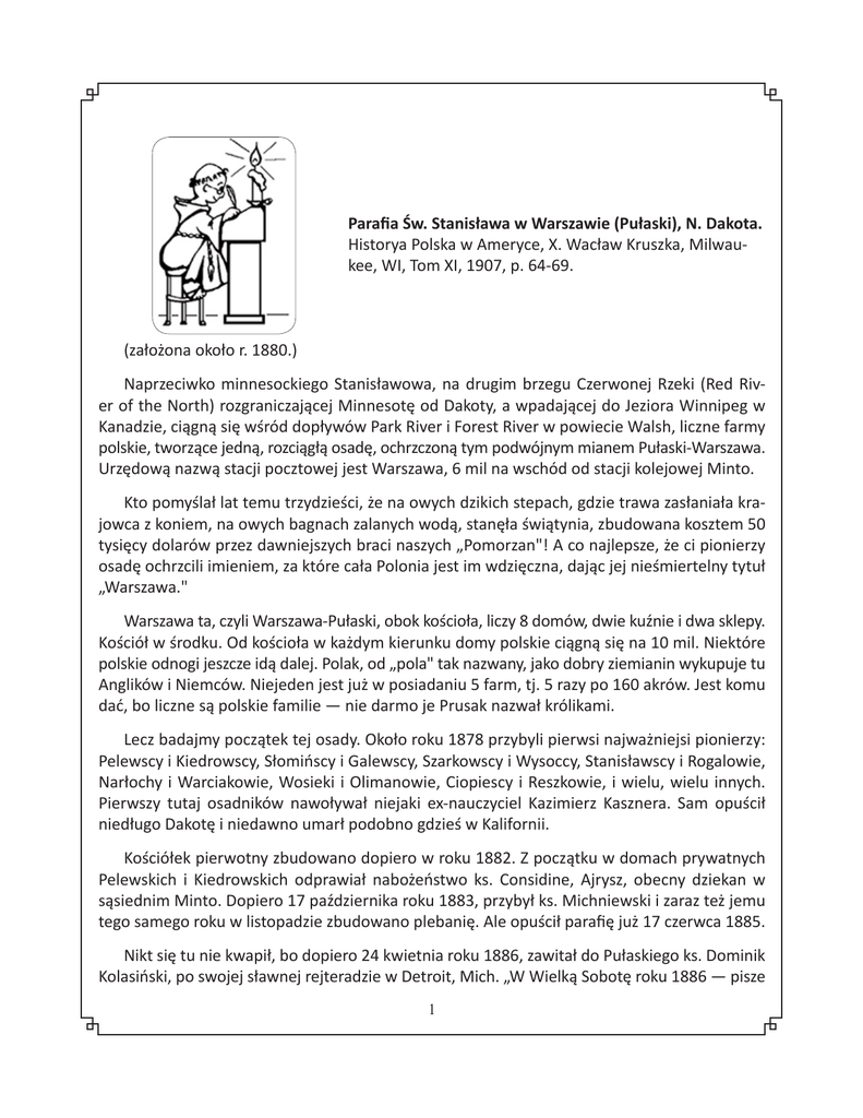 arafia Św. Stanisława w Warszawie (Pułaski), N. Dakota. P Historya Polska w Ameryce, X. Wacław Kruszka, Milwau- kee, WI, Tom XI, 1 907, p. 64-69. (założona około r. 1880.) Naprzeciwko minnesockiego Stanisławowa, na drugim brzegu Czerwonej Rzeki (Red River of the North) rozgraniczającej Minnesotę od Dakoty, a wpadającej do Jeziora Winnipeg w Kanadzie, ciągną się wśród dopływów Park River i Forest River w powiecie Walsh, liczne farmy polskie, tworzące jedną, rozciągłą osadę, ochrzczoną tym podwójnym mianem Pułaski-Warszawa. Urzędową nazwą stacji pocztowej jest Warszawa, 6 mil na wschód od stacji kolejowej Minto. Kto pomyślał lat temu trzydzieści, że na owych dzikich stepach, gdzie trawa zasłaniała krajowca z koniem, na owych bagnach zalanych wodą, stanęła świątynia, zbudowana kosztem 50 tysięcy dolarów przez dawniejszych braci naszych „Pomorzan"! A co najlepsze, że ci pionierzy osadę ochrzcili imieniem, za które cała Polonia jest im wdzięczna, dając jej nieśmiertelny tytuł „Warszawa." Warszawa ta, czyli Warszawa-Pułaski, obok kościoła, liczy 8 domów, dwie kuźnie i dwa sklepy. Kościół w środku. Od kościoła w każdym kierunku domy polskie ciągną się na 10 mil. Niektóre polskie odnogi jeszcze idą dalej. Polak, od „pola" tak nazwany, jako dobry ziemianin wykupuje tu Anglików i Niemców. Niejeden jest już w posiadaniu 5 farm, tj. 5 razy po 160 akrów. Jest komu dać, bo liczne są polskie familie — nie darmo je Prusak nazwał królikami. Lecz badajmy początek tej osady. Około roku 1878 przybyli pierwsi najważniejsi pionierzy: Pelewscy i Kiedrowscy, Słomińscy i Galewscy, Szarkowscy i Wysoccy, Stanisławscy i Rogalowie, Narłochy i Warciakowie, Wosieki i Olimanowie, Ciopiescy i Reszkowie, i wielu, wielu innych. Pierwszy tutaj osadników nawoływał niejaki ex-nauczyciel Kazimierz Kasznera. Sam opuścił niedługo Dakotę i niedawno umarł podobno gdzieś w Kalifornii. Kościółek pierwotny zbudowano dopiero w roku 1882. Z początku w domach prywatnych Pelewskich i Kiedrowskich odprawiał nabożeństwo ks. Considine, Ajrysz, obecny dziekan w sąsiednim Minto. Dopiero 17 października roku 1883, przybył ks. Michniewski i zaraz też jemu tego samego roku w listopadzie zbudowano plebanię. Ale opuścił parafię już 17 czerwca 1885. Nikt się tu nie kwapił, bo dopiero 24 kwietnia roku 1886, zawitał do Pułaskiego ks. Dominik Kolasiński, po swojej sławnej rejteradzie w Detroit, Mich. „W Wielką Sobotę roku 1886 — pisze 1 kronikarz z Minto — został z wielkim entuzjazmem przyjęty." (zobacz roczniki „Krytyki".) Ks. Kolasiński rozszerzył tutejszy kościół. Warszawa Dakocka — si parva licet componere magnis — była dla ks. Dom. Kolasińskiego tym, czym niegdyś była wyspa Elba dla Napoleona Wielkiego — była miejscem wygnania. Tu na tym wygnaniu układał on swoje plany na przyszłość; stąd kierował całym ruchem w Detroit, aż nareszcie w październiku roku 1888 opuścił to wygnanie i — jak Napoleon z Elby do Francji — powrócił w roli tryumfatora do Detroit. Jako następca w dakockiej Warszawie przybył w marcu roku 1889 ks. Tokarski, a opuścił parafię w październiku roku 1890. Dopiero znowu w kwietniu roku 1891 przybył tu ks. Grochowski. Ten usiłował wstępnym bojem wziąć parafię, bo nawet misję urządził przez tydzień. Stoczył liczne harce z rozlicznymi komitetami i ich prezydentami, ale ustąpił w marcu roku 1893. Już teraz nie tak długo trwało, a przyjechał 4 czerwca 1893 ks. Wawrzykowski, odjechał zaś w listopadzie roku 1895. Z tej częstej zmiany proboszczów widać, że i w tej parafii rządziło jakieś licho. Przy stanie majątkowym ludzi i energii niektórych księży, zrobiono atoli i tu więcej niż w innonarodowych parafiach w Dakocie całej. Polak chociaż się czubi, ale się modli. W roku 1896, nowy proboszcz ks. Gawłowicz zastał w Pułaski-Warszawie na 15 akrowej przestrzeni parafialnej kościółek dość okazały, drewniany, rozszerzony ze starego za ks. Dom. Kolasińskiego, starą plebanię postawioną za ks. Michniewskiego roku 1893 i plebanię nową zbudowaną za ks. Grochowskiego, i dwie stajnie, jedna przy starej, druga przy nowej plebanii. Trzeba wiedzieć, że stara plebania zbudowana była na 5 akrach po przeciwnej stronie linii, darowanych przez rodzinę Pelewsklch dla proboszcza, a nowa plebania na owych 10 akrach, gdzie pod kościół i cmentarz darował Ant. Hefta 5 akrów, a 5 sprzedał, a później pożałował tego, jak świadczą kroniki. Według starych komitetów wartość wzniesionych budowli parafialnych przedstawia się jak następuje: stara plebania $2,500 — pierwotny kościółek $1,500; rozszerzenie jego $3,000; nowa plebania i stajnia $4,500 — razem wszystko $11,500. Jak na owe stosunki farmerskie, zrobiono bardzo wiele do roku 1896. Dnia 3 czerwca wreszcie roku 1896 na proboszcza w Pułaski-Warszawie przybył ten, który miał przyjść podług odwiecznych wyroków Opatrzności, mianowicie ks. Franciszek Gawłowicz, kapłan ogólnie lubiany i szanowany, autor znakomitego dziełka „O Prawdziwej Religii”, w którym zawarł myśli tak głębokie jak morze, a tak wysokie jak niebo. Ks. Fr. Gawłowicz, którego własny jego biskup Stanley w Dakocie „opatrznościowym i cudownym" nazwał dla tego zakątka ziemi — urodził się 4 października roku 1854 w Galicji, studia ukończył w Bochni i Tarnowie, gdzie 22 lipca 1882 wyświecony został na kapłana. Jeździł szybko po diecezji, bo sam o to prosił. Po 5 latach wikariatu dano mu probostwo Olesno w diecezji Tarnowskiej, z którego po 6 latach zrezygnował dobrowolnie, bo go nazwano autonomista i chciano mu dać drugie probostwo w innym powiecie. Według świadectw miał sławę misjonarza. Przez 10 blisko lat dźwigał jarzmo pasterskie w tej parafii dakockiej, a przez ten czas głośno wołał i wykazywał, z której strony owieczkom jego niebezpieczeństwo g
