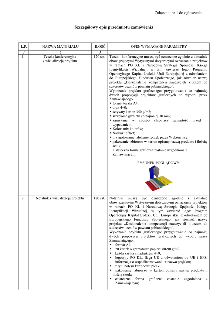 Załącznik nr 1 do ogłoszenia Szczegółowy opis przedmiotu zamówienia L.P. NAZWA MATERIAŁU ILOŚĆ OPIS/ WYMAGANE PARAMETRY 1 2 3 4 1. Teczka konferencyjna z wizualizacją projektu 120 szt. Teczki konferencyjne muszą być oznaczone zgodnie z aktualnie obowiązującymi Wytycznymi dotyczącymi oznaczania projektów w ramach PO KL i Narodową Strategią Spójności Księgą Identyfikacji Wizualnej, w tym zawierać logo: Programu Operacyjnego Kapitał Ludzki, Unii Europejskiej z odwołaniem do Europejskiego Funduszu Społecznego, jak również nazwę projektu „Doskonalenie kompetencji nauczycieli kluczem do sukcesów uczniów powiatu pabianickiego”. Wykonanie projektu graficznego: przygotowanie co najmniej dwóch propozycji projektów graficznych do wyboru przez Zamawiającego. format teczki A4; druk 4+0; sztywny karton 350 g/m2; szerokość grzbietu co najmniej 10 mm; zamykana w sposób chroniący zawartość przed wypadaniem; Kolor: mix kolorów; Nadruk: offset; przygotowanie: złożenie teczek przez Wykonawcę; pakowanie: zbiorczo w karton opisany nazwą produktu i ilością sztuk; Ostateczna forma graficzna zostanie uzgodniona z Zamawiającym. RYSUNEK POGLĄDOWY 2. Notatnik z wizualizacją projektu 120 szt. Notatniki muszą być oznaczone zgodnie z aktualnie obowiązującymi Wytycznymi dotyczącymi oznaczania projektów w ramach PO KL i Narodową Strategią Spójności Księgą Identyfikacji Wizualnej, w tym zawierać logo: Program Operacyjny Kapitał Ludzki, Unii Europejskiej z odwołaniem do Europejskiego Funduszu Społecznego, jak również nazwę projektu „Doskonalenie kompetencji nauczycieli kluczem do sukcesów uczniów powiatu pabianickiego”. Wykonanie projektu graficznego: przygotowanie co najmniej dwóch propozycji projektów graficznych do wyboru przez Zamawiającego. format A4; 20 kartek o gramaturze papieru 80-90 g/m2; każda kartka z nadrukiem 4+0; logotypy PO KL, flaga UE z odwołaniem do UE i EFS, informacja o współfinansowaniu + nazwa projektu; z tyłu notesu kartonowe plecki; pakowanie: zbiorczo w karton opisany nazwą produktu i ilością sztuk; ostateczna forma graficzna zostanie uzgodniona z Zamawiającym; RYSUNEK POGLĄDOWY 3. Długopis z logo projektu 120 szt. Długopisy muszą być oznaczone zgodnie z aktualnie obowiązującymi Wytycznymi dotyczącymi oznaczania projektów w ramach PO KL i Narodową Strategią Spójności Księgą Identyfikacji Wizualnej oraz zawierać logotypy: PO KL, Unii Europejskiej z odwołaniem do Europejskiego Funduszu Społecznego. Wykonanie projektu graficznego: przygotowanie co najmniej dwóch propozycji projektów graficznych do wyboru przez Zamawiającego. długopis metalowy automatyczny z wykończeniem chromowanym, wymiary około 135mm/10mm (+/-3%), wkład wymienny z ostro zakończoną cienko piszącą końcówką, wkład wypełniony tuszem niebieskim, nadruk: grawer laserowy dwustronny o wymiarach 65 mm x 6 mm pakowanie: zbiorczo w karton opisany nazwą produktu i ilością sztuk. Ostateczna forma graficzna zostanie uzgodniona z Zamawiającym. RYSUNEK POGLĄDOWY 4. Wydruk informacyjny 120 szt. Broszura informacyjna: - format: A5; - kolor: full color; - 1 kartka dwustronnie zadrukowana o gramaturze papieru 80-90 g/m2; - pakowanie: zbiorczo w karton opisany nazwą produktu i ilością sztuk;
