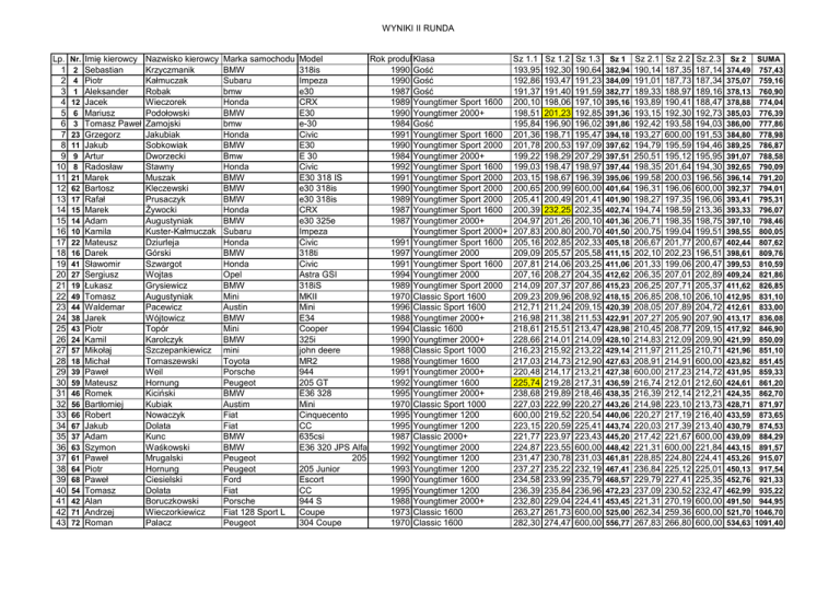 WYNIKI II RUNDA Lp. 1 2 3 4 5 6 7 8 9 10 11 12 13 14 15 16 17 18 19 20 21 22 23 24 25 26 27 28 29 30 31 32 33 34 35 36 37 38 39 40 41 42 43 Nr. 2 4 1 12 6 3 23 11 9 8 21 62 17 15 14 10 22 16 41 27 19 49 44 38 43 24 57 18 39 59 46 56 66 67 37 63 61 64 68 54 42 71 72 Imię kierowcy Sebastian Piotr Aleksander Jacek Mariusz Tomasz Paweł Grzegorz Jakub Artur Radosław Marek Bartosz Rafał Marek Adam Kamila Mateusz Darek Sławomir Sergiusz Łukasz Tomasz Waldemar Jarek Piotr Kamil Mikołaj Michał Paweł Mateusz Romek Bartłomiej Robert Jakub Adam Szymon Paweł Piotr Paweł Tomasz Alan Andrzej Roman Nazwisko kierowcy Krzyczmanik Kałmuczak Robak Wieczorek Podołowski Zamojski Jakubiak Sobkowiak Dworzecki Stawny Muszak Kleczewski Prusaczyk Żywocki Augustyniak Kuster-Kałmuczak Dziurleja Górski Szwargot Wojtas Grysiewicz Augustyniak Pacewicz Wójtowicz Topór Karolczyk Szczepankiewicz Tomaszewski Weil Hornung Kiciński Kubiak Nowaczyk Dolata Kunc Waśkowski Mrugalski Hornung Ciesielski Dolata Boruczkowski Wieczorkiewicz Palacz Marka samochodu BMW Subaru bmw Honda BMW bmw Honda BMW Bmw Honda BMW BMW BMW Honda BMW Subaru Honda BMW Honda Opel BMW Mini Austin BMW Mini BMW mini Toyota Porsche Peugeot BMW Austim Fiat Fiat BMW BMW Peugeot Peugeot Ford Fiat Porsche Fiat 128 Sport L Peugeot Model Rok produkcji Klasa 318is 1990 Gość Impeza 1990 Gość e30 1987 Gość CRX 1989 Youngtimer Sport 1600 E30 1990 Youngtimer 2000+ e-30 1984 Gość Civic 1991 Youngtimer Sport 1600 E30 1990 Youngtimer Sport 2000 E 30 1984 Youngtimer 2000+ Civic 1992 Youngtimer Sport 1600 E30 318 IS 1991 Youngtimer Sport 2000 e30 318is 1990 Youngtimer Sport 2000 e30 318is 1989 Youngtimer Sport 2000 CRX 1987 Youngtimer Sport 1600 e30 325e 1987 Youngtimer 2000+ Impeza Youngtimer Sport 2000+ Civic 1991 Youngtimer Sport 1600 318ti 1997 Youngtimer 2000 Civic 1991 Youngtimer Sport 1600 Astra GSI 1994 Youngtimer 2000 318iS 1989 Youngtimer Sport 2000 MKII 1970 Classic Sport 1600 Mini 1996 Classic Sport 1600 E34 1988 Youngtimer 2000+ Cooper 1994 Classic 1600 325i 1990 Youngtimer 2000+ john deere 1988 Classic Sport 1000 MR2 1988 Youngtimer 1600 944 1991 Youngtimer 2000+ 205 GT 1992 Youngtimer 1600 E36 328 1995 Youngtimer 2000+ Mini 1970 Classic Sport 1000 Cinquecento 1995 Youngtimer 1200 CC 1995 Youngtimer 1200 635csi 1987 Classic 2000+ E36 320 JPS Alfa Kiler 1992 Youngtimer 2000 205 1992 Youngtimer 1200 205 Junior 1993 Youngtimer 1200 Escort 1990 Youngtimer 1600 CC 1995 Youngtimer 1200 944 S 1988 Youngtimer 2000+ Coupe 1973 Classic 1600 304 Coupe 1970 Classic 1600 Sz 1.1 193,95 192,86 191,37 200,10 198,51 195,84 201,36 201,78 199,22 199,03 203,15 200,65 205,41 200,39 204,97 207,83 205,16 209,09 207,81 207,16 214,09 209,23 212,71 216,98 218,61 228,66 216,23 217,03 220,48 225,74 238,68 227,03 600,00 223,15 221,77 224,87 231,47 237,27 234,58 236,39 232,80 263,27 282,30 Sz 1.2 192,30 193,47 191,40 198,06 201,23 196,90 198,71 200,53 198,29 198,47 198,67 200,99 200,49 232,25 201,26 200,80 202,85 205,57 214,06 208,27 207,37 209,96 211,24 211,38 215,51 214,01 215,92 214,73 214,17 219,28 219,89 222,99 219,52 220,59 223,97 223,55 230,78 235,22 233,99 235,84 229,04 261,73 274,47 Sz 1.3 190,64 191,23 191,59 197,10 192,85 196,02 195,47 197,09 207,29 198,97 196,39 600,00 201,41 202,35 200,10 200,70 202,33 205,58 203,25 204,35 207,86 208,92 209,15 211,53 213,47 214,09 213,22 212,90 213,21 217,31 218,46 220,27 220,54 225,41 223,43 600,00 231,03 232,19 235,79 236,96 224,41 600,00 600,00 Sz 1 382,94 384,09 382,77 395,16 391,36 391,86 394,18 397,62 397,51 397,44 395,06 401,64 401,90 402,74 401,36 401,50 405,18 411,15 411,06 412,62 415,23 418,15 420,39 422,91 428,98 428,10 429,14 427,63 427,38 436,59 438,35 443,26 440,06 443,74 445,20 448,42 461,81 467,41 468,57 472,23 453,45 525,00 556,77 Sz 2.1 190,14 191,01 189,33 193,89 193,15 192,42 193,27 194,79 250,51 198,35 199,58 196,31 198,27 194,74 206,71 200,75 206,67 202,10 201,33 206,35 206,25 206,85 208,05 207,27 210,45 214,83 211,97 208,91 600,00 216,74 216,39 214,98 220,27 220,03 217,42 221,31 228,85 236,84 229,79 237,09 221,31 262,34 267,83 Sz 2.2 187,35 187,73 188,97 190,41 192,30 193,58 600,00 195,59 195,12 201,64 200,03 196,06 197,35 198,59 198,35 199,04 201,77 202,23 199,06 207,01 207,71 208,10 207,89 205,90 208,77 212,09 211,25 214,91 217,23 212,01 212,14 223,10 217,19 217,39 221,67 600,00 224,80 225,12 227,41 230,52 270,19 259,36 266,80 Sz.2.3 187,14 187,34 189,16 188,47 192,73 194,03 191,53 194,46 195,95 194,30 196,56 600,00 196,06 213,36 198,75 199,51 200,67 196,51 200,47 202,89 205,37 206,10 204,72 207,90 209,15 209,90 210,71 600,00 214,72 212,60 212,21 213,73 216,40 213,40 600,00 221,84 224,41 225,01 225,35 232,47 600,00 600,00 600,00 Sz 2 SUMA 374,49 757,43 375,07 759,16 378,13 760,90 378,88 774,04 385,03 776,39 386,00 777,86 384,80 778,98 389,25 786,87 391,07 788,58 392,65 790,09 396,14 791,20 392,37 794,01 393,41 795,31 393,33 796,07 397,10 798,46 398,55 800,05 402,44 807,62 398,61 809,76 399,53 810,59 409,24 821,86 411,62 826,85 412,95 831,10 412,61 833,00 413,17 836,08 417,92 846,90 421,99 850,09 421,96 851,10 423,82 851,45 431,95 859,33 424,61 861,20 424,35 862,70 428,71 871,97 433,59 873,65 430,79 874,53 439,09 884,29 443,15 891,57 453,26 915,07 450,13 917,54 452,76 921,33 462,99 935,22 491,50 944,95 521,70 1046,70 534,63 1091,40