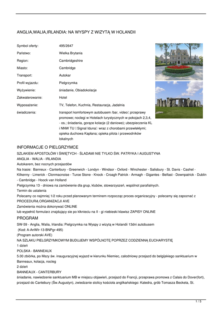 SW-59 - Anglia, Walia, Irlandia: Pielgrzymka na Wyspy z wizytą w Holandii 13dni autobusem