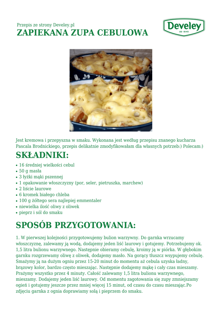 Przepis ze strony Develey.pl ZAPIEKANA ZUPA CEBULOWA Jest kremowa i przepyszna w smaku. Wykonana jest według przepisu znanego kucharza Pascala Brodnickiego, przepis delikatnie zmodyfikowałam dla własnych potrzeb:) Polecam:) SKŁADNIKI: ● ● ● ● ● ● ● ● ● 16 średniej wielkości cebul 50 g masła 3 łyżki mąki pszennej 1 opakowanie włoszczyzny (por, seler, pietruszka, marchew) 2 liście laurowe 6 kromek białego chleba 100 g żółtego sera najlepiej emmentaler niewielka ilość oliwy z oliwek pieprz i sól do smaku SPOSÓB PRZYGOTOWANIA: 1. W pierwszej kolejności przygotowujemy bulion warzywny. Do garnka wrzucamy włoszczyznę, zalewamy ją wodą, dodajemy jeden liść laurowy i gotujemy. Potrzebujemy ok. 1,5 litra bulionu warzywnego. Następnie obieramy cebulę, kroimy ją w piórka. W głębokim garnku rozgrzewamy oliwę z oliwek, dodajemy masło. Na gorący tłuszcz wsypujemy cebulę. Smażymy ją na dużym ogniu przez 15-20 minut do momentu aż cebula uzyska ładny, brązowy kolor, bardzo często mieszając. Następnie dodajemy mąkę i cały czas mieszamy. Prażymy wszystko przez 4 minuty. Całość zalewamy 1,5 litra bulionu warzywnego, mieszamy. Dodajemy jeden liść laurowy. Od momentu zagotowania się zupy zmniejszamy ogień i gotujemy jeszcze przez mniej więcej 15 minut, od czasu do czasu mieszając.Po zdjęciu garnka z ognia doprawiamy solą i pieprzem do smaku. 2. Tyle ile osób będzie jadło zupę tyle opiekamy kromek chleba w tosterze. Jeżeli nie posiadamy tostera to każdą kromkę chleba delikatnie smarujemy masłem i pieczemy w piekarniku przez mniej więcej 10 minut aż kromki ładnie się zarumienią i zrobią się chrupkie. Resztę chleba kroimy w małą kostkę. Na patelni rozgrzewamy 2 łyżki masła i wsypujemy pokrojony chleb i smażymy tak długo aż zrobią się nam chrupiące grzanki. 3. Zupę rozlewamy do miseczek żaroodpornych. Na powierzchni zupy układamy upieczony kawałek chleba, wokół posypujemy grzankami a na to układamy starty na dużych oczkach żółty ser. Rozgrzewamy piekarnik i zapiekamy zupę do momentu aż ser się rozpuści i ładnie zarumieni.
