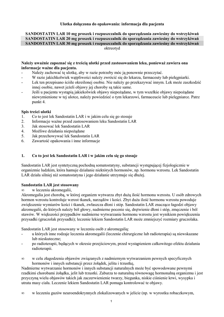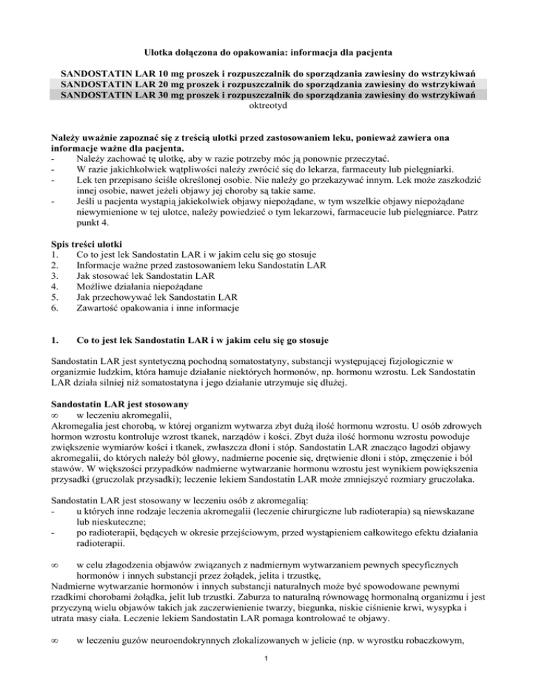 Ulotka dołączona do opakowania: informacja dla pacjenta SANDOSTATIN LAR 10 mg proszek i rozpuszczalnik do sporządzania zawiesiny do wstrzykiwań SANDOSTATIN LAR 20 mg proszek i rozpuszczalnik do sporządzania zawiesiny do wstrzykiwań SANDOSTATIN LAR 30 mg proszek i rozpuszczalnik do sporządzania zawiesiny do wstrzykiwań oktreotyd Należy uważnie zapoznać się z treścią ulotki przed zastosowaniem leku, ponieważ zawiera ona informacje ważne dla pacjenta. Należy zachować tę ulotkę, aby w razie potrzeby móc ją ponownie przeczytać. W razie jakichkolwiek wątpliwości należy zwrócić się do lekarza, farmaceuty lub pielęgniarki. Lek ten przepisano ściśle określonej osobie. Nie należy go przekazywać innym. Lek może zaszkodzić innej osobie, nawet jeżeli objawy jej choroby są takie same. Jeśli u pacjenta wystąpią jakiekolwiek objawy niepożądane, w tym wszelkie objawy niepożądane niewymienione w tej ulotce, należy powiedzieć o tym lekarzowi, farmaceucie lub pielęgniarce. Patrz punkt 4. Spis treści ulotki 1. Co to jest lek Sandostatin LAR i w jakim celu się go stosuje 2. Informacje ważne przed zastosowaniem leku Sandostatin LAR 3. Jak stosować lek Sandostatin LAR 4. Możliwe działania niepożądane 5. Jak przechowywać lek Sandostatin LAR 6. Zawartość opakowania i inne informacje 1. Co to jest lek Sandostatin LAR i w jakim celu się go stosuje Sandostatin LAR jest syntetyczną pochodną somatostatyny, substancji występującej fizjologicznie w organizmie ludzkim, która hamuje działanie niektórych hormonów, np. hormonu wzrostu. Lek Sandostatin LAR działa silniej niż somatostatyna i jego działanie utrzymuje się dłużej. Sandostatin LAR jest stosowany • w leczeniu akromegalii, Akromegalia jest chorobą, w której organizm wytwarza zbyt dużą ilość hormonu wzrostu. U osób zdrowych hormon wzrostu kontroluje wzrost tkanek, narządów i kości. Zbyt duża ilość hormonu wzrostu powoduje zwiększenie wymiarów kości i tkanek, zwłaszcza dłoni i stóp. Sandostatin LAR znacząco łagodzi objawy akromegalii, do których należy ból głowy, nadmierne pocenie się, drętwienie dłoni i stóp, zmęczenie i ból stawów. W większości przypadków nadmierne wytwarzanie hormonu wzrostu jest wynikiem powiększenia przysadki (gruczolak przysadki); leczenie lekiem Sandostatin LAR może zmniejszyć rozmiary gruczolaka. Sandostatin LAR jest stosowany w leczeniu osób z akromegalią: u których inne rodzaje leczenia akromegalii (leczenie chirurgiczne lub radioterapia) są niewskazane lub nieskuteczne; po radioterapii, będących w okresie przejściowym, przed wystąpieniem całkowitego efektu działania radioterapii. • w celu złagodzenia objawów związanych z nadmiernym wytwarzaniem pewnych specyficznych hormonów i innych substancji przez żołądek, jelita i trzustkę, Nadmierne wytwarzanie hormonów i innych substancji naturalnych może być spowodowane pewnymi rzadkimi chorobami żołądka, jelit lub trzustki. Zaburza to naturalną równowagę hormonalną organizmu i jest przyczyną wielu objawów takich jak zaczerwienienie twarzy, biegunka, niskie ciśnienie krwi, wysypka i utrata masy ciała. Leczenie lekiem Sandostatin LAR pomaga kontrolować te objawy. • w leczeniu guzów neuroendokrynnych zlokalizowanych w jelicie (np. w wyrostku robaczkowym, 1 jelicie cienkim lub okrężnicy) Guzy neuroendokrynne są rzadko występującymi guzami, umiejscowionymi w różnych częściach ciała. Lek Sandostatin LAR stosuje się również do hamowania wzrostu tego typu guzów zlokalizowanych w jelicie (np. w wyrostku robaczkowym, jelicie cienkim lub okrężnicy). • w leczeniu guzów przysadki wydzielających zbyt dużą ilość hormonu tyreotropowego (TSH). Zbyt duża ilość hormonu tyreotropowego (TSH) prowadzi do nadczynności tarczycy. Lek Sandostatin LAR jest stosowany u osób z guzami przysadki wydzielającymi zbyt dużą ilość hormonu tyreotropowego (TSH): gdy inne rodzaje leczenia (leczenie chirurgiczne lub radioterapia) są nieodpowiednie lub nieskuteczne; po radioterapii w okresie przejściowym, zanim radioterapia osiągnie pełną skuteczność. 2. Informacje ważne przed zastosowaniem leku Sandostatin LAR Należy postępować zgodnie ze wszystkimi zaleceniami lekarza. Mogą one różnić się od informacji zawartych w tej ulotce. Należy zapoznać się z poniższymi informacjami przed zastosowaniem leku Sandostatin LAR. Kiedy nie stosować leku Sandostatin LAR: jeśli pacjent ma uczulenie na oktreotyd lub którykolwiek z pozostałych składników tego leku (wymienionych w punkcie 6). Ostrzeżenia i środki ostrożności Przed rozpoczęciem stosowania leku Sandostatin LAR, należy omówić to z lekarzem: jeżeli pacjent wie, że ma lub miał w przeszłości kamienie żółciowe; należy powiedzieć o tym lekarzowi, ponieważ długotrwałe stosowanie leku Sandostatin LAR może powodować powstawanie kamieni żółciowych. Lekarz może zlecić okresową kontrolę pęcherzyka żółciowego. Jeśli pacjent choruje na cukrzycę, ponieważ lek Sandostatin LAR może wpływać na poziom cukru we krwi. Jeśli pacjent choruje na cukrzycę, stężenie cukru we krwi powinno być u niego regularnie kontrolowane. Jeśli pacjent miał w przeszłości zmniejszone stężenie witaminy B12, lekarz może zlecić okresową kontrolę stężenia witaminy B12. Badania i wizyty kontrolne Jeśli pacjent jest długotrwale leczony lekiem Sandostatin LAR, lekarz może zlecić okresową kontrolę czynności tarczycy. Lekarz będzie kontrolował czynność wątroby pacjenta. Dzieci Doświadczenie dotyczące stosowania leku Sandostatin LAR u dzieci jest niewielkie. Sandostatin LAR a inne leki Należy powiedzieć lekarzowi lub farmaceucie o wszystkich lekach przyjmowanych przez pacjenta obecnie lub ostatnio, a także o lekach, które pacjent planuje przyjmować. Podczas leczenia lekiem Sandostatin LAR można na ogół kontynuować przyjmowanie innych leków. Zgłaszano jedna