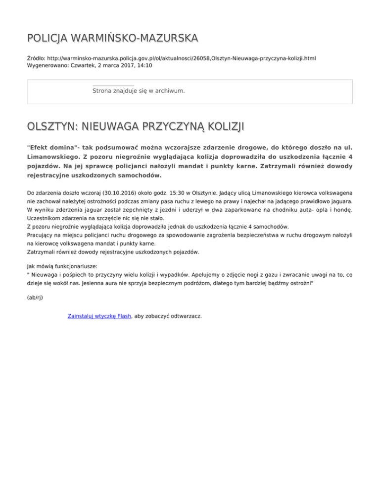 POLICJA WARMIŃSKO-MAZURSKA Źródło: http://warminsko-mazurska.policja.gov.pl/ol/aktualnosci/26058,Olsztyn-Nieuwaga-przyczyna-kolizji.html Wygenerowano: Czwartek, 2 marca 2017, 14:10 Strona znajduje się w archiwum. OLSZTYN: NIEUWAGA PRZYCZYNĄ KOLIZJI "Efekt domina"- tak podsumować można wczorajsze zdarzenie drogowe, do którego doszło na ul. Limanowskiego. Z pozoru niegroźnie wyglądająca kolizja doprowadziła do uszkodzenia łącznie 4 pojazdów. Na jej sprawcę policjanci nałożyli mandat i punkty karne. Zatrzymali również dowody rejestracyjne uszkodzonych samochodów. Do zdarzenia doszło wczoraj (30.10.2016) około godz. 15:30 w Olsztynie. Jadący ulicą Limanowskiego kierowca volkswagena nie zachował należytej ostrożności podczas zmiany pasa ruchu z lewego na prawy i najechał na jadącego prawidłowo jaguara. W wyniku zderzenia jaguar został zepchnięty z jezdni i uderzył w dwa zaparkowane na chodniku auta- opla i hondę. Uczestnikom zdarzenia na szczęście nic się nie stało. Z pozoru niegroźnie wyglądająca kolizja doprowadziła jednak do uszkodzenia łącznie 4 samochodów. Pracujący na miejscu policjanci ruchu drogowego za spowodowanie zagrożenia bezpieczeństwa w ruchu drogowym nałożyli na kierowcę volkswagena mandat i punkty karne. Zatrzymali również dowody rejestracyjne uszkodzonych pojazdów. Jak mówią funkcjonariusze: " Nieuwaga i pośpiech to przyczyny wielu kolizji i wypadków. Apelujemy o zdjęcie nogi z gazu i zwracanie uwagi na to, co dzieje się wokół nas. Jesienna aura nie sprzyja bezpiecznym podróżom, dlatego tym bardziej bądźmy ostrożni" (ab/rj) Zainstaluj wtyczkę Flash, aby zobaczyć odtwarzacz. pobierz film - 1.14 MB Ocena: 0/5 (0) Tweetnij