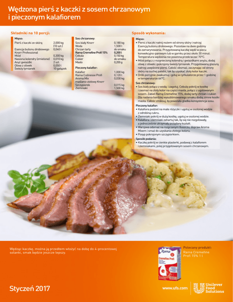 Wędzona pierś z kaczki z sosem chrzanowym i pieczonym kalafiorem Składniki na 10 porcji: Mięso: Pierś z kaczki ze skórą2,000 kg (10 szt.) Esencja bulionu drobiowego0,040 l Knorr Professional Miód 0,300 kg Nasiona kolendry (zmielone) 0,010 kg Anyż gwiazdki 2 szt. Oliwa z oliwek 0,050 l Świeży tymianek 10 gałązek Sposób wykonania: Sos chrzanowy: Sos biały Knorr Woda Chrzan tarty Rama Cremefine Profi 15% Cebula Cukier Masło Pieczony kalafior: Kalafior Rama Culinesse Profi Aroma Mix maślano-ziołowy Knorr Szczypiorek Ziemniaki 0,180 kg 1,500 l do smaku 0,200 l 0,150 kg do smaku 0,200 g 1,000 kg 0,120 l 0,030 kg 0,015 kg 1,500 kg Mięso: •Piersi z kaczki natnij nożem od strony skóry i natrzyj Esencją bulionu drobiowego. Pozostaw na dwie godziny do zamarynowania. Przygotowaną kaczkę wędź w piecu konwekcyjno-parowym lub w garnku przez około 30 minut. Temperatura wędzenia nie powinna przekraczać 70°C. •Miód połącz z rozgniecioną kolendrą i gwiazdkami anyżu, dodaj oliwę z oliwek i pokrojony świeży tymianek. Przygotowaną glazurą natrzyj uwędzone piersi. Całość obsmaż, zaczynając od strony skóry na suchej patelni, tak by uzyskać złoty kolor kaczki. •Drób porcyjnie zwakumuj i gotuj w cyrkulatorze przez 1 godzinę w temperaturze 64°C. Sos chrzanowy: •Sos biały połącz z wodą i zagotuj. Cebulę pokrój w kostkę i zasmaż na złoty kolor na części masła, połącz z ugotowanym sosem. Zabiel Ramą Cremefine 15%, dodaj tarty chrzan i cukier. Dla nadania bardziej wysublimowanego smaku dodaj zimne kostki masła. Całość zmiksuj, by powstała gładka konsystencja sosu. Pieczony kalafior: •Kalafiora podziel na małe różyczki i ugotuj w osolonej wodzie z odrobiną cukru. •Ziemniaki pokrój w dużą kostkę, ugotuj w osolonej wodzie. •Kalafiora i ziemniaki zahartuj tak, by się nie rozgotowały, a jednocześnie utrzymały pożądany kształt. •Warzywa odsmaż na rozgrzanym tłuszczu, dopraw Aroma Mixem i smaż do uzyskania złotego koloru. •Posyp pokrojonym szczypiorkiem. Sposób podania: •Kaczkę pokrój w cienkie plasterki, podawaj z kalafiorem i ziemniakami, polej przygotowanym sosem chrzanowym. Wędząc kaczkę, można ją przedtem włożyć na dobę do 4-procentowej solanki, smak będzie jeszcze lepszy. Styczeń 2017 Polecany produkt: Rama Cremefine Profi 15% 1 l www.ufs.com Karkówka wołowa w sosie własnym z knedlami, kapustą i chrupiącym bekonem Składniki na 10 porcji: Sposób wykonania: Karkówka wołowa: Karkówka wołowa1,500 kg Sos Demi Glace Knorr0,030 kg Esencja bulionu wołowego 0,60 l Knorr Professional Masło 0,150 kg Zioła (pietruszka, majeranek) do smaku Sos: Sos Demi Glace Knorr0,050 kg Redukcja bulionu wołowego 0,040 kg Knorr Professional Warzywa pokrojone w kostkę 0,800 kg (marchewka, seler, korzeń pietruszki, cebula) Koncentrat pomidorowy Knorr 0,100 kg Primerba prowansalska 0,015 kg Knorr Professional Woda 1,500 l Czerwone wino 0,200 l Rama Culinesse Profi dosmażenia Kapusta włoska zasmażana: Kapusta włoska Cebula Ocet Rama Cremefine Profi 15% Aroma Mix maślano-ziołowy Knorr Rama Culinesse Profi 2,000 kg 0,200 kg 0,050 l 0,300 l 0,030 kg Knedle: Bułka pszenna Mleko Jajka Pietruszka świeża Delikat Przyprawa Warzywna Szefa Kuchni Knorr 20 szt. 0,500 l 6 szt. 1 pęczek do smaku Chipsy z wędzonego boczku 10 szt. do smażenia Mięso: •Dopraw karkówkę sosem Demi Glace i posmaruj Esencją bulionu wołowego Knorr Professional, dodaj zioła i masło, całość zwakumuj. Gotuj w temperaturze 80°C przez 14 godzin w piecu konwekcyjnym lub cyrkulatorze. Sos: •Na rozgrzanym tłuszczu obsmaż warzywa na złoto-brązowy kolor. Dodaj koncentrat pomidorowy, cały czas zasmażaj. W gorącej wodzie rozprowadź sos Demi Glace i Redukcję bulionu wołowego. Zagotowany sos połącz z podsmażonymi warzywami. •Dla wzbogacenia smaku dodaj zredukowane czerwone wino, Primerbę prowansalską i sos od gotowania mięsa. Całość gotuj na wolnym ogniu do uzyskania konsystencji sosu. W ostatniej fazie sos przecedź przez drobne sitko. Kapusta włoska zasmażana: •Kapustę włoską poszatkuj i sparz. Na rozgrzanym tłuszczu zasmaż cebulę pokrojoną w drobną kostkę, dodaj kapustę, cały czas zasmażaj. Zakwaś octem, podlej Ramą Cremefine 15% i duś przez chwilę. Dopraw Aroma Mixem maślano-ziołowym. Knedle: •Oddziel żółtka od białek. Białka ubij na pianę. •Pszenne pieczywo pokrój w dużą kostkę. •Mleko połącz z żółtkami, posiekaną natką pietruszki i Przyprawą Szefa Kuchni, całość wymieszaj z pokrojonym pieczywem. Dla nadania puszystości dodaj ubite białka. Delikatnie wymieszaj wszystkie składniki. Masę przełóż na folię spożywczą, uformuj wałeczki o średnicy około 5-6 cm. Szczelnie zawiń w folię i gotuj w piecu konwekcyjnym w temperaturze 90°C przez około 20 minut. Gotując, zwróć uwagę, by używać GN-ów perforowanych. Sposób podania: •Kark wołowy wyporcjuj, podawaj z przygotowanym sosem, włoską zasmażoną kapustą i pokrojonymi knedlami. Całość udekoruj chipsem z boczku. Klasyczne czeskie knedle gotuje się w osolonej wrzącej wodzie, formując porcyjne kulki. W naszym przepisie zostało to uproszczone, zaproponowaliśmy uformowanie wałka średnicy około 5 cm, zawiniętego szczelnie w folię spożywczą. Ta forma znacznie ułatwi przygotowanie knedli, w szczególności przy cateringach. Polecany produkt: Esencja bulionu wołowego Knorr Professional 1 l Juraj Dohnansky Szef Kuchni Unilever Food Solutions Słowacja Styczeń 2017 www.ufs.com