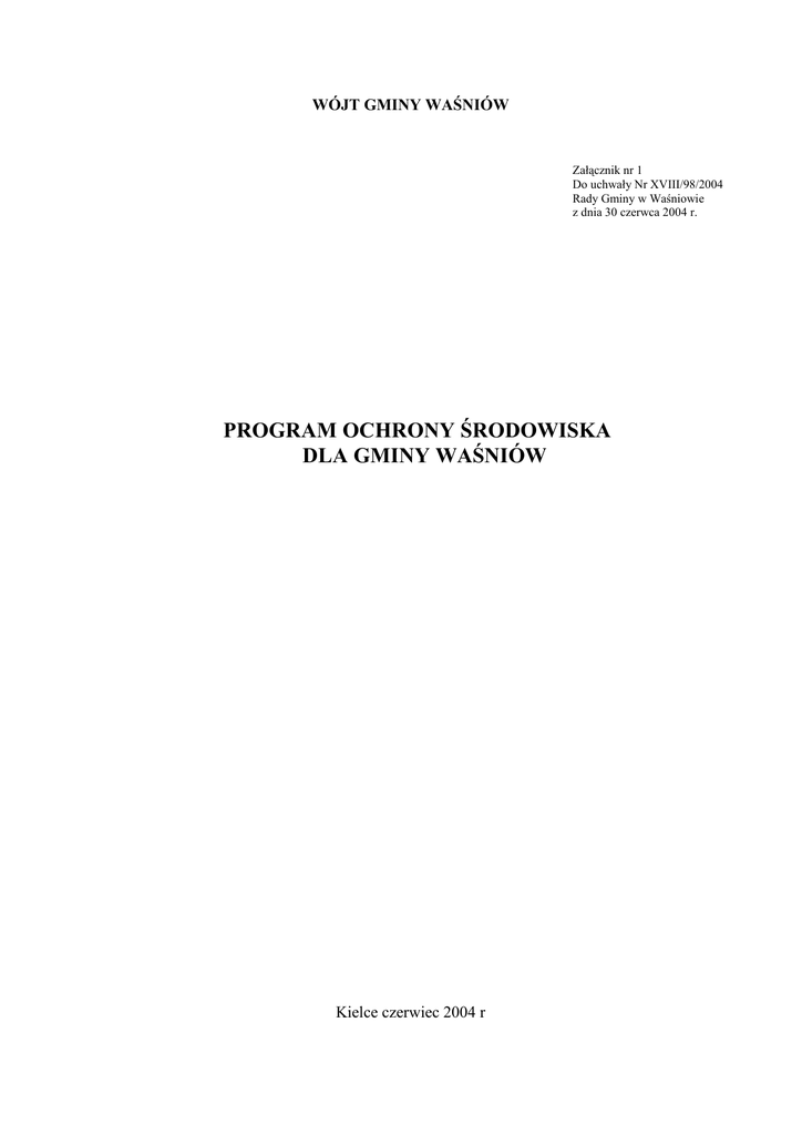WÓJT GMINY WAŚNIÓW Załącznik nr 1 Do uchwały Nr XVIII/98/2004 Rady Gminy w Waśniowie z dnia 30 czerwca 2004 r. PROGRAM OCHRONY ŚRODOWISKA DLA GMINY WAŚNIÓW Kielce czerwiec 2004 r PRACOWNIA GEOLOGICZNA JOANNA LASAK KIELCE Niniejszy program powstał przy współpracy Przedstawicieli Urzędu Gminy w Waśniowie, Starostwa Powiatowego w Ostrowcu Świętokrzyskim oraz Instytucji z terenu gminy Waśniów i powiatu ostrowieckiego. Zespół opracowujący: mgr inŜ. Joanna Lasak mgr Wiesław Mróz inŜ. Stanisław Gul 2 PROGRAM OCHRONY ŚRODOWISKA DLA GMINY WAŚNIÓW PRACOWNIA GEOLOGICZNA JOANNA LASAK KIELCE SPIS TREŚCI I. WPROWADZENIE.................................................................................................................................................5 I.1. CEL I ZAKRES PROGRAMU OCHRONY ŚRODOWISKA DLA GMINY WAŚNIÓW................................5 I.2. PODSTAWY PRAWNE OPRACOWANIA ...................................................................................................6 I.3. LITERATURA I MATERIAŁY ŹRÓDŁOWE..................................................................................................7 I.4. METODYKA OPRACOWANIA „PROGRAMU OCHRONY ŚRODOWISKA DLA GMINY WAŚNIÓW”.8 I.5. INSTYTUCJE OCHRONY ŚRODOWISKA.....................................................................................................8 I.6. PREZENTACJA GMINY WAŚNIÓW ..............................................................................................................8 II. ZASOBY NATURALNE I STAN ŚRODOWISKA ..........................................................................................11 II.1. OGÓLNA CHARAKTERYSTYKA ŚRODOWISKA PRZYRODNICZEGO...............................................11 II.2. ZASOBY WÓD POWIERZCHNIOWYCH I PODZIEMNYCH ..................................................................12 II.3. ZASOBY KOPALIN.......................................................................................................................................14 II.4. OBSZARY LEŚNE .........................................................................................................................................14 II.5. GLEBY ...........................................................................................................................................................15 II.6. POWIETRZE ..................................................................................................................................................16 II.7. HAŁAS ...........................................................................................................................................................18 II.8. POLA ELEKTROMAGNETYCZNE .............................................................................................................19 II.9. OCHRONA PRZYRODY...............................................................................................................................19 II.10.GOSPODARKA ODPADAMI ......................................................................................................................21 II.11. ENERGIA ODNAWIALNA.........................................................................................................................21 II.12. EDUKACJA EKOLOGICZNA ....................................................................................................................23 III. PRIORYTETY EKOLOGICZNE ....................................................................................................................25 IV. STRATEGIA DZIAŁAŃ....................................................................................................................................26 IV.1. ZAGROśENIA EKOLOGICZNE.................................................................................................................26 IV.2. GOSPODARKA WODNA ............................................................................................................................26 IV.3. KOPALINY...................................................................................................................................................28 IV.4. OCHRONA ZASOBÓW LEŚNYCH ............................................................................................................28 IV.5. OCHRONA GLEB I POWIERZCHNI TERENU..........................................................................................29 IV.6. OCHRONA POWIETRZA............................................................................................................................29 IV.7. OCHRONA PRZED HAŁASEM ..................................................................................................................30 IV.8. OCHRONA PRZED POLAMI ELEKTROMAGNETYCZNYMI................................................................31 IV.9. OCHRONA PRZYRODY .............................................................................................................................31 IV.10. ENERGIA ODNAWIALNA .......................................................................................................................32 IV.11. EDUKACJA EKOLOGICZNA...................................................................................................................33 IV.12. GOSPODARKA ODPADAMI....................................................................................................................34 IV.13. ZRÓWNOWAśONE WYKORZYSTANIE SUROWCÓW, MATERIAŁÓW, WODY............................35 I ENERGII ..............................................................................................................................................................35 IV.14. MONITORING REALIZACJI PROGRAMU .............................................................................................36 V. NARZĘDZIA I INSTRUMENTY REALIZACJI PROGRAMU................................................................