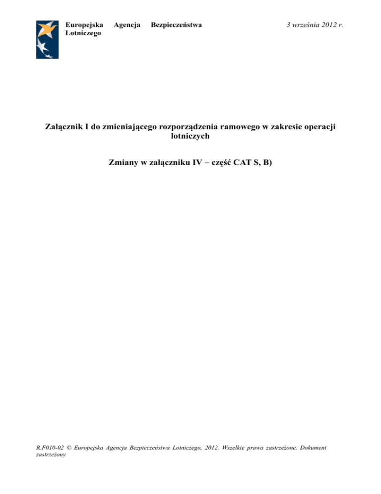 Europejska Lotniczego Agencja Bezpieczeństwa 3 września 2012 r. Załącznik I do zmieniającego rozporządzenia ramowego w zakresie operacji lotniczych Zmiany w załączniku IV część CAT S, B) R.F010-02 © Europejska Agencja Bezpieczeństwa Lotniczego, 2012. Wszelkie prawa zastrzeżone. Dokument zastrzeżony Część CAT(S,B) | Opinia 3 września 2012 r. Spis treści Zmiany w załączniku IV część CAT) ............................................................................................... 5 Podczęść A Wymogi ogólne .......................................................................................................... 5 CAT.GEN.105 Motoszybowce turystyczne, szybowce z napędem oraz balony o konstrukcji mieszanej ................................................................................ 5 Sekcja 2 – Statki powietrzne bez napędu silnikowego ............................................................... 5 CAT.GEN.NMPA.100 Obowiązki dowódcy ...................................................................... 5 CAT.GEN.NMPA.105 Dodatkowy członek załogi balonu ................................................ 7 CAT.GEN.NMPA.110 Władza dowódcy ........................................................................... 7 CAT.GEN.NMPA.115 Wspólny język ............................................................................... 7 CAT.GEN.NMPA.120 Przenośne urządzenia elektroniczne .............................................. 7 CAT.GEN.NMPA.125 Informacje o pokładowym wyposażeniu awaryjnym i ratunkowym ............................................................................................ 8 CAT.GEN.NMPA.130 Alkohol i środki odurzające ........................................................... 8 CAT.GEN.NMPA.135 Zagrożenia dla bezpieczeństwa ..................................................... 8 CAT.GEN.NMPA.140 Dokumenty, instrukcje oraz informacje przewożone na pokładzie ................................................................................................... 8 CAT.GEN.NMPA.145 Udostępnianie dokumentacji i zapisów ......................................... 9 CAT.GEN.NMPA.150 Transport materiałów niebezpiecznych ......................................... 9 CAT.GEN.NMPA.155 Niezwłoczne reagowanie na problemy w zakresie bezpieczeństwa.......................................................................................... 10 Podczęść B Procedury operacyjne ............................................................................................... 11 Sekcja 2 – Statki powietrzne bez napędu silnikowego ............................................................... 11 CAT.OP.NMPA.100 Korzystanie z lotnisk i miejsc operacji lotniczych ........................ 11 CAT.OP.NMPA.105 Procedury przeciwhałasowe – balony i szybowce z napędem ...... 11 CAT.OP.NMPA.110 Paliwo i balast oraz ich planowanie balony ............................... 11 CAT.OP.NMPA.115 Przewóz pasażerów kategorii specjalnych (SCP) .......................... 11 CAT.OP.NMPA.120 Instrukcje bezpieczeństwa dla pasażerów ..................................... 11 CAT.OP.NMPA.125 Przygotowanie lotu ........................................................................ 12 CAT.OP.MPA.130 Złożenie planu lotu ATS................................................................ 12 CAT.OP.NMPA.135 Zabezpieczenie przedziału pasażerskiego i przedziału pilotów balony ....................................................................................... 12 CAT.OP.MPA.140 Palenie tytoniu na pokładzie .......................................................... 12 CAT.OP.NMPA.145 Warunki meteorologiczne.............................................................. 12 Strona 2 z 23 Część CAT(S,B) | Opinia 3 września 2012 r. CAT.OP.NMPA.150 Lód oraz inne zanieczyszczenia procedury naziemne ................ 12 CAT.OP.NMPA.155 Warunki do startu .......................................................................... 13 CAT.OP.NMPA.160 Symulowanie sytuacji nienormalnych w czasie lotu ..................... 13 CAT.OP.NMPA.165 Gospodarka paliwem i balastem w locie balony ........................ 13 CAT.OP.NMPA.170 Użycie dodatkowego tlenu ............................................................ 13 CAT.OP.NMPA.175 Warunki podejścia i lądowania...................................................... 13 CAT.OP.NMPA.180 Ograniczenia operacyjne – balony na ogrzane powietrze ............. 13 CAT.OP.NMPA.185 Ograniczenia operacyjne szybowce ........................................... 13 Podczęść C Osiągi i ograniczenia operacyjne statków powietrznych ....................................... 14 Sekcja 4 Szybowce ...................................................................................................................... 14 CAT.POL.S.100 Ograniczenia operacyjne ..................................................................... 14 CAT.POL.S.105 Ważenie ................................................................................................ 14 CAT.POL.S.110 Osiągi.................................................................................................... 14 Sekcja 5 Balony .......................................................................................................................... 15 CAT.POL.B.100 Ograniczenia operacyjne ...................................................................... 15 CAT.POL.B.105 Ważenie ................................................................................................ 15 CAT.POL.B.110 System ustalania masy.......................................................................... 15 CAT.POL.B.115 Osiągi.................................................................................................... 15 Podczęść D Przyrządy, dane i wyposażenie ................................................................................ 17 Sekcja 3 Szybowce .....................