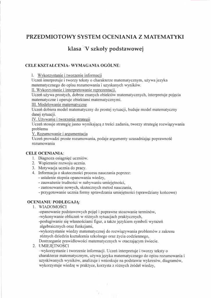 PRZEDMIOTOWY SYSTEM OCENIANIA Z MATEMATYKI klasa V szkoły podstawowej CELE KSZTAŁCENIA- WYMAGANIA OGÓLNE: I. Wykorzystanie i tworzenie informacji Uczeń interpretuje i tworzy teksty o charakterze matematycznym, używa jeżyka matematycznego do opisu rozumowania i uzyskanych wyników. II. Wykorzystanie i interpretowanie reprezentacji. Uczeń używa prostych, dobrze znanych obiektów matematycznych, interpretuje pojęcia matematyczne i operuje obiektami matematycznymi. III. Modelowanie matematyczne Uczeń dobiera model matematyczny do prostej sytuacji, buduje model matematyczny danej sytuacji. IV. Używanie i tworzenie strategii Uczeń stosuje strategię jasno wynikającą z treści zadania, tworzy strategię rozwiązywania problemu V. Rozumowanie i argumentacja Uczeń prowadzi proste rozumowania, podaje argumenty uzasadniając poprawność rozumowania CELE OCENIANIA: 1. Diagnoza osiągnięć uczniów. 2. Wspieranie rozwoju ucznia. 3. Motywacja ucznia do pracy. 4. Informacja o skuteczności procesu nauczania poprzez: - ustalenie stopnia opanowania wiedzy, - zauważenie trudności w nabywaniu umiejętności, - zastosowanie nowych, skutecznych metod nauczania, - przygotowanie ucznia formy sprawdzania umiejętności (sprawdziany końcowe) OCENIANIU PODLEGAJĄ: 1. WIADOMOŚCI -opanowanie podstawowych pojęć i poprawne stosowanie terminów, -wykonywanie obliczeń w różnych sytuacjach praktycznych, -posługiwanie się własnościami figur, a także językiem symboli wyrażeń algebraicznych oraz funkcjami, -wykorzystanie wiedzy matematycznej do rozwiązywania problemów z zakresu różnych dziedzin kształcenia szkolnego oraz życia codziennego, Dostrzeganie prawidłowości matematycznych w otaczającym świecie. 2. UMIEJĘTNOŚCI -wykorzystanie i tworzenie informacji. Uczeń interpretuje i tworzy teksty o charakterze matematycznym, używa języka matematycznego do opisu rozumowania i uzyskiwanych wyników, analizuje i wnioskuje na podstawie wykresów, diagramów, wykorzystuje wiedzę w praktyce, korzysta z różnych źródeł wiedzy, -wykorzystywanie i interpretowanie reprezentacji. Uczeń używa prostych, dobrze znanych obiektów matematycznych, interpretuje pojęcia matematyczne i operuje obiektami matematycznymi, -modelowanie matematyczne. Uczeń dobiera model matematyczny do prostej sytuacji, buduje model matematyczny danej sytuacji, Użycie i tworzenie strategii. Uczeń stosuje strategie jasno wynikające z treści zadania, tworzy strategię rozwiązania problemu. -rozumowanie i argumentacja. Uczeń prowadzi proste rozumowanie, podaje argumenty uzasadniające poprawność rozumowania. 3. POSTAWY Kształtowanie u uczniów postaw sprzyjających ich dalszemu rozwojowi indywidualnemu i społecznemu: -współpraca w zespole, autoprezentacja, samodzielność, twórczość w pracy, ciekawość poznawcza, kreatywność, przedsiębiorczość, kultura osobista, -nastawienie do podejmowania wysiłku intelektualnego oraz postawy dociekliwości, -organizacja pracy , systematyczność, pracowitość, wytrwałość, uczciwość, wiarygodność, odpowiedzialność, poczucie własnej wartości, szacunek dla innych ludzi -umiejętność prowadzenia dyskusji, precyzyjnego formułowania problemów i argumentowania, -wyrabianie nawyku sprawdzania otrzymanych odpowiedzi i korygowania popełnianych błędów -przygotowanie do lekcji. SPOSOBY OCENIANIA UCZNIÓW Pomiar osiągnięć uczniów odbywa się poprzez ocenę następujących form aktywności uczniów: I. odpowiedzi ustne z trzech ostatnich lekcji II. prace klasowe III. kartkówki diagnoza na wejściu IV. kontrola zadań domowych oraz zeszytów ćwiczeń V. diagnoza na wejściu VI. badanie wyników nauczania półroczne, roczne VII. obserwacja ucznia, aktywność na lekcji, przygotowanie do lekcji, praca w grupie VIII. inne formy aktywności: projekty edukacyjne, wykonywanie pomocy dydaktycznych, udział w konkursach matematycznych, dodatkowe zadania -zadania dla chętnych, SPOSOBY OCENIANIA UCZNIÓW: 1. Prace klasowe sprawdzające opanowanie określonego działu programowego, trwające całą lekcję, są one punktowane i oceniane w skali 1-6. 2. Testy- prace pisemne, złożone z większej liczby zadań, obejmujące treści przekazywane w ciągu semestru (roku) stosowane zamiast pracy klasowej. 3. Kartkowki-nauczyciel ma prawo sprawdzić przygotowanie się ucznia do lekcji, wykorzystując w tym celu materiał z 3 ostatnich tematów. Kartkówki, obejmujące materiał trzech ostatnich lekcji powinny być zapowiadane na poprzedniej lekcji. Kartkówki z ostatniej lekcji mogą być przeprowadzane bez zapowiedzi. 4. Odpowiedzi ustne- ustne sprawdzenie wiedzy i umiejętności obejmuje maksymalnie trzy ostatnie lekcje i może odbywać się bez zapowiedzi. 5. Prace domowe- samodzielne, estetyczne (nie każda praca domowa będzie oceniona). 6. Prace dodatkowe- zadania o podwyższonym stopniu trudności, wykonane pomoce do pracowni, zaproponowane przez ucznia lub wskazane przez nauczyciela. 7. Aktywność na lekcji i praca w grupie, przygotowanie do lekcji CZĘSTOTLIWOŚĆ OCENIANIA: W ciągu semestru powinny być co najmniej: - 2-3 prace klasowe lub testy, - 4 kartkówki - 1 ocena za pracę domową lub zadanie dodatkowe - 1 ocena za odpowiedź ustną, aktywność UWAGI O OCENIANIU: 1. Oceny są wystawiane w skali od 1-6 (nie stosuje się ocen „1+” i „6-” ); 2. O ocenie semestralnej (rocznej) w kolejności decydują oceny cząstkowe z prac klasowych, testów, kartkówek, odpowiedzi ustnych, aktywności a następnie pozostałe oceny. 3. Prace klasowe są obowiązkowe, zapowiedziane z tygodniowym wyprzedzeniem- data pisania pracy zapisana w dzienniku lekcyjnym ołówkiem, z podaniem zakresu obowiązkowego materiału; jeżeli uczeń z przyczyn losowych nie może jej napisać z całą klasą, to powinien to uczynić w terminie w 2 tygodniowym od rozdania prac ( umowa uczeń- nauczyciel). 4. Prace klasowe są sprawdzane w terminie 2 tygodniowym. 5. Uczeń ma