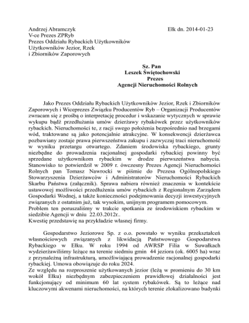 Andrzej Abramczyk V-ce Prezes ZPRyb Prezes Oddziału Rybackich Użytkowników Użytkowników Jezior, Rzek i Zbiorników Zaporowych Ełk dn. 2014-01-23 Sz. Pan Leszek Świętochowski Prezes Agencji Nieruchomości Rolnych Jako Prezes Oddziału Rybackich Użytkowników Jezior, Rzek i Zbiorników Zaporowych i Wiceprezes Związku Producentów Ryb – Organizacji Producentów zwracam się z prośbą o interpretację procedur i wskazanie wytycznych w sprawie wykupu bądź przedłużania umów dzierżawy rybakówek przez użytkowników rybackich. Nieruchomości te, z racji swego położenia bezpośrednio nad brzegami wód, traktowane są jako potencjalnie atrakcyjne. W konsekwencji dzierżawca pozbawiany zostaje prawa pierwszeństwa zakupu i zazwyczaj traci nieruchomość w wyniku przetargu otwartego. Zdaniem środowiska rybackiego, grunty niezbędne do prowadzenia racjonalnej gospodarki rybackiej powinny być sprzedane użytkownikom rybackim w drodze pierwszeństwa nabycia. Stanowisko to potwierdził w 2009 r. ówczesny Prezes Agencji Nieruchomości Rolnych pan Tomasz Nawrocki w piśmie do Prezesa Ogólnopolskiego Stowarzyszenia Dzierżawców i Administratorów Nieruchomości Rybackich Skarbu Państwa (załącznik). Sprawa nabiera również znaczenia w kontekście ustawowej możliwości przedłużenia umów rybackich z Regionalnym Zarządem Gospodarki Wodnej, a także konieczności podejmowania decyzji inwestycyjnych związanych z ostatnim już, tak wysokim, unijnym programem pomocowym. Problem ten poruszaliśmy w trakcie spotkania ze środowiskiem rybackim w siedzibie Agencji w dniu 22.03.2012r.. Kwestię przedstawię na przykładzie własnej firmy. Gospodarstwo Jeziorowe Sp. z o.o. powstało w wyniku przekształceń własnościowych związanych z likwidacją Państwowego Gospodarstwa Rybackiego w Ełku. W roku 1994 od AWRSP Filia w Suwałkach wydzierżawiliśmy leżące na terenie siedmiu gmin 44 jeziora (ok. 6005 ha) wraz z przynależną infrastrukturą, umożliwiającą prowadzenie racjonalnej gospodarki rybackiej. Umowa obowiązuje do roku 2024. Ze względu na rozproszenie użytkowanych jezior (leżą w promieniu do 30 km wokół Ełku) niezbędnym zabezpieczeniem prawidłowej działalności jest funkcjonujący od minimum 60 lat system rybakówek. Są to leżące nad kluczowymi akwenami nieruchomości, na których terenie zlokalizowano budynki związane z magazynowaniem ryb, lodu, maszyn i urządzeń, a także przeznaczone do przechowywania, montażu i naprawy sprzętu rybackiego oraz zaplecze socjalne pracowników. Posiadają też pirsy do wodowania, cumowania i obsługi ciężkiego sprzętu połowowego. Naszemu Gospodarstw wydzierżawiono 7 takich obiektów. Do roku 2002 zgodnie z ówczesną polityką Agencji wykupiliśmy cały majątek obrotowy i trwały za wyjątkiem rybakówki leżącej nad jeziorem Szóstak Duży. W latach 2004-2013, korzystając z funduszy rybackich wykonaliśmy remonty kapitalne, będących własnością Gospodarstwa większości budynków gospodarczych. Posiadają one obecnie ogrzewane pomieszczenia socjalne (z prysznicami, toaletami, miejscami przygotowania posiłków), magazyny ryb spełniające najwyższe standardy oraz nowoczesne urządzenia (np. wytwornice lodu, podgrzewacze wody, systemy wentylacyjne itp.). Wymieniliśmy pokrycia dachowe, instalacje elektryczne i odgromowe. Do ocieplonych i odmalowanych budynków doprowadziliśmy wodę i kanalizację. Powstały utwardzone kostką place manewrowe i drogi dojazdowe. Zakupu rybakówki w Szczecinowie nie sfinalizowano, ponieważ dopiero w 2005r jej teren jako odrębny został geodezyjnie wydzielony z działki jeziorowej. Funkcjonowanie tej rybakówki jest absolutnie konieczne do prowadzenia racjonalnej gospodarki rybackiej w jeziorze Szóstak Wielki (pow. 491 ha) – jednym z najważniejszych pod względem gospodarczym i rybackim akwenów. Zbiornik ten z racji swego położenia i wielkości ma fundamentalne znaczenie dla całego ekosystemu obwodu rybackiego jeziora Łaśmiady w zlewni rzeki Ełk nr 20 (2 342,98 ha). Znajdująca się na rybakówce infrastruktura jest bazą oraz przystanią dla brygady rybackiej. Dzierżawiona działka to obecnie jedyne miejsce nad całym jeziorem, gdzie możliwe jest wodowanie rybackich łodzi niewodowych (brak dojazdu do wody związany z wykupem i grodzeniem terenów nadbrzeżnych), a także prowadzenie skutecznych zarybień bez względu na siłę i kierunek wiatru oraz wysokość fal. Jej centralne położenie ułatwia dokładną obserwację zbiornika, a co się z tym wiąże – skuteczne działanie Państwowej Straży Rybackiej. W miarę potrzeb ziemia orna wykorzystywana jest do pozyskiwania zboża, którym karmimy hodowany przez nas w stawach przyjeziorowych materiał zarybieniowy. Jest tu też zlokalizowana pryzma, służąca do przechowywania lodu do schładzania ryb. Stojące na działce budynki, mimo napraw bieżących, wymagają remontów kapitalnych (dachy, stropy, elewacje, stolarka okienna i drzwiowa) oraz gruntownej przebudowy związanej z koniecznością dostosowania do obecnie obowiązujących wymogów sanitarno-weterynaryjnych przy produkcji żywności i, co za tym idzie, wyposażenia ich w niezbędne stacjonarne urządzenia i maszyny. Prace te pochłoną bardzo duże nakłady finansowe, dlatego warunkiem niezbędnym wszelkich działań powinna być klarowna sytuacja prawna. Na obecnym etapie konieczne jest więc już podejmowanie długofalowych strategicznych decyzji inwestycyjnych. Własność gruntu zdecydowanie ułatwiłaby nam pozyskanie środków zewnętrznych (kredyty, środki unijne). Nadmienić należy, że wniosek o wykonanie remontu kapitalnego jednego z budynków zakończył się decyzją ANR o jego rozbiórce. O wykup ww. działki występowaliśmy już dwukrotnie. Za każdym razem otrzymywaliśmy odpowiedź odmowną, co argumentowano następująco: 1. Brak planu zagospodarowania przestrzennego - Już po złożeniu wniosku przez ANR o sporządzenie p