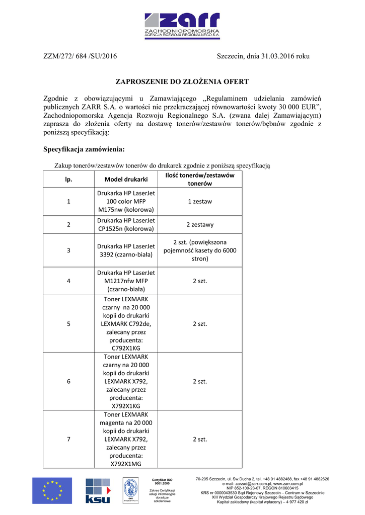 ZZM/272/ 684 /SU/2016 Szczecin, dnia 31.03.2016 roku ZAPROSZENIE DO ZŁOŻENIA OFERT Zgodnie z obowiązującymi u Zamawiającego „Regulaminem udzielania zamówień publicznych ZARR S.A. o wartości nie przekraczającej równowartości kwoty 30 000 EUR”, Zachodniopomorska Agencja Rozwoju Regionalnego S.A. (zwana dalej Zamawiającym) zaprasza do złożenia oferty na dostawę tonerów/zestawów tonerów/bębnów zgodnie z poniższą specyfikacją: Specyfikacja zamówienia: Zakup tonerów/zestawów tonerów do drukarek zgodnie z poniższą specyfikacją Ilość tonerów/zestawów lp. Model drukarki tonerów Drukarka HP LaserJet 1 100 color MFP 1 zestaw M175nw (kolorowa) 2 Drukarka HP LaserJet CP1525n (kolorowa) 2 zestawy 3 Drukarka HP LaserJet 3392 (czarno-biała) 2 szt. (powiększona pojemność kasety do 6000 stron) 4 5 6 7 Drukarka HP LaserJet M1217nfw MFP (czarno-biała) Toner LEXMARK czarny na 20 000 kopii do drukarki LEXMARK C792de, zalecany przez producenta: C792X1KG Toner LEXMARK czarny na 20 000 kopii do drukarki LEXMARK X792, zalecany przez producenta: X792X1KG Toner LEXMARK magenta na 20 000 kopii do drukarki LEXMARK X792, zalecany przez producenta: X792X1MG Certyfikat ISO 9001:2000 Zakres Certyfikacji usługi informacyjne doradcze szkoleniowe 2 szt. 2 szt. 2 szt. 2 szt. 70-205 Szczecin, ul. Św.Ducha 2, tel. +48 91 4882488, fax +48 91 4882626 e-mail: [email protected], www.zarr.com.pl NIP 852-100-23-07, REGON 810603415 KRS nr 0000043530 Sąd Rejonowy Szczecin – Centrum w Szczecinie XIII Wydział Gospodarczy Krajowego Rejestru Sądowego Kapitał zakładowy (kapitał wpłacony) – 4 977 420 zł 8 9 10 11 12 13 14 15 16 Toner LEXMARK żółty na 20 000 kopii do drukarki LEXMARK X792, zalecany przez producenta: X792X1YG Toner LEXMARK czarny do drukarki LEXMARK X945e, zalecany przez producenta: X945e Toner LEXMARK żółty do drukarki LEXMARK X945e, zalecany przez producenta: X945e Toner LEXMARK cyjan do drukarki LEXMARK X945e, zalecany przez producenta: X945e Toner LEXMARK magenta do drukarki LEXMARK X945e, zalecany przez producenta: X945e HP LaserJet Pro CM1415fnw color MFP (kolorowa) Samsung SCX 4216 F (czarno-biała) 2 szt. 2 szt. 1 szt. 1 szt. 1 szt. 1 zestaw 1 szt. Lexmark E360 dn (czarno-biała) Panasonic KXMB2025 (czarnobiała) 4 szt. 6 szt. 1. Zakup 2 szt. bębna do urządzenia Panasonic KX-MB2025 (czarno-białe) lp. 1 Model drukarki Panasonic KX-MB2025 (czarno-biała) Ilość bębnów 2 szt. Certyfikat ISO 9001:2000 Zakres Certyfikacji usługi informacyjne doradcze szkoleniowe 70-205 Szczecin, ul. Św.Ducha 2, tel. +48 91 4882488, fax +48 91 4882626 e-mail: [email protected], www.zarr.com.pl NIP 852-100-23-07, REGON 810603415 KRS nr 0000043530 Sąd Rejonowy Szczecin – Centrum w Szczecinie XIII Wydział Gospodarczy Krajowego Rejestru Sądowego Kapitał zakładowy (kapitał wpłacony) – 4 977 420 zł Zamówienie dotyczy: - zakupienia tonerów do drukarek czarno-białych (28 szt. tonerów- oryginały) oraz zakupienia zestawów tonerów do drukarek kolorowych (4 zestawy tonerów- oryginały). - zakupienia bębnów (2 szt.- oryginały) do urządzenia wielofunkcyjnego. Szczegółowe zasady wyboru oferty: 1. Kryterium wyboru będzie cena 100% łącznego zamówienia. Powyższe materiały muszą być oryginalne. 2. Prosimy o podanie cen jednostkowych brutto. 3. Termin realizacji zamówienia – 15.04.2016 roku 4. Na realizację zamówienia zostanie przygotowana umowa z ZARR S.A. 5. Termin płatności – 7 dni od daty wpływu faktury do siedziby Zamawiającego po sporządzeniu i przyjęciu przez Zamawiającego protokołu zdawczo-odbiorczego. 6. Zamawiający zastrzega sobie prawo odwołania lub zmiany Zaproszenia do złożenia ofert. 7. Termin i sposób dostarczenia ofert: oferty z dopiskiem „Dostawa tonerów” należy przesłać do 4 kwietnia 2016 roku do godz. 12.00 - za pośrednictwem poczty elektronicznej na adres: [email protected] 6. Do kontaktów i wyjaśnień ze strony Zamawiającego upoważniony jest Pan Sławomir Urbańczyk, tel. 91 4329321 lub e-mail: [email protected] Certyfikat ISO 9001:2000 Zakres Certyfikacji usługi informacyjne doradcze szkoleniowe 70-205 Szczecin, ul. Św.Ducha 2, tel. +48 91 4882488, fax +48 91 4882626 e-mail: [email protected], www.zarr.com.pl NIP 852-100-23-07, REGON 810603415 KRS nr 0000043530 Sąd Rejonowy Szczecin – Centrum w Szczecinie XIII Wydział Gospodarczy Krajowego Rejestru Sądowego Kapitał zakładowy (kapitał wpłacony) – 4 977 420 zł