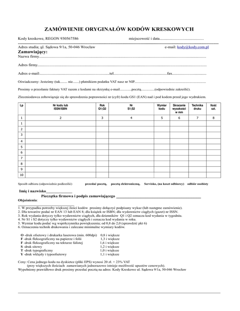 ZAMÓWIENIE ORYGINAŁÓW KODÓW KRESKOWYCH Kody kreskowe, REGON 930567586 miejscowość i data............................................ ....................................................................................................................................................................................................... Adres studia; ul. Sądowa 9/1a, 50-046 Wrocław e-mail: [email protected] Zamawiający: Nazwa firmy...................................................................................................................................................................... Adres firmy........................................................................................................................................................................ Adres e-mail:.....................................................................tel.....................................................fax.................................. Oświadczamy: Jesteśmy (tak........ nie.......) płatnikiem podatku VAT nasz nr NIP............................................................................... Prosimy o przesłanie faktury VAT razem z kodami na skrzynkę e-mail.............pocztą...............(odpowiednie zakreślić). Zleceniodawca zobowiązuje się do sprawdzenia poprawności nr (cyfr) kodu GS1 (EAN) nad i pod kodem przed jego wydrukiem. Lp Nr kodu lub ISSN/ISBN Rok Q1;Q2 Nr S1;S2 Wymiar kodu Skracanie wysokości w mm Technika druku Ilość szt. 1 2 3 4 5 6 7 8 1 2 3 4 5 6 7 8 9 10 Sposób odbioru (odpowiednie podkreślić) przesłać pocztą, pocztą elektroniczną, Imię i nazwisko_____________ Pieczątka firmowa i podpis zamawiającego Servisko, (na koszt odbiorcy) odbiór osobisty ___________________________________ Objaśnienia: _______________________________ 1. W przypadku potrzeby większej ilości kodów prosimy dołączyć podpisany wykaz (lub następne zamówienie). 2. Dla towarów podać nr EAN 13 lub EAN 8; dla ksiąŜek nr ISBN; dla wydawnictw ciągłych (gazet) nr ISSN. 3. Rok wydania dotyczy tylko wydawnictw ciągłych, dla dzienników Q1 i Q2 oznacza kod wydania w tygodniu. 4. Nr S1 i S2 dotyczy tylko wydawnictw ciągłych i oznacza kod wydania w roku. 5. Wymiar kodu podać wg współczynnika powiększenia; od 0,8 do 2,0 (sprawdzić pkt 6) 6. Oznaczenia technik drukowania i zalecane minimalne wymiary kodów. O -druk ofsetowy i drukarka laserowa (min. 600dpi) F -druk fleksograficzny na papierze i folii F -druk fleksograficzny na tekturze falistej S -druk sitowy T -druk typograficzny Y -druk wklęsły i typoofsetowy 0,8 i większe 1,3 i większe 1,6 i większe 1,2 i większe 1,0 i większe 1,1 i większe Ceny: Cena jednego kodu na dyskietce (pliki EPS) wynosi 20 zł. + 23% VAT (przy większych ilościach zamawianych jednorazowo istnieje moŜliwość upustów cenowych). Wypełniony prawidłowo druk prosimy przesłać pocztą na adres: Kody Kreskowe ul. Sądowa 9/1a, 50-046 Wrocław