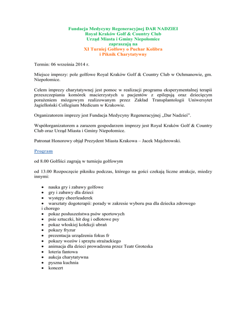 Fundacja Medycyny Regeneracyjnej DAR NADZIEI Royal Kraków Golf & Country Club Urząd Miasta i Gminy Niepołomice zapraszają na XI Turniej Golfowy o Puchar Kolibra i Piknik Charytatywny Termin: 06 września 2014 r. Miejsce imprezy: pole golfowe Royal Kraków Golf & Country Club w Ochmanowie, gm. Niepołomice. Celem imprezy charytatywnej jest pomoc w realizacji programu eksperymentalnej terapii przeszczepiania komórek macierzystych u pacjentów z epilepsją oraz dziecięcym porażeniem mózgowym realizowanym przez Zakład Transplantologii Uniwersytet Jagielloński Collegium Medicum w Krakowie. Organizatorem imprezy jest Fundacja Medycyny Regeneracyjnej „Dar Nadziei”. Współorganizatorem a zarazem gospodarzem imprezy jest Royal Kraków Golf & Country Club oraz Urząd Miasta i Gminy Niepołomice. Patronat Honorowy objął Prezydent Miasta Krakowa – Jacek Majchrowski. Program od 8.00 Golfiści zagrają w turnieju golfowym od 13.00 Rozpoczęcie pikniku podczas, którego na gości czekają liczne atrakcje, miedzy innymi: nauka gry i zabawy golfowe gry i zabawy dla dzieci występy cheerleaderek warsztaty dogoterapii: porady w zakresie wyboru psa dla dziecka zdrowego i chorego pokaz posłuszeństwa psów sportowych psie sztuczki, hit dog i odlotowe psy pokaz włoskiej kolekcji ubrań pokazy fryzur prezentacja urządzenia fokus fr pokazy wozów i sprzętu strażackiego animacja dla dzieci prowadzona przez Teatr Groteska loteria fantowa aukcja charytatywna pyszna kuchnia koncert Program szczegółowy 13.00 – 14.00 Powitanie zebranych przez prowadzących, zaproszenie na scenę przedstawicieli Fundacji Dar Nadziei. Rozpoczęcie Pikniku. Piosenka na powitanie. 14.00 – 17.00 Atrakcje dla dzieci, młodzieży i dorosłych 16.00 – 17.00 koncert zespołu Workaholic 17.00 Podziękowanie Patronom Honorowym, Medialnym i Współorganizatorom oraz Sponsorom za pomoc. Piosenka 17.15 – 17.45 AUKCJA CHARYTATYWNA DZIEŁ SZTUKI – prowadzenie Jerzy Fedorowicz 17.45 – 18.00 Występy cheerleaderek 18.15 Wręczenie nagród zwycięzcom XI Turnieju Golfowego o Puchar Kolibra. Zakończenie. Pożegnanie Zastrzegamy możliwość zmian w programie pikniku. Dochód z dobrowolnych wpłat, aukcji dzieł sztuki, loterii fantowej oraz opłaty turniejowej graczy zasila w całości konto Fundacji. Wpłaty prosimy kierować na konto Fundacji Dar Nadziei Zgłoszenia Gracze: www.krakowgolf.pl, [email protected] tel.: 12 2819170, 602 318 838 Termin zgłoszeń graczy upływa 05.09.2014 roku o godz.19.00 Wstęp na piknik jest wolny od opłat i nie wymaga wcześniejszych potwierdzeń! Zapraszamy wszystkich chętnych! Pomoc może być świetną zabawą! Więcej informacji www.darnadziei.org
