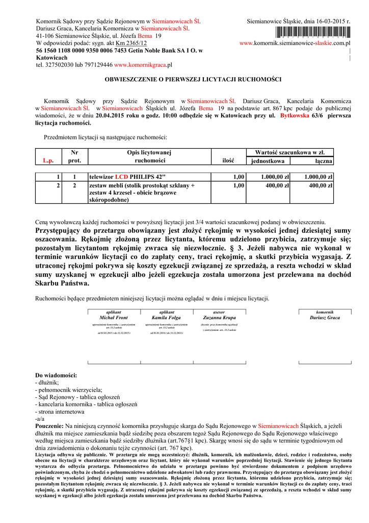 Siemianowice Śląskie, dnia 16-03-2015 r. Komornik Sądowy przy Sądzie Rejonowym w Siemianowicach Śl. Dariusz Graca, Kancelaria Komornicza w Siemianowicach Śl. 41-106 Siemianowice Śląskie, ul. Józefa Bema 19 W odpowiedzi podać: sygn. akt Km 2365/12 56 1560 1108 0000 9350 0006 7453 Getin Noble Bank SA I O. w Katowicach tel. 327502030 lub 797129446 www.komornikgraca.pl *8015031600135* www.komornik.siemianowice-slaskie.com.pl | | OBWIESZCZENIE O PIERWSZEJ LICYTACJI RUCHOMOŚCI Komornik Sądowy przy Sądzie Rejonowym w Siemianowicach Śl. Dariusz Graca, Kancelaria Komornicza w Siemianowicach Śl. w Siemianowicach Śląskich ul. Józefa Bema 19 na podstawie art. 867 kpc podaje do publicznej wiadomości, że w dniu 20.04.2015 roku o godz. 10:00 odbędzie się w Katowicach przy ul. Bytkowska 63/6 pierwsza licytacja ruchomości. Przedmiotem licytacji są następujące ruchomości: Nr prot. L.p. 1 2 1 2 Opis licytowanej ruchomości ilość telewizor LCD PHILIPS 42'' zestaw mebli (stolik prostokąt szklany + zestaw 4 krzeseł - obicie brązowe skóropodobne) 1,00 1,00 Wartość szacunkowa w zł. jednostkowa łączna 1.000,00 zł 400,00 zł 1.000,00 zł 400,00 zł Ceną wywoławczą każdej ruchomości w powyższej licytacji jest 3/4 wartości szacunkowej podanej w obwieszczeniu. Przystępujący do przetargu obowiązany jest złożyć rękojmię w wysokości jednej dziesiątej sumy oszacowania. Rękojmię złożoną przez licytanta, któremu udzielono przybicia, zatrzymuje się; pozostałym licytantom rękojmię zwraca się niezwłocznie. § 3. Jeżeli nabywca nie wykonał w terminie warunków licytacji co do zapłaty ceny, traci rękojmię, a skutki przybicia wygasają. Z utraconej rękojmi pokrywa się koszty egzekucji związanej ze sprzedażą, a reszta wchodzi w skład sumy uzyskanej w egzekucji albo jeżeli egzekucja została umorzona jest przelewana na dochód Skarbu Państwa. Ruchomości będące przedmiotem niniejszej licytacji można oglądać w dniu i miejscu licytacji. aplikant aplikant asesor komornik Michał Front Kamila Folga Zuzanna Krupa Dariusz Graca upoważnienie komornika z zastrzeżeniem art. 33.2 uoksie upoważnienie komornika z zastrzeżeniem art. 33.2 uoksie zlecenie przez komornika egzekucji od 01.01.2015 r do 31.12.2015 r od 01.01.2014 r do 31.12.2014 r z zastrzeżeniem art.. 33.2 uoksie Do wiadomości: - dłużnik; - pełnomocnik wierzyciela; - Sąd Rejonowy - tablica ogłoszeń - kancelaria komornika - tablica ogłoszeń - strona internetowa -a/a Pouczenie: Na niniejszą czynność komornika przysługuje skarga do Sądu Rejonowego w Siemianowicach Śląskich, a jeżeli dłużnik ma miejsce zamieszkania bądź siedzibę poza obszarem tegoż Sądu Rejonowego do Sądu Rejonowego właściwego według miejsca zamieszkania bądź siedziby dłużnika (art.767§1 kpc). Skargę wnosi się do sądu w terminie tygodniowym od dnia zawiadomienia o dokonaniu tejże czynności (art. 767 kpc). Licytacja odbywa się publicznie. W przetargu nie mogą uczestniczyć: dłużnik, komornik, ich małżonkowie, dzieci, rodzice i rodzeństwo, osoby obecne na licytacji w charakterze urzędowym oraz licytant, który nie wykonał warunków poprzedniej licytacji. Stawienie się jednego licytanta wystarcza do odbycia przetargu. Pełnomocnictwo do udziału w przetargu powinno być stwierdzone dokumentem z podpisem urzędowo poświadczonym, chyba że chodzi o pełnomocnictwo udzielone adwokatowi lub radcy prawnemu. Przystępujący do przetargu obowiązany jest złożyć rękojmię w wysokości jednej dziesiątej sumy oszacowania. Rękojmię złożoną przez licytanta, któremu udzielono przybicia, zatrzymuje się; pozostałym licytantom rękojmię zwraca się niezwłocznie. § 3. Jeżeli nabywca nie wykonał w terminie warunków licytacji co do zapłaty ceny, traci rękojmię, a skutki przybicia wygasają. Z utraconej rękojmi pokrywa się koszty egzekucji związanej ze sprzedażą, a reszta wchodzi w skład sumy uzyskanej w egzekucji albo jeżeli egzekucja została umorzona jest przelewana na dochód Skarbu Państwa.