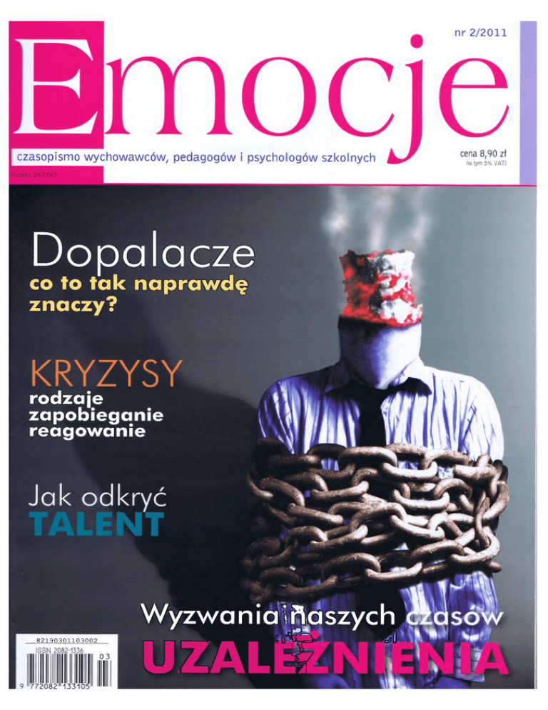 Dopalacze co to tak naprawdę znaczy? rodzaje zapobieganie reagowanie W y z w ą n i a ń a szyc h 82190301103002 UZALRN t-Hm A Aktualne tematy 4 Skala uzależnienia w Polsce - fakty i liczby • Bożena Wołoszyn Uzależnienia wyzwaniem naszych czasów • rozmowa z Jolantą Terlikowską 10 Emocje do głosu! Szanowni Czytelnicy, Pytania 14 Dopalacze • Michał Strefnel A. B. C to już wiem 19 22 Uzależnienie • Jacek Dąbrowski Ale o co chodzi...? - czyli uzależnienia a cele życiowe • Mariusz Wilk 24 System rekomendacji programów profilaktycznych • Tomasz Uniszewski 26 Profilaktyka dziś • Agnieszka Kowalczyk Praktyka 28 32 36 Kryzysy - jak sobie z nimi radzić? • Katarzyna Pankowska-Koc Rok Odkrywania Talentów, czyli polska szkoła na drodze do ideału • rozmowa z Aleksandrą Kowalik i Jarosławem Jankowskim Geniusz i co dalej... • Agnieszka Pomianowska To ciekawo 3 7 „Szczęściem jest, gdy nasze myśli mogą stać się słowami" - czyli słów kilka o jąkaniu • Dorota Kamińska Moje porażki, sukcesy 38 Krótki film o zabijaniu - opowieść o Waldku • Ryszard Makowski 40 Koniec bezradności • Marta Makowiecka Wyniki badań dotyczących uzależnień są alarmujące: wiek inicjacji narkotykowej wśród młodzieży zagrożonej wykluczeniem społecznym to w przypadku chłopców 11-13 lat, natomiast w przypadku dziewcząt 13-15 lat. Czy to nie przeraża? Jak sobie poradzić w tej sytuacji? Jakie zastosować programy profilaktyczne, aby przyniosły efekty? Co możemy zrobić my, nauczyciele? Na pewno dużo. To nie truizm - przekonuje nas w swoim artykule Marta Makowiecka. Sytuację dzieci w rodzinach, w których rodzice walczą z uzależnieniem, ciekawie opisuje Mariusz Wilk. Niestety bajki nie zawsze dobrze się kończą i smoki, czyli uzależnienia, zwyciężają, swym oddechem zatruwając nie tylko rycerzy, ale i całą okolicę. Walczyć i wierzyć w szczęśliwe zakończenie jednak trzeba, czego dowodzi film Jak zostać królem (The Kings Speech, 2010), który niedawno wszedł na ekrany kin. Ta filmowa opowieść o królu Jerzym VI i jego walce z jąkaniem nie bez powodu została obsypana licznymi nagrodami. Jest to niezwykły film o walce z własną słabością w imię obowiązku i odpowiedzialności. A także o nauczycielu, który wierzy w swoją metodę i w ucznia. Emocje grają w nim niebagatelną rolę. Zapraszamy Państwa do współtworzenia „Emocji". Przygotowaliśmy rubrykę „Moje porażki, sukcesy". To miejsce dla naszych Czytelników, to tutaj będziemy drukować prawdziwe historie i opowieści. To miejsce dla Państwa! Katarzyna Szczepkowska Redakcja: Katarzyna Szczepkowska (redaktor prowadząca), [email protected], Bernadeta Stępień (korekta) Komitet redakcyjny: Tomasz Garstka, Małgorzata Pomianowska, Beata Rola Adres redakcj: 01 - 1 9 4 Warszawa, u l Młynarska 8/12, teŁ 22 244 84 75, fa* 22 244 84 76 Wydawca: Dr Josef Raabe Spółka Wydawnicza Sp.zo.a, uL Młynarska 8 / 1 2 , 0 1 - 1 9 4 Warszawa, teL 22 244 8 4 0 0 , fax 22 244 8 4 10, NIP 526-13-49-514, REGON 011864960, SĄD REJONOWY DLA MST. W-WY, XII WYDZIAŁ GOSPODARCZY, KRS 0000118704, WYSOKOŚĆ KAPITAŁU ZAKŁADOWEGO 50 0 0 0 PLN Prezes zarządu: Michał Włodarczyk Dyrektor wydawniczy i redaktor naczelny: Józef Szewczyk, tel. 22 244 84 70, fax 22 244 84 76, [email protected] Dział obsługi klienta: [email protected], tel. 22 244 84 11, fax 22 244 8 4 10 Dyrektor marketingu: Anna Gryczewska, [email protected] Kolportaż Anna Niepiekło, tel. 22 244 84 78, fax 22 244 84 76, [email protected] Reklama: Andrzej Idziak. tel. 22 244 84 77, fax 22 244 84 76, kom. 692 277 761, [email protected] Skład i łamanie: Vega design, www.vegadesigapl Druk i oprawa: Pabianickie Zakłady Graficzne SA, 95-200 Pabianice, ul. Piotra Skargi 40/42 • Redakcja nie zwraca nadesłanych materiałów. Zastrzega sobie prawo do ich zredagowania, skracania, zmiany tytułów, wprowadzenia śródtytułów. Autor, przekazując tekst do redakcji, zgadza się na przeniesienie praw autorskich na wydawcę. Zapraszamy d o o d w i e d z e n i a naszej strony w Internecie www.edupress.pl marzec/kwiecień 2011 • 3 T o ciekawe Dorota KAMIŃSKA ilmowa opowieść o królu Jerzym VI i jego walce z jąkaniem nie bez powodu zdobyła aż 7 nagród BAFTA (Brytyjskiej Akademii Filmowej) i 4 Oscary, w tym za najlepszy film i najlepszego aktora. Odtwórca głównej roli brytyjskiego monarchy, Colin Firth, otrzymał również nagrodę Złoty Glob dla najlepszego aktora, przyznawaną przez Hollywoodzkie Stowarzyszenie Prasy Zagranicznej. Jak zostać królem (The King's Speech, 2010) to druga jak dotychczas filmowa opowieść o trudnym życiu króla Jerzego VI. Warto nadmienić, że w filmie zaprezentowane zostało oryginalne przemówienie króla, zarejestrowane przez brytyjską telewizję w dniu przystąpienia Anglii do 11 wojny światowej. Ta wzruszająca historia o przeżyciach osoby jąkającej się, skupiona głównie na pokazaniu jej słabości i problemu jąkania, w końcowej scenie ukazuje nam wielki sukces, jakim było publiczne wygłoszenie przez księcia Alberta oficjalnej przemowy. Stanowi również potwierdzenie tego, że osoby jąkające się są obdarzone dużą spontanicznością i emocjonalnością, jednak w obliczu swoich problemów cierpliwie czekają na moment, kiedy będą mogły „podzielić się sobą ze światem". Ich determinacja i ogromna motywacja w walce ze swoimi problemami często porównywana jest do pokonywania kolejnych „szczebelków drabiny", która prowadzi do sukcesu na miarę ich indywidualnych możliwości, w postaci płynnej mowy i dobrych relacji interpersonalnych. Przez pryzmat problemów brytyjskiego monarchy dostrzegamy rangę problemów, z jakimi muszą radzić sobie osoby jąkające się. Najtrudniejsze jest jednak w ich przypadku dotarcie do prawdy o samym sobie, odnalezienie w sobie przyczyn swoich problemów związanych z jąkaniem się oraz próba ich przezwyciężenia. Ten, 