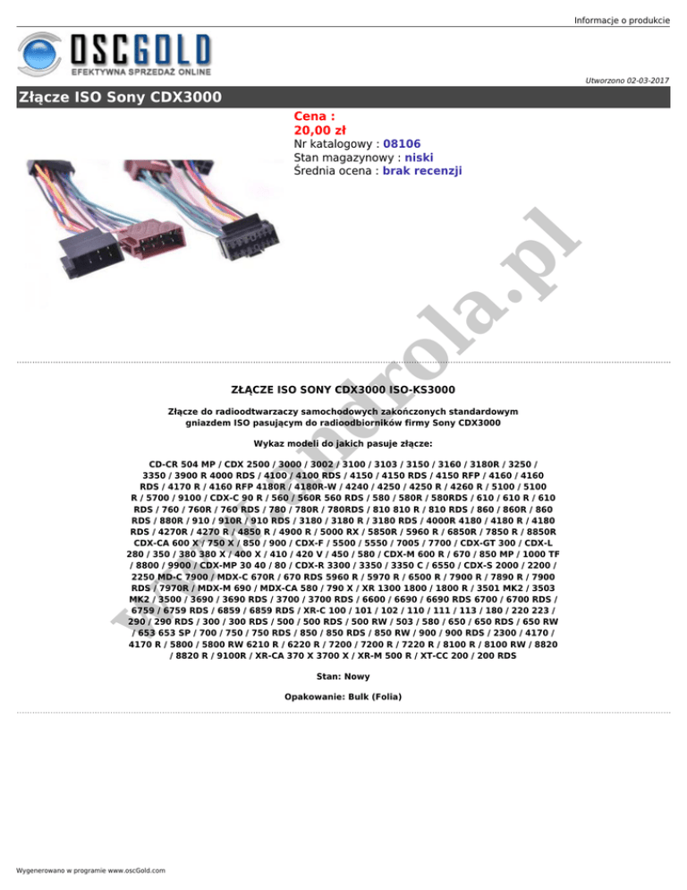 Informacje o produkcie Utworzono 02-03-2017 Złącze ISO Sony CDX3000 Cena : 20,00 zł ro la .p l Nr katalogowy : 08106 Stan magazynowy : niski Średnia ocena : brak recenzji ZŁĄCZE ISO SONY CDX3000 ISO-KS3000 nd Złącze do radioodtwarzaczy samochodowych zakończonych standardowym gniazdem ISO pasującym do radioodbiorników firmy Sony CDX3000 Wykaz modeli do jakich pasuje złącze: w w w .a CD-CR 504 MP / CDX 2500 / 3000 / 3002 / 3100 / 3103 / 3150 / 3160 / 3180R / 3250 / 3350 / 3900 R 4000 RDS / 4100 / 4100 RDS / 4150 / 4150 RDS / 4150 RFP / 4160 / 4160 RDS / 4170 R / 4160 RFP 4180R / 4180R-W / 4240 / 4250 / 4250 R / 4260 R / 5100 / 5100 R / 5700 / 9100 / CDX-C 90 R / 560 / 560R 560 RDS / 580 / 580R / 580RDS / 610 / 610 R / 610 RDS / 760 / 760R / 760 RDS / 780 / 780R / 780RDS / 810 810 R / 810 RDS / 860 / 860R / 860 RDS / 880R / 910 / 910R / 910 RDS / 3180 / 3180 R / 3180 RDS / 4000R 4180 / 4180 R / 4180 RDS / 4270R / 4270 R / 4850 R / 4900 R / 5000 RX / 5850R / 5960 R / 6850R / 7850 R / 8850R CDX-CA 600 X / 750 X / 850 / 900 / CDX-F / 5500 / 5550 / 7005 / 7700 / CDX-GT 300 / CDX-L 280 / 350 / 380 380 X / 400 X / 410 / 420 V / 450 / 580 / CDX-M 600 R / 670 / 850 MP / 1000 TF / 8800 / 9900 / CDX-MP 30 40 / 80 / CDX-R 3300 / 3350 / 3350 C / 6550 / CDX-S 2000 / 2200 / 2250 MD-C 7900 / MDX-C 670R / 670 RDS 5960 R / 5970 R / 6500 R / 7900 R / 7890 R / 7900 RDS / 7970R / MDX-M 690 / MDX-CA 580 / 790 X / XR 1300 1800 / 1800 R / 3501 MK2 / 3503 MK2 / 3500 / 3690 / 3690 RDS / 3700 / 3700 RDS / 6600 / 6690 / 6690 RDS 6700 / 6700 RDS / 6759 / 6759 RDS / 6859 / 6859 RDS / XR-C 100 / 101 / 102 / 110 / 111 / 113 / 180 / 220 223 / 290 / 290 RDS / 300 / 300 RDS / 500 / 500 RDS / 500 RW / 503 / 580 / 650 / 650 RDS / 650 RW / 653 653 SP / 700 / 750 / 750 RDS / 850 / 850 RDS / 850 RW / 900 / 900 RDS / 2300 / 4170 / 4170 R / 5800 / 5800 RW 6210 R / 6220 R / 7200 / 7200 R / 7220 R / 8100 R / 8100 RW / 8820 / 8820 R / 9100R / XR-CA 370 X 3700 X / XR-M 500 R / XT-CC 200 / 200 RDS Stan: Nowy Opakowanie: Bulk (Folia) Wygenerowano w programie www.oscGold.com