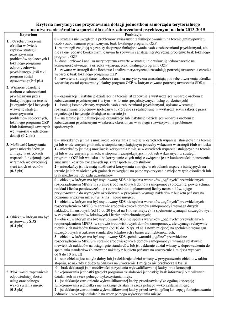 Kryteria merytoryczne przyznawania dotacji jednostkom samorządu terytorialnego na utworzenie ośrodka wsparcia dla osób z zaburzeniami psychicznymi na lata 2013-2015 Kryterium 1. Potrzeba utworzenia ośrodka w świetle zapisów strategii rozwiązywania problemów społecznych i lokalnego programu ochrony zdrowia psychicznego, jeśli taki program został opracowany (0-4 pkt) 2. Wsparcie udzielane osobom z zaburzeniami psychicznymi przez funkcjonujące na terenie jst organizacje i instytucje w świetle strategii rozwiązywania problemów społecznych, lokalnego programu OZP i/lub informacji zawartych we wniosku o udzielenie dotacji (0-2 pkt) 3. Możliwość korzystania przez mieszkańców jst z miejsc w ośrodkach wsparcia funkcjonujących w ramach wojewódzkiej sieci takich ośrodków (0-2 pkt) 4. Obiekt, w którym ma być usytuowany ŚDS (0-4 pkt) 5. Możliwości zapewnienia odpowiedniej jakości usług oraz pełnego wykorzystania miejsc (0-3 pkt) Punktacja 0 – strategia nie uwzględnia problemów związanych z funkcjonowaniem na terenie gminy/powiatu osób z zaburzeniami psychicznymi; brak lokalnego programu OZP 1– w strategii znajdują się zapisy dotyczące funkcjonowania osób z zaburzeniami psychicznymi, ale nie są one poparte konkretnymi danymi liczbowymi i analizą merytoryczną problemu; brak lokalnego programu OZP 2– dane liczbowe i analiza merytoryczna zawarte w strategii nie wskazują jednoznacznie na konieczność utworzenia ośrodka wsparcia; brak lokalnego programu OZP 3 – zawarte w strategii dane liczbowe i analiza merytoryczna uzasadniają potrzebę utworzenia ośrodka wsparcia; brak lokalnego programu OZP 4 - zawarte w strategii dane liczbowe i analiza merytoryczna uzasadniają potrzebę utworzenia ośrodka wsparcia; został opracowany lokalny program OZP, w którym zawarto potrzebę utworzenia ŚDS-u 0 – organizacje i instytucje działające na terenie jst zapewniają wystarczające wsparcie osobom z zaburzeniami psychicznymi ( w tym – w formie specjalistycznych usług opiekuńczych) 1 – istnieją istotne obszary wsparcia osób z zaburzeniami psychicznymi, opisane w strategii rozwiązywania problemów społecznych, które nie są realizowane w wystarczającym zakresie przez organizacje i instytucje działające na terenie jst 2 – na terenie jst nie funkcjonują organizacje lub instytucje udzielające wsparcia osobom z zaburzeniami psychicznymi w zakresie określonym w strategii rozwiązywania problemów społecznych 0 – mieszkańcy jst mają możliwość korzystania z miejsc w ośrodkach wsparcia istniejących na terenie jst lub w ościennych gminach, w stopniu zaspokajającym potrzeby wskazane w strategii i/lub wniosku 1 – mieszkańcy jst mają możliwość korzystania z miejsc w ośrodkach wsparcia istniejących na terenie jst lub w ościennych gminach, w stopniu niezaspokajającym potrzeb wskazanych w strategii, programie OZP lub wniosku albo korzystanie z tych miejsc związane jest z koniecznością ponoszenia znacznych kosztów związanych np. z transportem uczestników 2 – mieszkańcy jst nie mają możliwości korzystania z miejsc w ośrodkach wsparcia istniejących na terenie jst lub w ościennych gminach ze względu na pełne wykorzystanie miejsc w tych ośrodkach lub brak możliwości dojazdu uczestników 0 – obiekt, w którym ma być usytuowany ŚDS nie spełnia warunków „ogólnych” przewidzianych rozporządzeniem MPiPS w sprawie środowiskowych domów samopomocy (otoczenie, powierzchnia, rozkład i liczba pomieszczeń, itp.) odpowiednio do planowanej liczby uczestników, a jego przystosowanie do wymogów określonych w przepisach wymaga nakładów z budżetu państwa na poziomie wyższym niż 20 tys. zł na 1 nowe miejsce; 1 – obiekt, w którym ma być usytuowany ŚDS nie spełnia warunków „ogólnych” przewidzianych rozporządzeniem MPiPS w sprawie środowiskowych domów samopomocy i wymaga dużych nakładów finansowych (od 15 do 20 tys. zł na 1 nowe miejsce) na spełnienie wymagań szczegółowych w zakresie standardów lokalowych i barier architektonicznych; 2 – obiekt, w którym ma być usytuowany ŚDS nie spełnia warunków „ogólnych” przewidzianych rozporządzeniem MPiPS w sprawie środowiskowych domów samopomocy, ale wymaga relatywnie niewielkich nakładów finansowych (od 10 do 15 tys. zł na 1 nowe miejsce) na spełnienie wymagań szczegółowych w zakresie standardów lokalowych i barier architektonicznych; 3 – obiekt, w którym ma być usytuowany ŚDS spełnia warunki „ogólne” przewidziane rozporządzeniem MPiPS w sprawie środowiskowych domów samopomocy i wymaga relatywnie niewielkich nakładów na osiągnięcie standardów lub jst deklaruje udział własny w doprowadzeniu do spełniania standardów (planowane nakłady z budżetu państwa na utworzenie 1 miejsca wynoszą od 8 do 10 tys. zł) 4 – stan obiektu jest na tyle dobry lub jst deklaruje udział własny w przygotowaniu obiektu w takim stopniu, że nakłady z budżetu państwa na utworzenie 1 miejsca nie przekroczą 8 tys. zł 0 – brak deklaracji jst o możliwości pozyskania wykwalifikowanej kadry, brak koncepcji funkcjonowania jednostki (projekt programu działalności jednostki); brak informacji o możliwych działaniach na rzecz pełnego wykorzystania miejsc 1 – jst deklaruje zatrudnienie wykwalifikowanej kadry, przedstawia tylko ogólną koncepcję funkcjonowania jednostki i nie wskazuje działań na rzecz pełnego wykorzystania miejsc 2 – jst deklaruje zatrudnienie wykwalifikowanej kadry, przedstawia ogólną koncepcję funkcjonowania jednostki i wskazuje działania na rzecz pełnego wykorzystania miejsc 3 – jst deklaruje zatrudnienie wykwalifikowanej kadry, przedstawia klarowną koncepcję funkcjonowania jednostki ze wskazaniem konkretnych rozwiązań organizacyjnych oraz planowanych form wsparcia i sposobów ich realizacji oraz wskazuje konkretne sposoby działań na rzecz pełnego wykorzystania miejsc