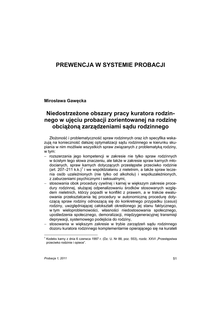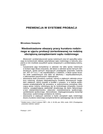 NiedostrzeŜone obszary pracy kuratora rodzinnego... PREWENCJA W SYSTEMIE PROBACJI Mirosława Gawęcka NiedostrzeŜone obszary pracy kuratora rodzinnego w ujęciu probacji zorientowanej na rodzinę obciąŜoną zarządzeniami sądu rodzinnego ZłoŜoność i problematyczność spraw rodzinnych oraz ich specyfika wskazują na konieczność dalszej optymalizacji sądu rodzinnego w kierunku skupiania w nim moŜliwie wszystkich spraw związanych z problematyką rodziny, w tym: − rozszerzania jego kompetencji w zakresie nie tylko spraw rodzinnych w ścisłym tego słowa znaczeniu, ale takŜe w zakresie spraw karnych młodocianych, spraw karnych dotyczących przestępstw przeciwko rodzinie (art. 207–211 k.k.)1 i we współdziałaniu z nieletnim, a takŜe spraw leczenia osób uzaleŜnionych (nie tylko od alkoholu) i współuzaleŜnionych, z zaburzeniami psychicznymi i seksualnymi, − stosowania obok procedury cywilnej i karnej w większym zakresie procedury rodzinnej, słuŜącej odpenalizowaniu środków stosowanych względem nieletnich, którzy popadli w konflikt z prawem, a w trakcie ewaluowania przekształcania tej procedury w autonomiczną procedurę dotyczącą spraw rodziny odnoszącą się do konkretnego przypadku (casus) rodziny, uwzględniającej całokształt określonego jej stanu faktycznego, w tym wieloproblemowości, własności niedostosowania społecznego, upośledzenia społecznego, demoralizacji, międzygeneracyjnej transmisji deprywacji, systemowego podejścia do rodziny, − stosowania w większym zakresie w trybie zarządzeń sądu rodzinnego dozoru kuratora rodzinnego komplementarnie opierającego się na kurateli 1 Kodeks karny z dnia 6 czerwca 1997 r. (Dz. U. Nr 88, poz. 553), rozdz. XXVI „Przestępstwa przeciwko rodzinie i opiece”. Probacja 1, 2011 51 M. Gawęcka kontrolującej i wspierającej konkretną rodzinę, w której zagroŜone jest dobro dziecka oraz łamane są zasady współŜycia społecznego. W systemie obowiązującego prawa rodzinnego centralną figurą jest dziecko, w tym sensie, Ŝe w kształtowaniu stosunków rodzinnych jego interes stanowi czynnik nadrzędny stanowiący obowiązujące wskazanie zarówno dla ustawodawcy, jak i organów stosujących prawo, a przede wszystkim jego rodziców. ZałoŜenie to określa się jako zasadę dobra dziecka. W praktyce orzeczniczej przyjmuje się, iŜ „dobro dziecka” oznacza prawidłowy jego rozwój psychofizyczny i duchowy2. Rozwój taki i warunki do takiego rozwoju najpełniej zapewnia dziecku rodzina (naturalna), a stąd wynika stosunek prawny łączący bezpośrednio rodziców z dzieckiem, a mianowicie: − dziecko pozostaje aŜ do osiągnięcia pełnoletności pod władzą rodzicielską, − powstaje ona z chwilą narodzenia dziecka i trwa do ukończenia przez nie 18 roku Ŝycia, − stanowi ona szczególnego rodzaju wieź prawną między rodzicami a dzieckiem, której treścią jest przede wszystkim: • obowiązek i prawo wychowywania dziecka przez rodziców z poszanowaniem jego praw i godności osobistej, • dbałość rodziców o zabezpieczenie interesów dziecka i pełny harmonijny jego rozwój, • takie wykonywanie przez nich władzy rodzicielskiej, jak tego wymaga jego dobro i interes społeczny. Stosunkowo pełną definicję władzy rodzicielskiej przedstawia K. Gromek3, bowiem przyjmuje ona, Ŝe władza rodzicielska jest to stosunek prawny łączący bezpośrednio rodziców z małoletnim dzieckiem w ten sposób, Ŝe przyznaje on rodzicom konglomerat praw i obowiązków względem dziecka w zakresie pieczy, reprezentacji i zarządu majątkiem dziecka, powiązanych funkcjonalnie z procesem jego wychowania oraz łączący pośrednio rodziców i dziecko z innymi podmiotami prawa, usystematyzowany zgodnie z zasadą dobra dziecka i interesu społecznego. Wskazując na powyŜszą definicję władzy rodzicielskiej, naleŜy podkreślić, powołując się na orzecznictwo (WSA w Warszawie z dnia 10 lutego 2005 r., IISA/Wa 1475/05), Ŝe treść władzy rodzicielskiej jest róŜna od jej wykonywania, a samo posiadanie władzy rodzicielskiej nie oznacza jej wykonywania. Wykonywanie władzy rodzicielskiej oznacza, Ŝe rodzice osobiście zajmują się sprawami dziecka. Wykonują ją osobiście w ten sposób, Ŝe zapewniają dziecku prawidłowy rozwój. W rozumieniu definicji władzy rodzicielskiej pro2 3 K. G r o m e k, Kuratorzy sądowi. Komentarz do ustawy z dnia 27 lipca 2001 r., Warszawa 2005, s. 64. K. G r o m e k, Kodeks rodzinny i opiekuńczy. Komentarze, Warszawa 2009, s. 1385. 52 Probacja 1, 2011 NiedostrzeŜone obszary pracy kuratora rodzinnego... ces wychowania odpowiada w języku prawa pieczy nad dzieckiem w szerokim rozumieniu działań opiekuńczo-wychowawczych (gdzie opieka jest funkcją zaspakajania potrzeb dziecka, wychowanie zaś funkcją wartości). Stąd zadaniem wychowania w rodzinie jest odpowiednie motywowanie dziecka przez rodziców do tego, aby odpowiednio wartościowało siebie i Ŝyło wartościowo, zadaniem zaś opieki, by tak Ŝyć mogło4. Co prawda, artykuł 48 Konstytucji RP zapewnia rodzicom pierwszeństwo i autonomię w wykonywaniu władzy rodzicielskiej, jednak w razie stwierdzenia nieprawidłowości w jej wykonywaniu kodeks rodzinny i opiekuńczy (dalej KRO) przewiduje sądową ingerencję w jej sprawowanie. Podstawę tej ingerencji stanowi ustawowa przesłanka zagroŜenia „dobra dziecka”. Z uwagi na przesłankę zagroŜenia dobra dziecka sąd opiekuńczy wydaje odpowiednie zarządzenia. Stąd zgodnie z art. 109 KRO sąd opiekuńczy moŜe w szczególności: − zobowiązać rodziców oraz małoletniego do określonego postępowania lub skierować rodziców do placówek albo specjalistów zajmujących się terapią rodzinną, poradnictwem lub świadczących rodzinie inną stosowną pomoc z jednoczesnym wskazaniem kontroli wykonania wydanych zarządzeń, − określić, jakie czynności nie mogą być przez rodziców dokonane bez zezwolenia sądu, albo poddać rodzi