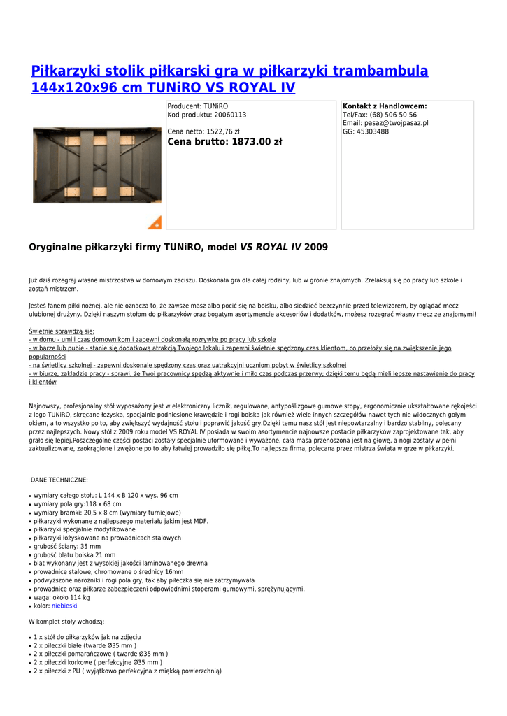 Piłkarzyki stolik piłkarski gra w piłkarzyki trambambula 144x120x96 cm TUNiRO VS ROYAL IV Producent: TUNiRO Kod produktu: 20060113 Cena netto: 1522,76 zł Kontakt z Handlowcem: Tel/Fax: (68) 506 50 56 Email: [email protected] GG: 45303488 Cena brutto: 1873.00 zł Oryginalne piłkarzyki firmy TUNiRO, model VS ROYAL IV 2009 Już dziś rozegraj własne mistrzostwa w domowym zaciszu. Doskonała gra dla całej rodziny, lub w gronie znajomych. Zrelaksuj się po pracy lub szkole i zostań mistrzem. Jesteś fanem piłki nożnej, ale nie oznacza to, że zawsze masz albo pocić się na boisku, albo siedzieć bezczynnie przed telewizorem, by oglądać mecz ulubionej drużyny. Dzięki naszym stołom do piłkarzyków oraz bogatym asortymencie akcesoriów i dodatków, możesz rozegrać własny mecz ze znajomymi! Świetnie sprawdzą się: - w domu - umili czas domownikom i zapewni doskonałą rozrywkę po pracy lub szkole - w barze lub pubie - stanie się dodatkową atrakcją Twojego lokalu i zapewni świetnie spędzony czas klientom, co przełoży się na zwiększenie jego popularności - na świetlicy szkolnej - zapewni doskonale spędzony czas oraz uatrakcyjni uczniom pobyt w świetlicy szkolnej - w biurze, zakładzie pracy - sprawi, że Twoi pracownicy spędzą aktywnie i miło czas podczas przerwy; dzięki temu będą mieli lepsze nastawienie do pracy i klientów Najnowszy, profesjonalny stół wyposażony jest w elektroniczny licznik, regulowane, antypoślizgowe gumowe stopy, ergonomicznie ukształtowane rękojeści z logo TUNiRO, skręcane łożyska, specjalnie podniesione krawędzie i rogi boiska jak również wiele innych szczegółów nawet tych nie widocznych gołym okiem, a to wszystko po to, aby zwiększyć wydajność stołu i poprawić jakość gry.Dzięki temu nasz stół jest niepowtarzalny i bardzo stabilny, polecany przez najlepszych. Nowy stół z 2009 roku model VS ROYAL IV posiada w swoim asortymencie najnowsze postacie piłkarzyków zaprojektowane tak, aby grało się lepiej.Poszczególne części postaci zostały specjalnie uformowane i wyważone, cała masa przenoszona jest na głowę, a nogi zostały w pełni zaktualizowane, zaokrąglone i zwężone po to aby łatwiej prowadziło się piłkę.To najlepsza firma, polecana przez mistrza świata w grze w piłkarzyki. DANE TECHNICZNE: ● ● ● ● ● ● ● ● ● ● ● ● ● ● wymiary całego stołu: L 144 x B 120 x wys. 96 cm wymiary pola gry:118 x 68 cm wymiary bramki: 20,5 x 8 cm (wymiary turniejowe) piłkarzyki wykonane z najlepszego materiału jakim jest MDF. piłkarzyki specjalnie modyfikowane piłkarzyki łożyskowane na prowadnicach stalowych grubość ściany: 35 mm grubość blatu boiska 21 mm blat wykonany jest z wysokiej jakości laminowanego drewna prowadnice stalowe, chromowane o średnicy 16mm podwyższone narożniki i rogi pola gry, tak aby piłeczka się nie zatrzymywała prowadnice oraz piłkarze zabezpieczeni odpowiednimi stoperami gumowymi, sprężynującymi. waga: około 114 kg kolor: niebieski W komplet stoły wchodzą: ● ● ● ● ● 1 x stół do piłkarzyków jak na zdjęciu 2 x piłeczki białe (twarde Ø35 mm ) 2 x piłeczki pomarańczowe ( twarde Ø35 mm ) 2 x piłeczki korkowe ( perfekcyjne Ø35 mm ) 2 x piłeczki z PU ( wyjątkowo perfekcyjna z miękką powierzchnią) ● ● ● ● ● ● ● ● 2 x liczniki ręczne na strzelone gole 1 x Płyta Tuniro oryginalna 6 x postacie zapasowych piłkarzyków po 3 szt. z każdej drużyny 4 x dodatkowe łożyska 6 x stopery 4 x koszyki na pojemniki z płynem 1 x zestaw montażowy potrzebny do złożenia piłkarzyków GRATIS ORYGINALNA PŁYTA Z LEKCJAMI MISTRZA ŚWIATA JAK STAĆ SIĘ NAJLEPSZYM. Kod produktu:20060113 ID produktu:837 Granos Group sp. z o.o. ul. Sulechowska 4a budynek 45 65-001 Zielona Góra
