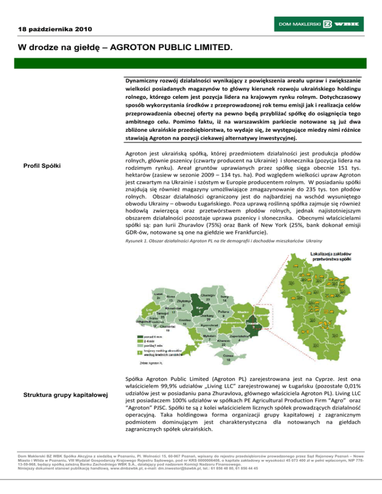 18 października 2010 W drodze na giełdę – AGROTON PUBLIC LIMITED. Dynamiczny rozwój działalności wynikający z powiększenia areału upraw i zwiększanie wielkości posiadanych magazynów to główny kierunek rozwoju ukraińskiego holdingu rolnego, którego celem jest pozycja lidera na krajowym rynku rolnym. Dotychczasowy sposób wykorzystania środków z przeprowadzonej rok temu emisji jak i realizacja celów przeprowadzenia obecnej oferty na pewno będą przybliżać spółkę do osiągnięcia tego ambitnego celu. Pomimo faktu, iż na warszawskim parkiecie notowane są już dwa zbliżone ukraińskie przedsiębiorstwa, to wydaje się, że występujące miedzy nimi różnice stawiają Agroton na pozycji ciekawej alternatywy inwestycyjnej. Profil Spółki Agroton jest ukraińską spółką, której przedmiotem działalności jest produkcja płodów rolnych, głównie pszenicy (czwarty producent na Ukrainie) i słonecznika (pozycja lidera na rodzimym rynku). Areał gruntów uprawianych przez spółkę sięga obecnie 151 tys. hektarów (zasiew w sezonie 2009 – 134 tys. ha). Pod względem wielkości upraw Agroton jest czwartym na Ukrainie i szóstym w Europie producentem rolnym. W posiadaniu spółki znajdują się również magazyny umożliwiające zmagazynowanie do 235 tys. ton płodów rolnych. Obszar działalności ograniczony jest do najbardziej na wschód wysuniętego obwodu Ukrainy – obwodu Ługańskiego. Poza uprawą roślinną spółka zajmuje się również hodowlą zwierzęcą oraz przetwórstwem płodów rolnych, jednak najistotniejszym obszarem działalności pozostaje uprawa pszenicy i słonecznika. Obecnymi właścicielami spółki są: pan Iurii Zhuravlov (75%) oraz Bank of New York (25%, bank dokonał emisji GDR-ów, notowane są one na giełdzie we Frankfurcie). Rysunek 1. Obszar działalności Agroton PL na tle demografii i dochodów mieszkańców Ukrainy Struktura grupy kapitałowej Spółka Agroton Public Limited (Agroton PL) zarejestrowana jest na Cyprze. Jest ona właścicielem 99,9% udziałów „Living LLC” zarejestrowanej w Ługańsku (pozostałe 0,01% udziałów jest w posiadaniu pana Zhuravlova, głównego właściciela Agroton PL). Living LLC jest posiadaczem 100% udziałów w spółkach PE Agricultural Production Firm “Agro” oraz “Agroton” PJSC. Spółki te są z kolei właścicielem licznych spółek prowadzących działalność operacyjną. Taka holdingowa forma organizacji grupy kapitałowej z zagranicznym podmiotem dominującym jest charakterystyczna dla notowanych na giełdach zagranicznych spółek ukraińskich. Dom Maklerski BZ WBK Spółka Akcyjna z siedzibą w Poznaniu, Pl. Wolności 15, 60-967 Poznań, wpisany do rejestru przedsiębiorców prowadzonego przez Sąd Rejonowy Poznań – Nowe Miasto i Wilda w Poznaniu, VIII Wydział Gospodarczy Krajowego Rejestru Sądowego, pod nr KRS 0000006408, o kapitale zakładowy w wysokości 45 073 400 zł w pełni wpłaconym, NIP 77813-59-968, będący spółką zaleŜną Banku Zachodniego WBK S.A., działający pod nadzorem Komisji Nadzoru Finansowego. Niniejszy dokument stanowi publikację handlową. www.dmbzwbk.pl, e-mail: [email protected], tel.: 61 856 48 80, 61 856 44 45 18 października 2010 Głównym przedmiotem działalności spółki jest uprawa ziemi. Spółka jest obecnie w posiadaniu 151 tys. hektarów ziemi rolnej (z czego w obecnym sezonie obsianych zostało 134 tys.). Zdecydowana większość tego areału przeznaczona jest pod uprawę pszenicy ozimej i słonecznika. Ze względu na konieczność stosowania płodozmianu spółka uprawia też kukurydzę oraz rośliny pastewne. Poboczne znaczenie ma również hodowla bydła i trzody chlewnej oraz dalsze przetwórstwo płodów rolnych. Zdecydowana większość przychodów generowanych jest ze sprzedaży pszenicy i słonecznika. Wykres 1. Struktura przychodów w latach 2007-2009 Działalność operacyjna Istotnym elementem strategii rynkowej spółki jest logistyczny aspekt sprzedaży płodów rolnych. Ze względu na sezonowość produkcji rolnej ceny zbóż spadają znacznie w okresie żniw, gdy ich podaż jest największa. W celu uniknięcia konieczności sprzedaży w okresie dołka cenowego Agroton wykorzystuje magazyny zbożowe przechowując zboże do momentu wzrostu ich ceny w późniejszej części roku. Pozwala to na osiągnięcie znacznie wyższej rentowności działalności. Posiadana przez Agroton kubatura magazynowa pozwala obecnie na przechowywanie 235 tys. ton zbóż. Warunki prowadzenia działalności rolnej Ukraina to obszar bardzo atrakcyjny rolniczo. Głównymi czynnikami wpływającymi na taki stan rzeczy są doskonałe warunki glebowe oraz stosunkowo niskie zagęszczenie ludności, powodujące że znaczna część obszaru kraju to obszar użytków rolnych (32,4 mln ha w stosunku do 11,3 mln ha w Polsce). W zakresie stosunków glebowych Ukraina posiada najżyźniejsze wśród dużych krajów gleby w Europie. Szacuje się, że między 30% a 40% europejskich czarnoziemów leży na terytorium tego kraju. Przyjazny uprawie roślin jest również klimat. Zalegająca długo pokrywa śnieżna sprzyja uprawie zbóż ozimych, w czym specjalizuje się właśnie Agroton. Rysunek1.Rozmieszczenie czarnoziemów w Europie i średnia głębokość warstw humusu Źródło: Agroton PL Dom Maklerski BZ WBK Spółka Akcyjna z siedzibą w Poznaniu, Pl. Wolności 15, 60-967 Poznań, wpisany do rejestru przedsiębiorców prowadzonego przez Sąd Rejonowy Poznań – Nowe Miasto i Wilda w Poznaniu, VIII Wydział Gospodarczy Krajowego Rejestru Sądowego, pod nr KRS 0000006408, o kapitale zakładowy w wysokości 45 073 400 zł w pełni wpłaconym, NIP 77813-59-968, będący spółką zaleŜną Banku Zachodniego WBK S.A., działający pod nadzorem Komisji Nadzoru Finansowego. Niniejszy dokument stanowi publikację handlową. www.dmbzwbk.pl, e-mail: [email protected], tel.: 61 856 48 80, 61 856 44 45 18 października 2010 Poziom rozwoju rolnictw