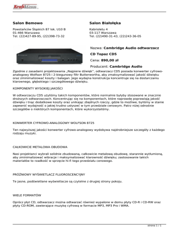 Salon Bemowo Salon Białołęka Powstańców Śląskich 87 lok. U10 B 01-466 Warszawa Tel. (22)427-89-95, (22)398-73-32 Kabrioletu 4 03-117 Warszawa Tel. (22)490-31-43, (22)243-36-05 Nazwa: Cambridge Audio odtwarzacz CD Topaz CD5 Cena: 890,00 zł Producent: Cambridge Audio Zgodnie z zasadami projektowania „Najpierw dźwięk”, odtwarzacz CD5 posiada konwerter cyfrowoanalogowy Wolfson 8725 i 2-biegunowy filtr Butterwortha, aby zmaksymalizować jakość dźwięku oraz zminimalizować koszty i bałagan. Jego wydajna konstrukcja koncentruje się na dostarczaniu klarownego, głębokiego i szczegółowego dźwięku. KOMPONENTY WYSOKIEJ JAKOŚCI W odtwarzaczu CD5 użyliśmy takich komponentów, które normalnie byłyby stosowane w znacznie droższych odtwarzaczach. Koncentrując się na komponentach, które naprawdę poprawiają jakość dźwięku i tnąc dodatkowe koszty oraz unikając zbędnych rzeczy, gdzie to możliwe, byliśmy w stanie zapewnić wydajność o jakiej trudno usłyszeć w tym przedziale cenowym. Patrz niżej odnośnie szczegółów o niektórych komponentach, które wykorzystaliśmy. KONWERTER CYFROWO-ANALOGOWY WOLFSON 8725 Ten najwyższej jakości konwerter cyfrowo-analogowy wydobywa najdrobniejsze szczegóły z każdego rodzaju muzyki. CAŁKOWICIE METALOWA OBUDOWA Nasi projektanci wybrali solidnie zbudowaną, całkowicie metalową obudowę, starannie wytłumioną, aby zminimalizować wibracje i maksymalizować klarowność dźwięku; zastosowanie takich materiałów to rzadkość w sprzęcie hi-fi tego przedziału cenowego. PRÓŻNIOWY WYŚWIETLACZ FLUOROSCENCYJNY Te jasne, podświetlane wyświetlacze są czytelne z drugiej strony pokoju. WIELE FORMATÓW Oprócz płyt CD, odtwarzacz można odtwarzać również wypalone w domu płyty CD-R i CD-RW oraz płyty CD-ROM, zawierające muzykę cyfrową w formacie MP3, MP3 Pro i WMA. strona 1 / 1 Powered by TCPDF (www.tcpdf.org)