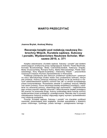 J. Brylak, A. WaŜny WARTO PRZECZYTAĆ Joanna Brylak, Andrzej WaŜny Recenzja ksiąŜki pod redakcją naukową Dobrochny Wójcik, Kuratela sądowa. Sukcesy i poraŜki, Wydawnictwo Naukowe Scholar, Warszawa 2010, s. 371 KsiąŜka zatytułowana „Kuratela sądowa. Sukcesy i poraŜki” jest dziełem zwieńczającym analityczną pracę następujących Autorów: Pawła Bachmata, Konrada Buczkowskiego, Beaty Czarneckiej-Dzialuk, Katarzyny Drapały, Beaty Gruszczyńskiej, Romana Kulmy, Marka Marczewskiego, Pawła Ostaszewskiego, Anny Więcek-Durańskiej i Dobrochny Wójcik – pracowników naukowych Instytutu Wymiaru Sprawiedliwości w Warszawie. Publikacja poświęcona jest obecnym problemom społecznym i prawnym na rzecz alternatywnego środka wobec kary pozbawienia wolności, którym jest probacja. Autorzy pokazują instytucję probacji na tle jej ewolucji w róŜnych ustawodawstwach systemu common law, jak i w ramach europejskiego prawa kontynentalnego. RozwaŜania zawarte w publikacji dotyczą refleksji nad celami probacji, mocno akcentują kwestię rehabilitacji przestępcy, udzielenie mu stosownej pomocy, obserwację jego zachowania – niejednokrotnie jego zmianę poprzez naleŜyty stosunek i ukierunkowanie działań przestępcy dla powrotu na prawowitą drogę. Autorzy podkreślają takŜe funkcję ochrony społeczeństwa przed przestępcą i przestępczością. Niemałą rolę w procesie oddziaływania instytucji probacji odgrywają organy wymiaru sprawiedliwości oraz instytucje powiązane. Pozycja „Kuratela sądowa. Sukcesy i poraŜki” ma charakter publikacji naukowej, prezentującej zbiór poglądów, dorobek specjalistów z dziedziny prawa rodzinnego, cywilnego, prawa karnego i postępowania karnego – 152 Probacja 4, 2011 Recenzja ksiąŜki pod redakcją naukową D. Wójcik... profesjonalistów wykorzystujących wiedzę prawniczą praktyczną i teoretyczną w swojej codziennej praktyce stosowania prawa. We wstępie Autorzy podkreślają wieloletnią tradycję kurateli w Polsce. Wskazują na pierwotne zamysły jej stosowania w trakcie postępowania sądowego oraz przy wykonaniu orzeczeń sądowych oraz późniejsze, wyraŜające się w pracy kuratora ze środowiskiem przestępcy, w społeczności lokalnej, do pracy z grupą, co w sposób zasadniczy zwiększa znaczenie probacji. Najbardziej rozwojowy okres dla kurateli przypada na okres powojenny. Istotne znaczenie w pojmowaniu roli kuratora wywarło rozszerzenie kręgu podmiotów uprawnionych do objęcia nadzorem kuratorskim. Początkowo była to kategoria nieletnich, w okresie późniejszym wprowadzono zmianę poprzez objęcie nadzorem kuratorskim równieŜ dorosłych. Ciągle wzrasta zapotrzebowanie na udział kuratorów w postępowaniach, podobnie jak liczba osób nabywających uprawnienia w tym zakresie. Publikacja przedstawia metodykę pracy kuratora z podopiecznymi, rozwiązywanie problemów poszczególnych przypadków, integrację społeczna i zadbanie o powrót socjalny podopiecznego. Autorzy wskazują teŜ na istniejące programy, zwłaszcza obejmujące przestępców wysokiego ryzyka oraz formy sprawowania wobec nich dozoru. Uwagę czytelnika zwraca takŜe część ksiąŜki poświęcona gamie problemów związanych z funkcjonowaniem kurateli w Polsce. Istotę tych zagadnień stanowi omówienie całościowe systemu probacji w naszym kraju, ocena perspektyw jej rozwoju oraz znaczenie resocjalizacji, diagnostyki i profilaktyki w pracy kuratora. KsiąŜka składa się z 9 tematycznie powiązanych rozdziałów, które kompleksowo przybliŜają Czytelnikowi wiedzę o probacji i instytucji kuratora sądowego. W rozdziale pierwszym, zatytułowanym „Podstawowe zadania kuratorów sądowych w ustawodawstwie polskim”, zarysowano ewolucję instytucji kuratora, wymieniając zasady obsady stanowisk kuratorskich i sposób organizacji samorządu kuratorskiego. Ta część ksiąŜki uwzględnia takŜe zasady odpowiedzialności porządkowej i dyscyplinarnej kuratorów zawodowych, przepisy regulujące odbywanie aplikacji kuratorskiej i omawia róŜnice między kuratorami zawodowymi oraz społecznymi. Ponadto, w pierwszym rozdziale publikacji zawarte są rozwaŜania odnośnie instytucji w myśl ustawy – Kodeks karny wykonawczy. Na tle tego poruszono zagadnienie wywiadu środowiskowego, podstaw i kontroli nad wykonaniem kary ograniczenia wolności i pracy społecznie uŜytecznej, podtrzymanie relacji ze skazanym w okresie przerwy w wykonaniu kary pozbawienia wolności, przygotowania skazanego do Ŝycia na wolności, problematykę dozorów oraz postępowań incydentalnych i uczestnictwa w posiedzeniach sądu. Rozdział pierwszy publikacji stanowi niejako wstęp wprowadzający w tematykę ksiąŜki. Probacja 4, 2011 153 J. Brylak, A. WaŜny W rozdziale drugim, noszącym tytuł „Podstawowe zadania kuratorów sądowych w ustawodawstwie polskim”, zawarto głębsze rozwaŜania w przedmiocie ewolucji instytucji kuratora, specyfiki kuratorów zawodowych i społecznych, metodyki pozyskiwania uprawnień do sprawowania kurateli, podstaw odpowiedzialności dyscyplinarnej i porządkowej kuratorów, kwestię wywiadu środowiskowego oraz dozoru. Ponadto, w tym rozdziale dokonano analizy kwestii przygotowania skazanego do Ŝycia na wolności, kontroli jego zachowań oraz realizacji nałoŜonych na niego obowiązków w okresie próby bez orzeczonego dozoru. Rozdział stanowi takŜe o procedurze składania wniosków o wszczęcie postępowania incydentalnego oraz o uczestnictwie w posiedzeniach sądu. Rozdział trzeci, pt. „Statystyczny obraz kurateli w Polsce”, poświęcono stanowi zatrudnienia i wydatków budŜetowych na kuratelę, podstawom zatrudniania kuratorów społecznych, zawodowych, rodzinnych i dla dorosłych. Ta część ksiąŜki stanowi zbiór analiz dotyczących zadań spoczywających w gestii kuratorów i ich obciąŜenia sprawami przy uwzględnieniu liczby spraw i ich gatunku oraz usytuowania demograficznego. W czwartym roz