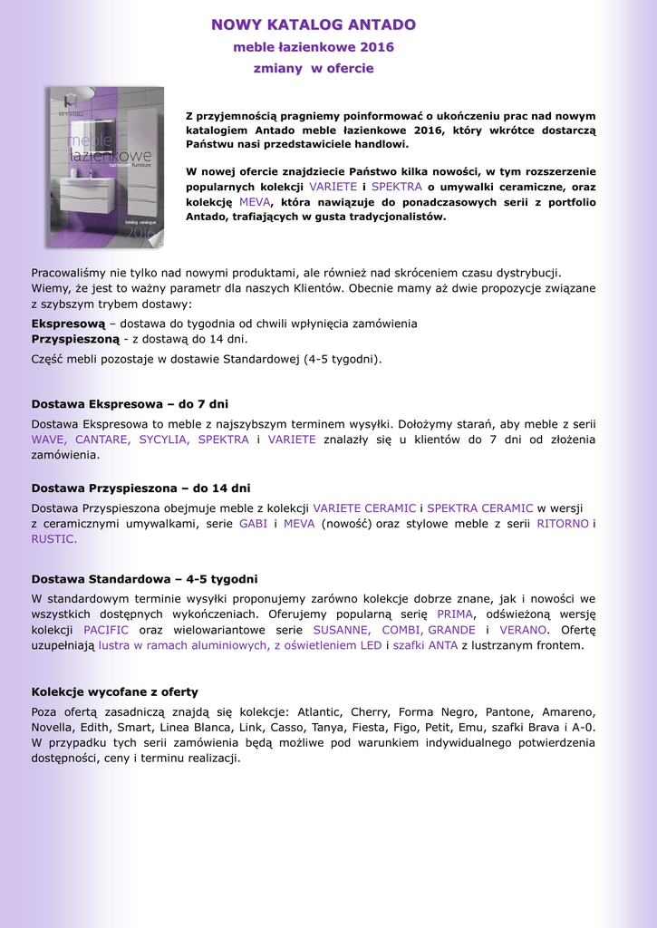 NOWY KATALOG ANTADO meble łazienkowe 2016 zmiany w ofercie Z przyjemnością pragniemy poinformować o ukończeniu prac nad nowym katalogiem Antado meble łazienkowe 2016, który wkrótce dostarczą Państwu nasi przedstawiciele handlowi. W nowej ofercie znajdziecie Państwo kilka nowości, w tym rozszerzenie popularnych kolekcji VARIETE i SPEKTRA o umywalki ceramiczne, oraz kolekcję MEVA, która nawiązuje do ponadczasowych serii z portfolio Antado, trafiających w gusta tradycjonalistów. Pracowaliśmy nie tylko nad nowymi produktami, ale również nad skróceniem czasu dystrybucji. Wiemy, że jest to ważny parametr dla naszych Klientów. Obecnie mamy aż dwie propozycje związane z szybszym trybem dostawy: Ekspresową – dostawa do tygodnia od chwili wpłynięcia zamówienia Przyspieszoną - z dostawą do 14 dni. Część mebli pozostaje w dostawie Standardowej (4-5 tygodni). Dostawa Ekspresowa – do 7 dni Dostawa Ekspresowa to meble z najszybszym terminem wysyłki. Dołożymy starań, aby meble z serii WAVE, CANTARE, SYCYLIA, SPEKTRA i VARIETE znalazły się u klientów do 7 dni od złożenia zamówienia. Dostawa Przyspieszona – do 14 dni Dostawa Przyspieszona obejmuje meble z kolekcji VARIETE CERAMIC i SPEKTRA CERAMIC w wersji z ceramicznymi umywalkami, serie GABI i MEVA (nowość) oraz stylowe meble z serii RITORNO i RUSTIC. Dostawa Standardowa – 4-5 tygodni W standardowym terminie wysyłki proponujemy zarówno kolekcje dobrze znane, jak i nowości we wszystkich dostępnych wykończeniach. Oferujemy popularną serię PRIMA, odświeżoną wersję kolekcji PACIFIC oraz wielowariantowe serie SUSANNE, COMBI, GRANDE i VERANO. Ofertę uzupełniają lustra w ramach aluminiowych, z oświetleniem LED i szafki ANTA z lustrzanym frontem. Kolekcje wycofane z oferty Poza ofertą zasadniczą znajdą się kolekcje: Atlantic, Cherry, Forma Negro, Pantone, Amareno, Novella, Edith, Smart, Linea Blanca, Link, Casso, Tanya, Fiesta, Figo, Petit, Emu, szafki Brava i A-0. W przypadku tych serii zamówienia będą możliwe pod warunkiem indywidualnego potwierdzenia dostępności, ceny i terminu realizacji.