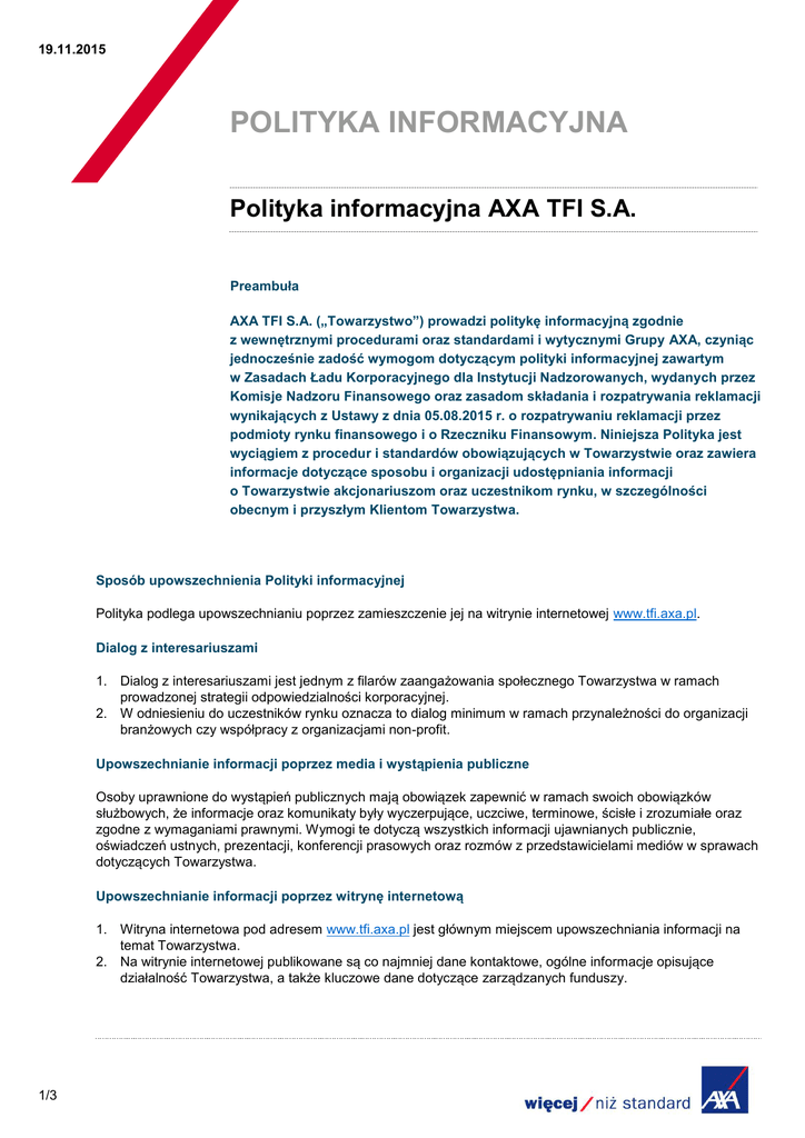 19.11.2015 POLITYKA INFORMACYJNA Polityka informacyjna AXA TFI S.A. Preambuła AXA TFI S.A. („Towarzystwo”) prowadzi politykę informacyjną zgodnie z wewnętrznymi procedurami oraz standardami i wytycznymi Grupy AXA, czyniąc jednocześnie zadość wymogom dotyczącym polityki informacyjnej zawartym w Zasadach Ładu Korporacyjnego dla Instytucji Nadzorowanych, wydanych przez Komisje Nadzoru Finansowego oraz zasadom składania i rozpatrywania reklamacji wynikających z Ustawy z dnia 05.08.2015 r. o rozpatrywaniu reklamacji przez podmioty rynku finansowego i o Rzeczniku Finansowym. Niniejsza Polityka jest wyciągiem z procedur i standardów obowiązujących w Towarzystwie oraz zawiera informacje dotyczące sposobu i organizacji udostępniania informacji o Towarzystwie akcjonariuszom oraz uczestnikom rynku, w szczególności obecnym i przyszłym Klientom Towarzystwa. Sposób upowszechnienia Polityki informacyjnej Polityka podlega upowszechnianiu poprzez zamieszczenie jej na witrynie internetowej www.tfi.axa.pl. Dialog z interesariuszami 1. Dialog z interesariuszami jest jednym z filarów zaangażowania społecznego Towarzystwa w ramach prowadzonej strategii odpowiedzialności korporacyjnej. 2. W odniesieniu do uczestników rynku oznacza to dialog minimum w ramach przynależności do organizacji branżowych czy współpracy z organizacjami non-profit. Upowszechnianie informacji poprzez media i wystąpienia publiczne Osoby uprawnione do wystąpień publicznych mają obowiązek zapewnić w ramach swoich obowiązków służbowych, że informacje oraz komunikaty były wyczerpujące, uczciwe, terminowe, ścisłe i zrozumiałe oraz zgodne z wymaganiami prawnymi. Wymogi te dotyczą wszystkich informacji ujawnianych publicznie, oświadczeń ustnych, prezentacji, konferencji prasowych oraz rozmów z przedstawicielami mediów w sprawach dotyczących Towarzystwa. Upowszechnianie informacji poprzez witrynę internetową 1. Witryna internetowa pod adresem www.tfi.axa.pl jest głównym miejscem upowszechniania informacji na temat Towarzystwa. 2. Na witrynie internetowej publikowane są co najmniej dane kontaktowe, ogólne informacje opisujące działalność Towarzystwa, a także kluczowe dane dotyczące zarządzanych funduszy. 1/3 Zasady i terminy udzielania odpowiedzi Klientom oraz uprawnionym organom na wnioski oraz zapytania 1. Wnioski i zapytania można składać w następujący sposób w każdej jednostce Towarzystwa obsługującej klientów. a. drogą pocztową na adres siedziby Towarzystwa: AXA Towarzystwo Funduszy Inwestycyjnych S.A., ul. Chłodna 51, 00-867 Warszawa b. osobiście w siedzibie Towarzystwa z zachowaniem formy pisemnej c. formie elektronicznej na adres e-mail: [email protected] d. telefonicznie pod numerem 22 555 04 45 (koszt połączenia zgodnie z taryfą operatora) e. ustnie podczas osobistej wizyty w jednostce Towarzystwa. 2. Terminy udzielenia odpowiedzi przez Towarzystwo: a. W przypadku, gdy z charakteru zapytania wynika konieczność udzielenia Klientowi lub uprawnionemu organowi odpowiedzi, odpowiedź taka powinna zostać udzielona w terminie 30 dni, chyba, że z treści zapytania wynika inny termin. b. Zapytania, które nie wymagają przesłania Klientowi lub uprawnionemu organowi odpowiedzi powinny zostać obsłużone niezwłocznie. W przypadku konieczności podjęcia działań na skutek przesłanego zapytania, Towarzystwo udziela odpowiedzi w terminie 30 dni. Zasady i terminy rozpatrywania reklamacji 1. Reklamacja to wystąpienie Klienta skierowane do Towarzystwa (w tym skarga i zażalenia), zawierające zastrzeżenia dotyczące usług świadczonych przez Towarzystwo. Złożenie reklamacji niezwłocznie po powzięciu zastrzeżeń ułatwi i przyspieszy rzetelne jej rozpatrzenie. 2. Zapytania, informacje oraz reklamacje można składać w następujący sposób w każdej jednostce Towarzystwa obsługującej klientów. a. drogą pocztową na adres siedziby Towarzystwa: AXA Towarzystwo Funduszy Inwestycyjnych S.A., ul. Chłodna 51, 00-867 Warszawa b. osobiście w siedzibie Towarzystwa z zachowaniem formy pisemnej c. formie elektronicznej na adres [email protected] d. za pomocą formularza dostępnego po zalogowaniu w portalu transakcyjnym, na stronie https://atlanticfundservices.eu/int2axa/tfi/axa/Contact.app?menuOpt=contact e. telefonicznie pod numerem 22 541 76 06 (koszt połączenia zgodnie z taryfą operatora) f. ustnie podczas osobistej wizyty w jednostce Towarzystwa. 3. Odpowiedź Towarzystwa na reklamację zostanie udzielona w formie pisemnej albo pocztą elektroniczną, jeżeli osoba składająca reklamację złoży wniosek o udzielnie odpowiedzi w tej formie. Dodatkowo na wniosek osoby składającej reklamację Towarzystwo potwierdza pisemnie lub w inny uzgodniony sposób fakt jej złożenia. 4. W przypadku gdy Towarzystwo nie posiada danych kontaktowych osoby składającej reklamację, przy jej składaniu należy podać następujące dane: imię, nazwisko, adres korespondencyjny lub adres e-mail (w przypadku wyboru takiej formy kontaktu). 5. Towarzystwo udzieli odpowiedzi na reklamację bez zbędnej zwłoki, nie później niż w terminie 30 dni od dnia otrzymania reklamacji. 6. W szczególnie skomplikowanych przypadkach, uniemożliwiających rozpatrzenie reklamacji i udzielenie odpowiedzi w terminie 30 dni, Towarzystwo wyśle w tym terminie informację w której: (i) wyjaśni przyczynę opóźnienia; (ii) wskaże okoliczności które muszą zostać ustalone dla rozpatrzenia sprawy; oraz (iii) określa przewidywany termin rozpatrzenia reklamacji i udzielenia odpowiedzi, który nie moze przekroczyć 60 dni od dnia otrzymania reklamacji. 7. Klient może złożyć do Towarzystwa odwołanie od rozstrzygnięca reklamacji, które zostanie rozpatrzone przez Towarzystwo w terminie 30 dni. Zasady udostępniania informacji akcjonariuszom 1. Towarzystwo zapewnia akcjonariuszom równy dostęp do informacji udostępnianych w związku z posiadaniem statusu akcjonariusza. 2. Co 