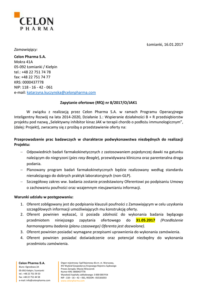 Łomianki, 16.01.2017 Zamawiający: Celon Pharma S.A. Mokra 41A 05-092 Łomianki / Kiełpin tel.: +48 22 751 74 78 fax: +48 22 751 74 77 KRS: 0000437778 NIP: 118 - 16 - 42 - 061 e-mail: [email protected] Zapytanie ofertowe (RfQ) nr 8/2017/O/JAK1 W związku z realizacją przez Celon Pharma S.A. w ramach Programu Operacyjnego Inteligentny Rozwój na lata 2014-2020, Działanie 1.: Wspieranie działalności B + R przedsiębiorstw projektu pod nazwą „Selektywny inhibitor kinaz JAK w terapii chorób o podłożu immunologicznym”, (dalej: Projekt), zwracamy się z prośbą o przedstawienie oferty na: Przeprowadzenie prac badawczych w charakterze podwykonawstwa niezbędnych do realizacji Projektu: Odpowiednich badań farmakokinetycznych z zastosowaniem pojedynczej dawki na gatunku należącym do niegryzoni (pies rasy Beagle), przewidywana kliniczna oraz parenteralna droga podania. Planowany program badań farmakokinetycznych będzie realizowany według standardu nienależącego do dobrych praktyk laboratoryjnych (non-GLP). Szczegółowy zakres ww. badania zostanie przedstawiony Oferentowi po podpisaniu Umowy o zachowaniu poufności oraz wzajemnym nieujawnianiu informacji. Warunki udziału w postępowaniu: 1. Oferent zobligowany jest do podpisania klauzuli poufności z Zamawiającym w celu uzyskania szczegółowych informacji umożliwiających mu konstrukcję oferty. 2. Oferent powinien wykazać, iż posiada zdolność do wykonania badania będącego przedmiotem niniejszego zapytania ofertowego do 31.05.2017 (Przedłożenie harmonogramu badania (planu czasowego) Oferenta jest dozwolone). 3. Oferent powinien posiadać wymagane przepisami uprawnienia do wykonania zamówienia. 4. Oferent powinien posiadać doświadczenie oraz potencjał niezbędny do wykonania przedmiotu zamówienia. Celon Pharma S.A. Biuro: Ogrodowa 2A 05-092 Kiełpin / Łomianki tel.: +48 22 751 59 33 fax: +48 22 751 44 58 e-mail: [email protected] Organ rejestrowy: Sąd Rejonowy dla m. st. Warszawy, XIV Wydział Gospodarczy Krajowego Rejestru Sądowego Prezes Zarządu: Maciej Wieczorek Numer KRS: 0000437778 Wysokość kapitału zakładowego: 3 000 000 PLN NIP : 118 – 16 – 42 – 061, REGON : 015181033 www.celonpharma.com 5. Oferent powinien wykazać, iż posiada kadrę naukową wyspecjalizowaną w zagadnieniach związanych z przedmiotem niniejszego zapytania ofertowego. (Przedłożenie folderu, prezentacji bądź monografii Oferenta jest dozwolone). 6. Powinien ponadto wykazać doświadczenie w realizacji badań naukowych oraz prac rozwojowych realizowanych w ciągu ostatnich 5 lat. (Przedłożenie folderu, prezentacji bądź monografii Oferenta jest dozwolone). 7. Wymagane jest złożenie wraz z ofertą „Oświadczenia o braku powiązań osobowych i kapitałowych z Zamawiającym”. 8. O ile nie zaznaczono inaczej, wszystkie faktury będą płatne w terminie 30 dni od daty wystawienia faktury. 9. Oferent powinien znajdować się w sytuacji ekonomicznej i finansowej zapewniającej wykonanie zamówienia. Miejsce i termin składania ofert: 10. Ofertę należy złożyć w siedzibie Zamawiającego przy ul. Mokra 41a, 05-092 Kiełpin w przypadku poczty tradycyjnej bądź kurierskiej lub przesłać pocztą elektroniczną na adres: [email protected]. 11. Ofertę należy złożyć w nieprzekraczalnym terminie do dnia 27.01.2017. W przypadku wysyłania oferty za pośrednictwem poczty tradycyjnej bądź kurierskiej liczy się data dostarczenia przesyłki do siedziby Zamawiającego. 12. Oferty złożone po terminie nie będą rozpatrywane. 13. Ocena ofert zostanie dokonana w siedzibie Zamawiającego w terminie 7 dni od daty zakończenia składania ofert. 14. Wszyscy Oferenci zostaną poinformowani o wiążącej decyzji poprzez pocztę elektroniczną w ciągu 7 dni od daty zakończenia składania ofert. Informacja o wyniku postępowania zostanie również zamieszczona na stronie internetowej zamawiającego http://celonpharma.com/category/zapof/. 15. Dodatkowych informacji na temat badań udziela Paulina Dera, mail: [email protected]. 16. Niniejsze zapytanie ofertowe dostępne jest na stronie internetowej: http://celonpharma.com/category/zapof/ Sposób przygotowania ofert: 17. Każdy Oferent może złożyć tylko jedną ofertę. 18. Oferta musi być złożona w języku polskim bądź języku angielskim. Strona | 2 19. Oferta musi posiadać datę sporządzenia, zawierać adres lub siedzibę Oferenta, numer telefonu, adres e-mail, numer NIP. 20. Oferta musi zawierać w tytule nr zapytania ofertowego. Numer taki musi widnieć także w tytułach korespondencji: elektronicznej, poczty tradycyjnej, kurierskiej. 21. Oferta musi być ważna przez okres co najmniej 3 miesięcy, liczonych od dnia upływu terminu składania ofert. 22. Oferta musi zawierać: a) Cenę: cenę ofertową brutto, cenę netto oraz należny podatek VAT, za realizację przedmiotu zamówienia zgodnie z warunkami określonymi w zapytaniu, w przypadku Oferentów z terytorium Polski, cenę ofertową netto oraz informację, iż należny podatek VAT bądź inny nie został uwzględniony w kwotacji, za realizację przedmiotu zamówienia zgodnie z warunkami określonymi w zapytaniu, w przypadku Oferentów spoza terytorium Polski. b) Informacje na temat proponowanego programu badania za pomocą różnych dróg podania zgodnie z Szczegółowym zakresem badań, dostępnym po podpisaniu klauzuli poufności. c) Deklarację, iż posiada doświadczenie oraz kadrę naukową wyspecjalizowaną w zagadnieniach związanych z przedmiotem niniejszego zapytania ofertowego. (Przedłożenie folderu, prezentacji bądź monografii Oferenta jest dozwolone). d) Deklarację, iż posiada zdolność do wykonania badania będącego przedmiotem niniejszego zapytania ofertowego do 31.05.2017 (Przedłożenie harmonogramu badania (planu czasowego) Oferenta jest dozwolone). e) Wymagane jest złożenie wraz z ofertą „Oświadczenia o braku powiązań osobowych i kapitałowych z Zamawiającym”. 23. Koszty
