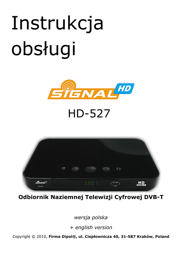 Instrukcja obsługi HD-527 Odbiornik Naziemnej Telewizji Cyfrowej DVB-T wersja polska + english version Copyright © 2010, Firma Dipol®, ul. Ciepłownicza 40, 31-587 Kraków, Poland 1 This document may not be copied in whole or in part or otherwise reproduced without prior written consent from Dipol except where specifically permitted under Europe and international copyright law. Niniejszy dokument nie może być kopiowany, powielany, ani w żaden sposób przetwarzany bez zgody właściciela. The information in this document is subject to change without notice. Dipol assumes no responsibility or liability for any errors or inaccuracies that may appear in this book. Firma Dipol nie ponosi odpowiedzialności za błędy i nieścisłości zawarte w instrukcji. Ze względu na ciągłe prace nad oprogramowaniem odbiornika, może okazać się, iż przedstawione w instrukcji informacje lub zdjęcia odbiegają nieznacznie od rzeczywistości (wygląd OSD, tłumaczenia poszczególnych funkcji odbiornika). 2 INSTRUKCJE BEZPIECZEŃSTWA Należy zapoznać się dokładnie z treścią niniejszej instrukcji i zachować ją w celu ewentualnego wykorzystania w przyszłości. Producent i dystrybutor nie odpowiadają za szkody powstałe w wyniku nieprawidłowego obchodzenia się z urządzeniem. Aby zminimalizować ryzyko porażenia prądem zabronione jest zdejmowanie obudowy urządzenia. Wewnątrz urządzenia nie ma części, których wymiany mógłby podjąć się użytkownik. Wszelkie naprawy należy zlecać specjalistom. UWAGA!!! Urządzenie nie może być umieszczane w miejscach narażonych na wilgoć bądź zalanie wodą. Należy unikać umieszczania odbiornika w bezpośrednim sąsiedztwie wazonów, umywalek, otwartych okien, itp. Zabronione jest otwieranie obudowy oraz dotykanie jakiejkolwiek części znajdującej w jej wnętrzu. Odłączone od sieci energetycznej urządzenie może być czyszczone lekko zwilżoną szmatką. Otwory wentylacyjne w obudowie mają chronić urządzenie przed przegrzaniem. W związku z tym zabronione jest przykrywanie odbiornika innymi przedmiotami, takimi jak odzież, gazety, inne urządzenia… Należy również unikać umieszczania urządzenia w bezpośrednim sąsiedztwie źródeł ciepła, takich jak grzejniki czy kaloryfery. Należy zapewnić swobodny przepływ powietrza w sąsiedztwie urządzenia. W sytuacji, gdy urządzenie przechowywane było przez długi czas w niższych temperaturach, a następnie umieszczone w ciepłym pomieszczeniu, na jego powierzchni może dojść do kompensacji wilgoci. W sytuacji takiej należy odczekać 2 godziny i dopiero po pływie tego czasu podłączyć odbiornik do zasilania. 3 Odbiornik jest zgodny ze standardami DVB. Odbiornik zgodny jest z warunkami dyrektywy 89/336/EEC dotyczącej przestrzegania przez kraje członkowskie przepisów zgodności elektromagnetycznej oraz warunkami dyrektyw 73/23/EEC i 93/68/EEC dotyczących przestrzegania przez kraje członkowskie przepisów niskiego napięcia i bezpieczeństwa związanego z obsługą urządzeń elektrycznych. Urządzenie bezpieczne pod względem elektrycznym. Należy stosować się do instrukcji obsługi. Zakaz umieszczania zużytego sprzętu wraz z innymi odpadami domowymi. Zużyty sprzęt elektryczny i elektroniczny podlega odrębnemu systemowi zbiórki odpadów. UWAGA!!! Odbiornik naziemnej telewizji cyfrowej Signal HD-527 jest również rejestratorem programów oraz odtwarzaczem szerokiej palety multimediów. Nagrywanie możliwe jest na pamięciach flash USB oraz zewnętrznych dyskach twardych HDD. Zapis dokonywany być może na pamięciach flash obsługujących standard USB2.0 Starsze wersje standardu USB nie zapewniają dostatecznej prędkości zapisu danych. Z reguły pamięć powinna cechować się minimalną prędkością zapisu wynoszącą 9MB/s. Wolniejsze pamięci mogą nie funkcjonować prawidłowo. Odbiornik rozpoznaje partycje sformatowane w systemie NTFS, FAT32 oraz FAT16. Preferowany jest system FAT32. Pamięci z małą ilością wolnego miejsca, zawierające dużą ilość plików mogą nie funkcjonować prawidłowo. W przypadku nagrywania, bądź odtwarzania multimediów z zewnętrznego twardego dysku HDD, konieczne jest zapewnienie mu dodatkowego zasilania. W żadnym wypadku nie należy odłączać nośnika danych od odbiornika w trakcie zapisywania lub odtwarzania danych. Grozi to uszkodzeniem odbiornika, nośnika oraz zawartych na nim danych. Nie należy podłączać i odłączać nośnika danych mokrymi rękoma. Producent nie ponosi odpowiedzialności za szkody powstałe w wyniku niestosowania się do wymienionych wyżej instrukcji. Producent nie odpowiada również za incydentalną utratę danych znajdujących się na nośnikach spowodowaną nieprawidłowym działaniem funkcji PVR. 4 SPIS TREŚCI Instrukcje bezpieczeństwa 2 Podstawowe informacje o odbiorniku 5 Instalacja odbiornika 6 Opis dostępnych wejść i wyjść 6 Pilot zdalnego sterowania 6 Podłączenie odbiornika 8 Szybki start 9 Menu – informacje 10 Wyszukiwanie kanałów 10 Wybór języka OSD 11 Sortowanie kanałów 11 Ustawienia obrazu 12 Informacje o systemie 12 Powrót do ustawień fabrycznych 12 Aktualizacja oprogramowania 12 Kanały ulubione 13 Elektroniczny przewodnik programowy (EPG) 13 Nagrywanie 13 Formatowanie nośnika danych 14 Nagrywanie aktualnie oglądanego programu 14 Nagrywanie programu z EPG i nagrywanie czasowe 14 Multimedia 14 Specyfikacja techniczna 16 Anteny DVB-T 18 5 PODSTAWOWE INFORMACJE O ODBIORNIKU Odbiornik Signal HD-527 jest urządzeniem przeznaczonym do odbioru naziemnej telewizji cyfrowej w standardzie DVB-T. Od innych urządzeń dostępnych na rynku wyróżniają go: sprawność działania (duża czułość, 1000 kanałów w pamięci, szybkie skanowanie pasma), mały rozmiar oraz bogata paleta funkcji multimedialnych. Odbiornik polecany jest użytkownikom starszych telewizorów kineskopowych wyposażonym jedynie w analogowy tuner telewizji naziemnej, jak i telewizoró