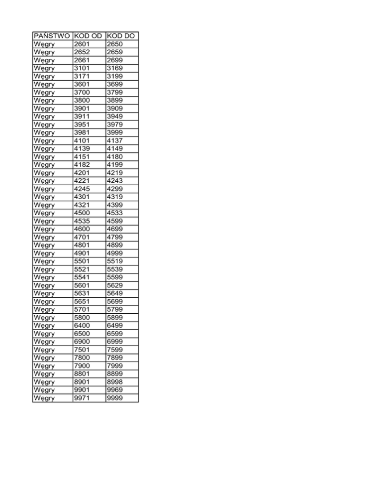 PAŃSTWO KOD OD KOD DO Węgry 2601 2650 Węgry 2652 2659