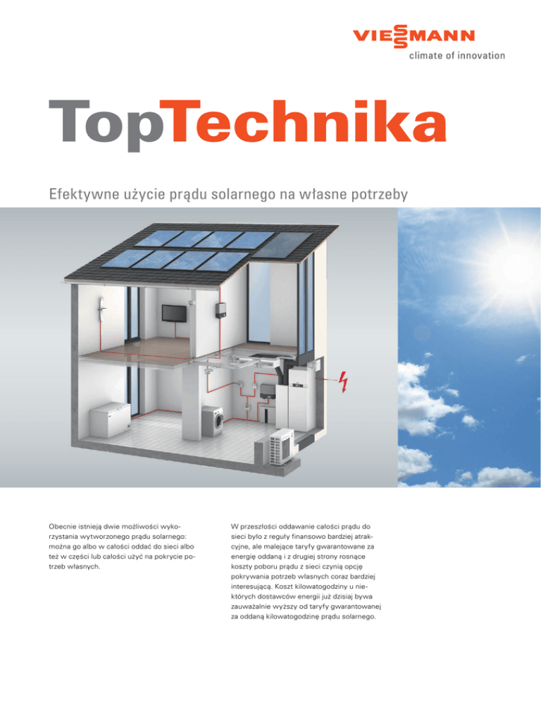 TopTechnika Efektywne użycie prądu solarnego na własne potrzeby Obecnie istnieją dwie możliwości wykorzystania wytworzonego prądu solarnego: można go albo w całości oddać do sieci albo też w części lub całości użyć na pokrycie potrzeb własnych. W przeszłości oddawanie całości prądu do sieci było z reguły finansowo bardziej atrakcyjne, ale malejące taryfy gwarantowane za energię oddaną i z drugiej strony rosnące koszty poboru prądu z sieci czynią opcję pokrywania potrzeb własnych coraz bardziej interesującą. Koszt kilowatogodziny u niektórych dostawców energii już dzisiaj bywa zauważalnie wyższy od taryfy gwarantowanej za oddaną kilowatogodzinę prądu solarnego. TopTechnika Efektywne użycie prądu solarnego na potrzeby własne Produkcja i zużycie prądu solarnego 6000 5000 Moc w W 4000 3000 2000 1000 0 0:00 3:00 6:00 9:00 Typowy przebieg słonecznego dnia letniego na przykładzie czteroosobowego gospodarstwa domowego 12:00 15:00 18:00 Godzina Produkcja FW Zużycie Zużycie na potrzeby własne z instalacją fotowoltaiczną (5 kWp) Wskazówka Jako zużycie własne rozumie się prąd solarny, który jest zużywany dokładny w tym samym momencie, w którym został wyprodukowany. Udział zużycia własnego jest ilorazem zużycia na potrzeby własne i całej ilości wytworzonego prądu solarnego w ciągu roku. Samodzielne wykorzystanie prądu solarnego O wysokości udziału energii wykorzystywanej na potrzeby własne decyduje z jednej strony wielkość i wyposażenie instalacji, a z drugiej strony profil obciążenia i charakterystyka energetyczna danego gospodarstwa domowego. Symulacje wykazały, że łatwo można osiągnąć udział zużycia własnego rządu 20 procent. Jeśli udział ten miałby być większy, należy zastosować kombinację dostosowanego do zapotrzebowania projektu instalacji fotowoltaicznej z aktywnym dopasowaniem sposobu wykorzystania i systemową ofertę urządzeń fotowoltaicznych. W ten sposób można zwiększyć udział zużycia własnego do ponad 40 procent. Możliwe jest dalsze zwiększanie tego udziału, lecz wymaga to zastosowania odpowiednich urządzeń akumulacyjnych. Moduły fotowoltaiczne Vitovolt 200 21:00 24:00 / Pobór prądu z sieci w domu z pompą ciepła i instalacją fotowoltaiczną Dom jednorodzinny Dom jednorodzinny Dom jednorodzinny „normalny“ z z z pompą ciepła pompą ciepła pompą ciepła 11200 Dom jednorodzinny + + instalacja instalacja fotowoltaiczna fotowoltaiczna (potrzeby własne) (potrzeby własne) + Zapotrzebowanie energii w kWh bateria akumulatorów Założenia do obliczeń Typ budynku: dom jednorodzinny dla 4 osób: 8350 Jednostkowe zapotrzebowanie ciepła grzewczego 80 kWh / (m2 a) 5550 5200 mieszkalna: 140 m2 3850 Zapotrzebowanie na energię cieplną (np. gaz ziemny) Ogrzewana powierzchnia Moc instalacji fotowoltaicznej: 8 kWp Wielkość baterii akumulatorów: 5 kWh Moc pompy ciepła: 8 kW Wielkość zasobnika ciepła: 1 000 litrów Zapotrzebowanie na energię elektryczną (pobór z sieci) Zoptymalizowana koncepcja energetyczna Malejące taryfy gwarantowane na wyprodukowany prąd solarny i rosnące koszty poboru prądu są motywacją do opracowania optymalnej koncepcji energetycznej dla domów jedno- i dwurodzinnych. Jak można pokryć całorocznie, zarówno zapotrzebowania na ciepło, jak i na prąd tak, aby osiągnąć w bilansie rocznym zrównoważony wynik? Zrównoważony bilans roczny Nadmiary prądu solarnego, nie dające się wykorzystać na potrzeby własne, można oddać za wynagrodzeniem do sieci energetycznej. W okresach, kiedy ilość wytwarzanego prądu solarnego nie wystarcza na pokrycie potrzeb własnych, brakujący prąd pobierany jest z sieci. Jeśli obie te ilości prądu zbilansują się w skali roku, otrzymamy zrównoważony wynik. Przedstawiony przykład pokazuje, że już przez samo tylko zastosowanie pompy ciepła można obniżyć zapotrzebowanie energii prawie o połowę. Jeśli dodatkowo zastosuje się fotowoltaikę, to pobór prądu z sieci energetycznej zmniejszy się jeszcze bardziej. Bilans takiego systemu energetycznego równoważy się jeszcze bardziej przez oddawanie wytworzonego w lecie nadmiaru prądu solarnego. Zastosowanie akumulatorów dodatkowo zwiększa udział zużycia własnego, równocześnie zmniejszając odpowiednio pobór z sieci. Także przy takim zwiększony zużyciu własnym pobór z sieci i oddawanie do sieci bilansują się w skali roku. Bilans taki jest jednak zrównoważony tylko pod względem ilości energii, gdyż ze względu na koszt prądu z sieci, wyższy od taryfy gwarantowanej, pozostanie on na lekkim minusie. Ale im niższa ilość prądu pobranego z sieci w skali roku, tym minus ten jest mniejszy. TopTechnika Efektywne użycie prądu solarnego na potrzeby własne Ceny prądu i taryfa gwarantowana 60 50 Cent/kWh 40 1 30 2 Taryfa gwarantowana na oddany 20 do sieci prąd solarny dopasowywana jest bieżąco do zmian cen instalacji fotowoltaicznych i od lat 10 obniża się stale. Natomiast koszty prądu pobieranego z sieci publicznej od lat stale 0 2000 2002 2004 2006 2008 2010 2012 2014 rosną. Ostatnio zużywanie prądu solarnego na potrzeby własne jest finansowo bardziej atrakcyjne, niż oddawanie tego prądu do sieci. Trend taki będzie się utrzymy- Cena prądu wg taryfy dla odbiorców prywatnych 1 Korzyść finansowa przy oddawaniu prądu do sieci Taryfa gwarantowana za prąd oddany (instalacje FW do 10 kW) 2 Korzyść finansowa przy zużyciu prądu na potrzeby własne wał także w przyszłości. Efektywne zużycie własne Aby zwiększyć udział zużycia prądu solarnego na potrzeby własne, trzeba oprócz odbiorników elektrycznych uwzględnić także zużycie ciepła. Najbardziej efektywnym sposobem wytwarzania prądu z energii elektrycznej jest zasada pompy ciepła, Z jednej kilowatogodziny prądu i bezpłatnej energii ze środowiska można w ten sposób uzyskać nawet cztery kilowatogodziny użytecznego ciepła. Jeśli