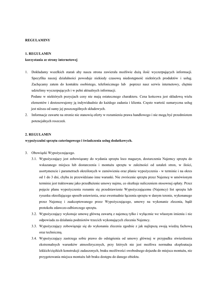 REGULAMINY 1. REGULAMIN korzystania ze strony internetowej 1. Dokładamy wszelkich starań aby nasza strona zawierała możliwie dużą ilość wyczerpujących informacji. Specyfika naszej działalności powoduje niekiedy czasową niedostępność niektórych produktów i usług. Zachęcamy zatem do kontaktu osobistego, telefonicznego lub poprzez nasz serwis internetowy, chętnie udzielimy wyczerpujących i w pełni aktualnych informacji. Podane w niektórych pozycjach ceny nie mają ostatecznego charakteru. Cena końcowa jest składową wielu elementów i dostosowujemy ją indywidualnie do każdego zadania i klienta. Często wartość sumaryczna usług jest niższa od sumy jej poszczególnych składowych. 2. Informacje zawarte na stronie nie stanowią oferty w rozumieniu prawa handlowego i nie mogą być przedmiotem potencjalnych roszczeń. 2. REGULAMIN wypożyczalni sprzętu cateringowego i świadczenia usług dodatkowych. 3. Obowiązki Wypożyczającego. 3.1. Wypożyczający jest zobowiązany do wydania sprzętu loco magazyn, dostarczenia Najemcy sprzętu do wskazanego miejsca lub dostarczenia i montażu sprzętu w zależności od ustaleń stron, w ilości, asortymencie i parametrach określonych w zamówieniu oraz planie wypożyczenia - w terminie i na okres od 1 do 3 dni, chyba że przewidziano inne warunki. Nie zwrócenie sprzętu przez Najemcę w umówionym terminie jest traktowane jako przedłużenie umowy najmu, co skutkuje naliczeniem stosownej opłaty. Przez pojęcie planu wypożyczenia rozumie się przedstawienie Wypożyczającemu (Najemcy) list sprzętu lub rysunku określającego sposób ustawienia, oraz ewentualnie łączenia sprzętu w danym terenie, wykonanego przez Najemcę i zaakceptowanego przez Wypożyczającego, umowy na wykonanie zlecenia, bądź protokołu zdawczo-odbiorczego sprzętu. 3.2. Wypożyczający wykonuje umowę główną zawartą z najemcą tylko i wyłącznie we własnym imieniu i nie odpowiada za działania podmiotów trzecich wykonujących zlecenia Najemcy. 3.3. Wypożyczający zobowiązuje się do wykonania zlecenia zgodnie z jak najlepszą swoją wiedzą fachową oraz techniczną. 3.4. Wypożyczający zastrzega sobie prawo do odstąpienia od umowy głównej w przypadku stwierdzenia ekstremalnych warunków atmosferycznych, przy których nie jest możliwa normalna eksploatacja lekkich/ciężkich konstrukcji zadaszonych, braku możliwości swobodnego dojazdu do miejsca montażu, nie przygotowania miejsca montażu lub braku dostępu do danego obiektu. 4. Obowiązki Najemcy. 4.1. W celu umożliwienia Wypożyczającemu wykonanie umowy, Najemca zobowiązany jest: a) do zabezpieczenia transportowi Wypożyczającego możliwości wjazdu na miejsce wykonania usługi. b) do przygotowania terenu zgodnie z wymogami planu wypożyczenia oraz załatwienia wszelkich formalności związanych z uzyskaniem pozwolenia na posadowienie namiotów. c) udzielenia pisemnego pełnomocnictwa osobie upoważnionej do nadzoru nad wykonaniem usługi w momencie rozkładania sprzętu i sporządzania protokołu zdawczego. 4.2. Najemcy zobowiązany jest do pokrycia szkód powstałych w okresie umowy wypożyczenia na ogólnych zasadach, a w szczególności: 4.2.1. Szkód nie powodujących całkowitego wyłączenia sprzętu z eksploatacji, czyli: a) kosztów dodatkowego czyszczenia plandek, podłóg lub innego sprzętu (w przypadku wykraczającym poza normalny stopień zużycia, zabrudzenia) b) kosztów częściowej naprawy (poprzez wymianę brytów, rozdarć, przepaleń i innych uszkodzeń w strukturze poszycia), c) kosztów zagubienia bądź uszkodzenia elementów montażowych metalowych (śrub, łączników, lin, odciągów, floków, masztów, ciężarków itp.), d) kosztów napraw pogięcia, połamania elementów, trwałego odbarwienia lub jakichkolwiek zmian w strukturze zewnętrznej krzeseł konferencyjnych w ryczałtowej kwocie 36,60 PLN brutto za każdą sztukę. e) kosztów napraw pogięcia, połamania elementów, trwałego odbarwienia lub jakichkolwiek zmian w strukturze zewnętrznej i wewnętrznej wpływających na obniżenie walorów estetycznych lub użytkowych stołów, ławo-stołów, barier zaporowych lub innego sprzętu, a w szczególności zastawy stołowej i sprzętu cateringowego (pęknięcia i wyszczerbienia porcelany i szkła, rozdarcia przepalenia lub trwałego zbrudzenia sprzętów takich jak krzesła tapicerowane, pokrowce, obrusy, serwety itd.). Wycena szkód zostanie dokonana na podstawie protokołu zdawczego w terminie do 3 dni od jego sporządzenia i nie wymaga dodatkowej akceptacji stron. Wartość przedmiotu, usługi lub wartość odtworzeniową (wartość zakupu lub wykonania identycznego lub nowego przedmiotu, tej samej marki i typu) jest określona w cenniku Wypożyczającego i nie podlega negocjacji. 4.2.2. Szkód powodujących całkowite wyłączenie sprzętu z eksploatacji, czyli: a) zabrudzeń o charakterze trwałym, których usunięcie spowoduje odbarwienie lub osłabienie trwałości plandeki (napisy z farby, zalanie środkami chemicznymi, przyklejanie banerów, zabrudzenie osadami węgla oraz tłuszczu itp.) b) rozdarć, przepaleń (po fajerwerkach, racach itp.) i innych uszkodzeń w strukturze poszycia o wielkości przekraczającej możliwość częściowej naprawy sprzętu bez pogorszenia jego walorów estetycznych i użytkowych. c) zagubienia bądź kradzieży sprzętu. Wycena szkód zostanie dokonana na podstawie protokołu zdawczego według w terminie do 3 dni od jego sporządzenia i nie wymaga dodatkowej akceptacji stron. Wartość odtworzeniową jest określona w cenniku Wypożyczającego i nie podlega negocjacji. 4.2.3. Wszelkich kosztów wynikłych na skutek opóźnienia montażu nie wynikających z winy Wynajmującego (wynagrodzenia pracownicze, przestój środków transportu itp.) poniesionych przez Wynajmującego w realnej ich wysokości. 4.2.4. Najemca oświadcza, że będzie użytkował sprzęt zgodnie z przeznaczeniem i należytą s