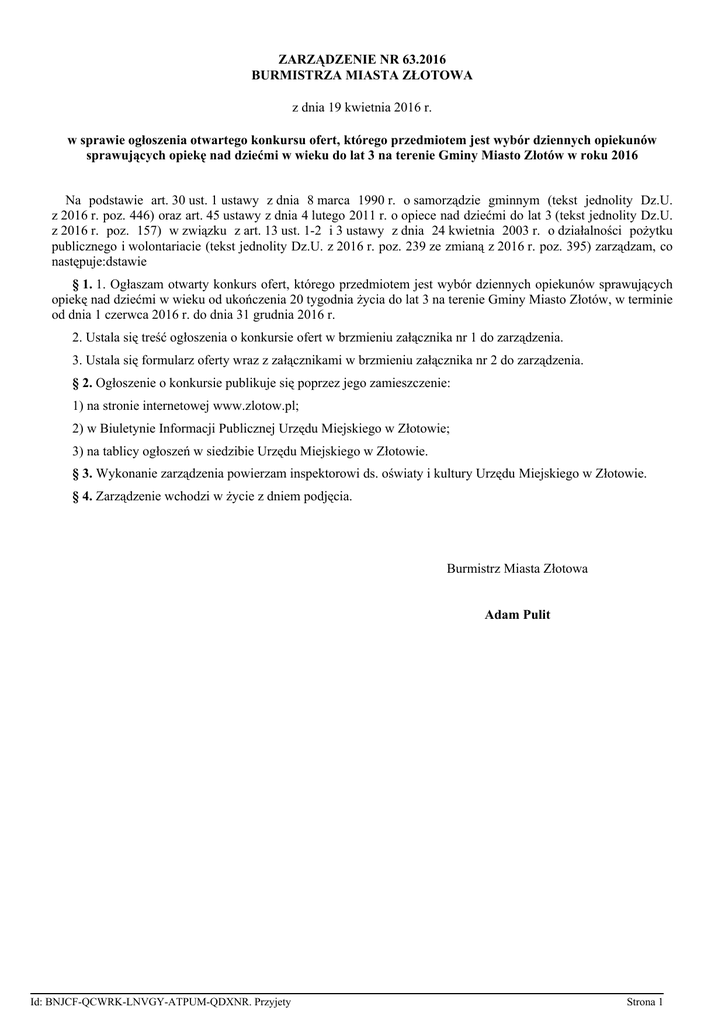 ZARZĄDZENIE NR 63.2016 BURMISTRZA MIASTA ZŁOTOWA z dnia 19 kwietnia 2016 r. w sprawie ogłoszenia otwartego konkursu ofert, którego przedmiotem jest wybór dziennych opiekunów sprawujących opiekę nad dziećmi w wieku do lat 3 na terenie Gminy Miasto Złotów w roku 2016 Na podstawie art. 30 ust. 1 ustawy z dnia 8 marca 1990 r. o samorządzie gminnym (tekst jednolity Dz.U. z 2016 r. poz. 446) oraz art. 45 ustawy z dnia 4 lutego 2011 r. o opiece nad dziećmi do lat 3 (tekst jednolity Dz.U. z 2016 r. poz. 157) w związku z art. 13 ust. 1-2 i 3 ustawy z dnia 24 kwietnia 2003 r. o działalności pożytku publicznego i wolontariacie (tekst jednolity Dz.U. z 2016 r. poz. 239 ze zmianą z 2016 r. poz. 395) zarządzam, co następuje:dstawie § 1. 1. Ogłaszam otwarty konkurs ofert, którego przedmiotem jest wybór dziennych opiekunów sprawujących opiekę nad dziećmi w wieku od ukończenia 20 tygodnia życia do lat 3 na terenie Gminy Miasto Złotów, w terminie od dnia 1 czerwca 2016 r. do dnia 31 grudnia 2016 r. 2. Ustala się treść ogłoszenia o konkursie ofert w brzmieniu załącznika nr 1 do zarządzenia. 3. Ustala się formularz oferty wraz z załącznikami w brzmieniu załącznika nr 2 do zarządzenia. § 2. Ogłoszenie o konkursie publikuje się poprzez jego zamieszczenie: 1) na stronie internetowej www.zlotow.pl; 2) w Biuletynie Informacji Publicznej Urzędu Miejskiego w Złotowie; 3) na tablicy ogłoszeń w siedzibie Urzędu Miejskiego w Złotowie. § 3. Wykonanie zarządzenia powierzam inspektorowi ds. oświaty i kultury Urzędu Miejskiego w Złotowie. § 4. Zarządzenie wchodzi w życie z dniem podjęcia. Burmistrz Miasta Złotowa Adam Pulit Id: BNJCF-QCWRK-LNVGY-ATPUM-QDXNR. Przyjety Strona 1 Załącznik nr 1 do zarządzenia nr 63.2016 Burmistrza Miasta Złotowa z dnia 19.04.2016 r. Ogłoszenie konkursu ofert na zadanie pod nazwą: „Wybór dziennych opiekunów sprawujących opiekę nad dziećmi do lat 3 na terenie Gminy Miasto Złotów w roku 2016” Burmistrz Gminy Miasto Złotów ogłasza otwarty konkurs ofert, którego przedmiotem jest wybór dziennych opiekunów sprawujących opiekę nad dziećmi w wieku do lat 3 na terenie Gminy Miasto Złotów w roku 2016. I. Podstawa prawna 1. ustawa z dnia 4 lutego 2011 r. o opiece nad dziećmi w wieku do lat 3 (tekst jednolity Dz.U. z 2016 r. poz. 157); 2. ustawa z dnia 24 kwietnia 2003 r. o działalności pożytku publicznego i o wolontariacie (Dz.U. z 2016 r., poz. 239 z późniejszymi zmianami); 3. uchwała Nr XVII.122.2016 Rady Miejskiej w Złotowie z dnia 21 marca 2016 r. w sprawie ustalenia wysokości opłaty za pobyt dziecka u dziennego opiekuna oraz maksymalnej wysokości opłaty za wyżywienie dziecka u dziennego opiekuna (Dz. Urz. Woj. Wielkopolskiego poz. 2416); 4. uchwała Nr XVII.121.2016 Rady Miejskiej w Złotowie z dnia 21 marca 2016 r. w sprawie maksymalnej wysokości wynagrodzenia dziennego opiekuna oraz zasad jego ustalania (Dz. Urz. Woj. Wielkopolskiego poz. 2415). II. Rodzaj zadania Sprawowanie opieki nad dziećmi w wieku od ukończenia 20 tygodnia życia do lat 3 przez dziennych opiekunów na terenie Gminy Miasto Złotów w roku 2016, od dnia 1 czerwca 2016 r. do dnia 31 grudnia 2016 r. Zadanie zawarte w ogłoszeniu Gmina Miasto Złotów będzie realizowała po raz pierwszy. III. Wysokość środków publicznych przeznaczonych na realizację zadania w roku 2016 Gmina Miasto Złotów realizuje zadanie, o którym mowa w pkt II, po raz pierwszy i przeznacza na jego realizację w roku 2016 kwotę 135.000,00 zł (wg klasyfikacji budżetowej: dział 853, rozdział 85307). Id: BNJCF-QCWRK-LNVGY-ATPUM-QDXNR. Przyjety Strona 1 IV. Cel i miejsce realizacji zadania Wybór dziennych opiekunów, którzy zapewnią opiekę nad dziećmi zamieszkałymi w Gminie Miasto Złotów w wieku od 20 tygodnia życia do ukończenia roku szkolnego, w którym dziecko ukończy 3 rok życia. Realizacja zadania następuje w Gminie Miasto Złotów. V. Wymagania wobec kandydatów na dziennego opiekuna 1. Do składania ofert zaprasza się osoby fizyczne, które: 1) dają rękojmię należytego sprawowania opieki nad dziećmi; 2) nie są i nie były pozbawione władzy rodzicielskiej oraz władza rodzicielska nie została im zawieszona ani ograniczona; 3) wypełniają obowiązek alimentacyjny, w przypadku gdy taki obowiązek został nałożony na podstawie tytułu wykonawczego pochodzącego lub zatwierdzonego przez sąd; 4) nie są skazane prawomocnym wyrokiem za przestępstwo umyślne; 5) posiadają aktualne badania sanitarno-epidemiologiczne (badanie na nosicielstwo); 6) odbyły: a) 160-godzinne szkolenie, o którym mowa w art. 39 ust. 1 pkt 6 lit. a ustawy z dnia 4 lutego 2011 r. o opiece nad dziećmi w wieku do lat 3 albo b) 40-godzinne szkolenie uzupełniające, o którym mowa w art. 39 ust. 1 pkt 6 lit. b ustawy z dnia 4 lutego 2011 r. o opiece nad dziećmi w wieku do lat 3, w tym z zakresu udzielania dziecku pierwszej pomocy, jeżeli posiadają kwalifikacje pielęgniarki, położnej, opiekunki dziecięcej, nauczyciela wychowania przedszkolnego, nauczyciela edukacji wczesnoszkolnej lub pedagoga opiekuńczowychowawczego, 7) do odbycia szkolenia, o którym mowa w pkt 6, nie jest zobowiązana osoba, która pracowała z dziećmi w wieku do lat 3 przez okres co najmniej 12 miesięcy bezpośrednio przed podjęciem zatrudnienia jako dzienny opiekun; 8) posiada tytuł prawny do lokalu położonego w mieście Złotowie, w którym będzie sprawowana opieka (np.: własność, użytkowanie wieczyste, ograniczone prawo rzeczowe, stosunek zobowiązaniowy: umowa najmu, umowa użyczenia); lokal winien spełniać warunki zapewniające bezpieczną opiekę nad dziećmi: a) aktualne przeglądy instalacji gazowej, elektrycznej oraz pozytywną opinię kominiarską, b) osobną kuchnię i łazienkę (dopuszczalny jest też tzw. aneks kuchenny), c) funkcjonalną aranżację przestrzeni (co najmniej 16 m² na pobyt od 3 do 5 dzieci) zapewniającą dzieciom wygodę, b
