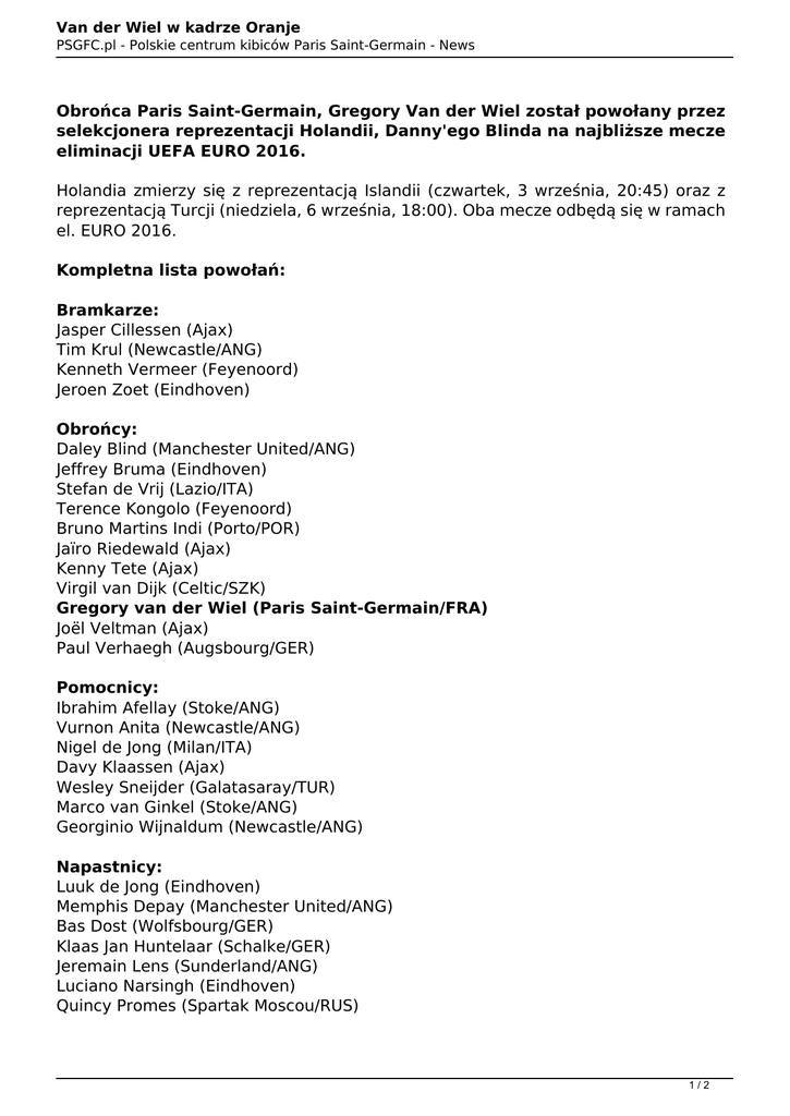 Van der Wiel w kadrze Oranje PSGFC.pl - Polskie centrum kibiców Paris Saint-Germain - News Obrońca Paris Saint-Germain, Gregory Van der Wiel został powołany przez selekcjonera reprezentacji Holandii, Danny'ego Blinda na najbliższe mecze eliminacji UEFA EURO 2016. Holandia zmierzy się z reprezentacją Islandii (czwartek, 3 września, 20:45) oraz z reprezentacją Turcji (niedziela, 6 września, 18:00). Oba mecze odbędą się w ramach el. EURO 2016. Kompletna lista powołań: Bramkarze: Jasper Cillessen (Ajax) Tim Krul (Newcastle/ANG) Kenneth Vermeer (Feyenoord) Jeroen Zoet (Eindhoven) Obrońcy: Daley Blind (Manchester United/ANG) Jeffrey Bruma (Eindhoven) Stefan de Vrij (Lazio/ITA) Terence Kongolo (Feyenoord) Bruno Martins Indi (Porto/POR) Jaïro Riedewald (Ajax) Kenny Tete (Ajax) Virgil van Dijk (Celtic/SZK) Gregory van der Wiel (Paris Saint-Germain/FRA) Joël Veltman (Ajax) Paul Verhaegh (Augsbourg/GER) Pomocnicy: Ibrahim Afellay (Stoke/ANG) Vurnon Anita (Newcastle/ANG) Nigel de Jong (Milan/ITA) Davy Klaassen (Ajax) Wesley Sneijder (Galatasaray/TUR) Marco van Ginkel (Stoke/ANG) Georginio Wijnaldum (Newcastle/ANG) Napastnicy: Luuk de Jong (Eindhoven) Memphis Depay (Manchester United/ANG) Bas Dost (Wolfsbourg/GER) Klaas Jan Huntelaar (Schalke/GER) Jeremain Lens (Sunderland/ANG) Luciano Narsingh (Eindhoven) Quincy Promes (Spartak Moscou/RUS) 1/2 Van der Wiel w kadrze Oranje PSGFC.pl - Polskie centrum kibiców Paris Saint-Germain - News Robin van Persie (Fenerbahçe/TUR) Autor: Bercik 2/2 Powered by TCPDF (www.tcpdf.org)
