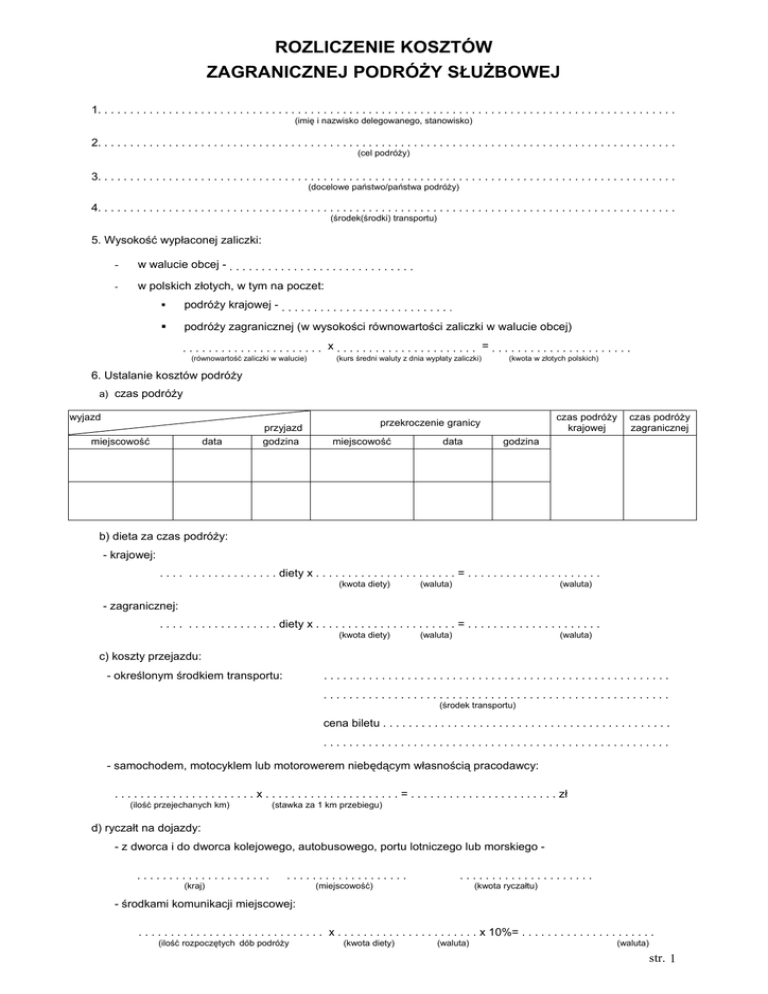 ROZLICZENIE KOSZTÓW ZAGRANICZNEJ PODRÓŻY SŁUŻBOWEJ 1. . . . . . . . . . . . . . . . . . . . . . . . . . . . . . . . . . . . . . . . . . . . . . . . . . . . . . . . . . . . . . . . . . . . . . . . . . . . . . . . . . . . . . . . . . (imię i nazwisko delegowanego, stanowisko) 2. . . . . . . . . . . . . . . . . . . . . . . . . . . . . . . . . . . . . . . . . . . . . . . . . . . . . . . . . . . . . . . . . . . . . . . . . . . . . . . . . . . . . . . . . . (cel podróży) 3. . . . . . . . . . . . . . . . . . . . . . . . . . . . . . . . . . . . . . . . . . . . . . . . . . . . . . . . . . . . . . . . . . . . . . . . . . . . . . . . . . . . . . . . . . (docelowe państwo/państwa podróży) 4. . . . . . . . . . . . . . . . . . . . . . . . . . . . . . . . . . . . . . . . . . . . . . . . . . . . . . . . . . . . . . . . . . . . . . . . . . . . . . . . . . . . . . . . . . (środek(środki) transportu) 5. Wysokość wypłaconej zaliczki: - w walucie obcej - . . . . . . . . . . . . . . . . . . . . . . . . . . . . . - w polskich złotych, w tym na poczet: podróży krajowej - . . . . . . . . . . . . . . . . . . . . . . . . . . . podróży zagranicznej (w wysokości równowartości zaliczki w walucie obcej) ...................... x...................... =...................... (równowartość zaliczki w walucie) (kurs średni waluty z dnia wypłaty zaliczki) (kwota w złotych polskich) 6. Ustalanie kosztów podróży a) czas podróży wyjazd miejscowość data przyjazd godzina czas podróży krajowej przekroczenie granicy miejscowość data czas podróży zagranicznej godzina b) dieta za czas podróży: - krajowej: . . . . . . . . . . . . . . . . . . diety x . . . . . . . . . . . . . . . . . . . . . . = . . . . . . . . . . . . . . . . . . . . . (kwota diety) (waluta) (waluta) - zagranicznej: . . . . . . . . . . . . . . . . . . diety x . . . . . . . . . . . . . . . . . . . . . . = . . . . . . . . . . . . . . . . . . . . . (kwota diety) (waluta) (waluta) c) koszty przejazdu: - określonym środkiem transportu: ...................................................... ...................................................... (środek transportu) cena biletu . . . . . . . . . . . . . . . . . . . . . . . . . . . . . . . . . . . . . . . . . . . . . ...................................................... - samochodem, motocyklem lub motorowerem niebędącym własnością pracodawcy: . . . . . . . . . . . . . . . . . . . . . . x . . . . . . . . . . . . . . . . . . . . . = . . . . . . . . . . . . . . . . . . . . . . . zł (ilość przejechanych km) (stawka za 1 km przebiegu) d) ryczałt na dojazdy: - z dworca i do dworca kolejowego, autobusowego, portu lotniczego lub morskiego ..................... ................... (kraj) ..................... (miejscowość) (kwota ryczałtu) - środkami komunikacji miejscowej: . . . . . . . . . . . . . . . . . . . . . . . . . . . . . x . . . . . . . . . . . . . . . . . . . . . . x 10%= . . . . . . . . . . . . . . . . . . . . . (ilość rozpoczętych dób podróży (kwota diety) (waluta) (waluta) str. 1 e) koszty noclegu: - ryczałt . . . . . . . . . . . . . . . . . x . . . . . . . . . . . . . . . . . . . . . . x 25% = . . . . . . . . . . . . . . . . . . (ilość noclegów) (limit na nocleg) (waluta) (waluta) - w wysokości stwierdzonej rachunkiem hotelowym - . . . . . . . . . . . . . . . . . . . . . . (w granicach limitu) - w wysokości stwierdzonej rachunkiem hotelowym - . . . . . . . . . . . . . . . . . . . . . . (w granicach przekraczających limit - za zgodą pracodawcy) f) inne wydatki: . . . . . . . . . . . . . . . . . . . rodzaj . . . . . . . . . . . . . . . . . . . kwota . . . . . . . . . . . . . . . . . . . rodzaj . . . . . . . . . . . . . . . . . . . kwota . . . . . . . . . . . . . . . . . . . rodzaj . . . . . . . . . . . . . . . . . . . kwota Ogółem koszty podróży: - w walucie obcej . . . . . . . . . . . . . . . . . . . . . . . . . . . . . . . . . . . . . . . - w polskich złotych . . . . . . . . . . . . . . . . . . . . . . . . . . . . . . . . . . . . . . Rozliczenie zaliczki: 1) pobranej w walucie obcej / w walucie obcej i polskich złotych*) - koszty w walucie obcej - . . . . . . . . . . . . . . . . . . . . . . . . . . . . . . . . . . . . - zaliczka pobrana w walucie obcej - . . . . . . . . . . . . . . . . . . . . . . . . . . . - koszty w polskich złotych - . . . . . . . . . . . . . . . . . . . . . . . . . . . . . . . . . . - zaliczka pobrana w polskich złotych - . . . . . . . . . . . . . . . . . . . . . . . . . . ) - do zwrotu / do wypłaty* w walucie obcej - . . . . . . . . . . . . . . . . . . . . . . ) - do zwrotu / do wypłaty* w polskich złotych - . . . . . . . . . . . . . . . . . . . . 2) pobranej w walucie polskiej - koszty w walucie obcej po przeliczeniu na złote ...................... x...................... =...................... (wydatki w walucie) (kurs waluty - z dnia wypłaty zaliczki) (kwota w złotych polskich) - koszty w polskich złotych - . . . . . . . . . . . . . . . . . . . . . . . . . . . . . . - zaliczka pobrana w polskich złotych - . . . . . . . . . . . . . . . . . . . . . . ) - do zwrotu / do wypłaty* - . . . . . . . . . . . . . . . . . . . . . . . . . . . . . . . Załączam Niniejszy rachunek przedkładam .......................... .......................... rachunków (dowodów) (podpis) Rachunek sprawdzono pod względem merytorycznym oraz stwierdzono wykonanie polecenia służbowego ............. formalnym i rachunkowym ............... (data) (podpis) ............ ............. (data) (podpis) Niewykorzystaną zaliczkę w kwocie . . . . . . . . . . . . . . . . . . . . . . . . . . . . . . . . . . Zatwierdzono do wypłaty. . . . . . . . . . . . . . . . . . . . . . . . . . . . . . . . . . . . . wpłacono . . . . . . . . . . . . . . . . . . . . . . . . . . . . . . . . tytułem . . . . . . . . . . . . . . . . . . . . . . . . . . . . . . . . . . . . . . . . . . . . . . . . . . . (data) ................... ...................... 