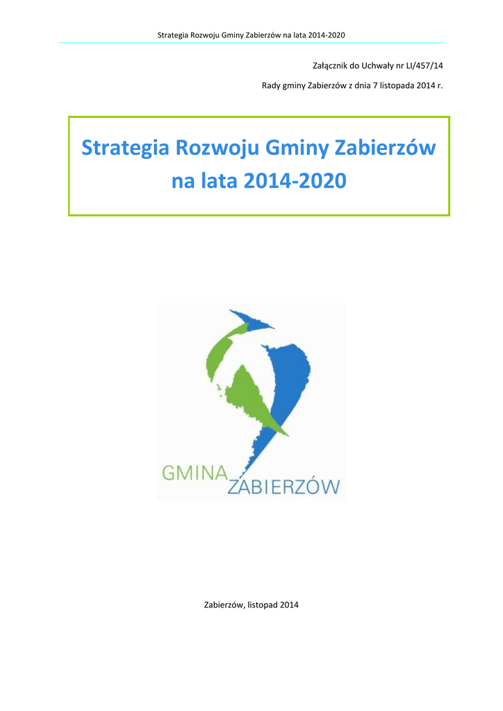 Strategia Rozwoju Gminy Zabierzów na lata 2014-2020 Załącznik do Uchwały nr LI/457/14 Rady gminy Zabierzów z dnia 7 listopada 2014 r. Strategia Rozwoju Gminy Zabierzów na lata 2014-2020 Zabierzów, listopad 2014 Strategia Rozwoju Gminy Zabierzów na lata 2014-2020 Strategia Rozwoju Gminy Zabierzów na lata 2014-2020 Opracowanie: FRDL Małopolski Instytut Samorządu Terytorialnego i Administracji 1 Strategia Rozwoju Gminy Zabierzów na lata 2014-2020 Spis treści Wprowadzenie ........................................................................................................................... 3 Konwent Strategiczny................................................................................................................. 4 Ramy instytucjonalne lokalnej polityki rozwoju ........................................................................ 8 Nadrzędne dokumenty strategiczne .......................................................................................... 9 Strategie Zintegrowane ............................................................................................................ 10 Strategia Rozwoju Województwa Małopolskiego.................................................................... 11 Subregionalny Program Rozwoju 2014-2020 ........................................................................... 13 Diagnoza podstawowych uwarunkowań rozwojowych ........................................................... 15 Analiza SWOT ........................................................................................................................... 18 Wyzwania rozwojowe .............................................................................................................. 22 Wizja i misja rozwoju Gminy Zabierzów................................................................................... 26 Plan operacyjny Strategii.......................................................................................................... 27 System monitorowania Strategii Rozwoju Gminy Zabierzów na lata 2014-2020 .................... 71 Załącznik nr 1: Raport z badań społecznych przeprowadzonych na terenie Gminy Zabierzów Załącznik nr 2: Diagnoza społeczno-gospodarcza Gminy Zabierzów 2 Strategia Rozwoju Gminy Zabierzów na lata 2014-2020 Wprowadzenie Strategia rozwoju jednostki terytorialnej jest dokumentem definiującym jej najważniejsze przedsięwzięcia społeczne, gospodarcze i środowiskowe, w tym zawiera kierunki alokacji zasobów, które w możliwie najlepszy sposób powinny przyczynić się do realizacji pożądanej wizji rozwoju. Moment określania zapisów Strategii wyznaczyło zaistnienie szczególnych szans w regionalnym i krajowym otoczeniu Gminy, związanych z nowymi instrumentami integracji europejskiej – perspektywa 2014-2020. Rozstrzygnięcia zawarte w Strategii mają na celu określenie listy najskuteczniejszych przedsięwzięć rozwojowych w tej perspektywie. Dokument Strategii Rozwoju Gminy Zabierzów na lata 2014-2020 obejmuje syntetyczną diagnozę wspólnoty lokalnej, bilans strategiczny w kategoriach sił i słabości oraz szans i zagrożeń (analizą SWOT), a także rozstrzygnięcia strategiczne. Na ostatnią ze wskazanych kategorii składają się: wizja, priorytety strategii, cele strategiczne, cele operacyjne, kierunki interwencji w rozumieniu kluczowych zadań. Ponadto, konkretyzacja zaproponowanych zapisów strategicznych następuje poprzez określenie spójności Strategii w relacji do dokumentów planujących rozwój: Polski i Europy, województwa małopolskiego, powiatu krakowskiego (w perspektywie do 2020 roku). W dokumencie Strategii zawarto również założenia dotyczące procesu jej wdrażania oraz ustalenia w zakresie monitoringu i ewaluacji. Strategia Rozwoju Gminy Zabierzów na lata 2014-2020 jest efektem prac Konwentu Strategicznego. Dzięki zaangażowaniu przedstawicieli samorządu, organizacji publicznych, przedsiębiorców i lokalnych liderów życia społecznego, Strategia stanowi nie tylko narzędzie prowadzenia polityki rozwoju lokalnego i regionalnego, ale również syntezę świadomych wyborów i rekomendacji przedstawicieli różnych społeczności tworzących wspólnotę samorządową. Gmina Zabierzów poprzez swoje położenie względem Miasta Krakowa, w Krakowskim Obszarze Metropolitalnym, stanowi naturalny obszar przepływu towarów, usług, kapitału i zasobów ludzkich. Atuty te dodatkowo wzmacnia dogodna lokalizacja względem głównych szlaków transportowych (autostrada A4, port lotniczy Kraków-Balice, linia kolejowa E30, droga krajowa nr 79) oraz położenie w korytarzu łączącym region małopolski ze Śląskiem. Wykorzystanie szans związanych z takim położeniem (gospodarczych, rekreacyjnoturystycznych, społecznych, itp.), powinno stać się w najbliższej przyszłości jednym z najważniejszych wyzwań, stojących przed całą wspólnotą samorządową. W tym kontekście, u podstaw realizacji celów i kierunków interwencji Strategii leży nawiązywanie współpracy pomiędzy Gminą a sąsiednimi jednostkami samorządu terytorialnego (szczególnie Miastem Krakowem i gminami sąsiednimi dla Krakowa w ramach Zintegrowanych Inwestycji Terytorialnych), sektorem gospodarczym, organizacjami pozarządowymi i innymi instytucjami. Wyzwanie to sprawia, iż Strategia Rozwoju Gminy Zabierzów na lata 2014-2020 zawiera zadania będące w kompetencjach innych szczebli samorządowych i partnerów gospodarczych oraz społecznych. W systemie zarządzania polityką rozwoju, Strategia pełni kluczową rolę, jako generalny plan postępowania władz samorządowych, partnerów gospodarczych i społecznych, którzy mogą się na nią powoływać w procesie pozyskiwania środków zewnętrznych oraz w oparciu o nią budować własne plany strategiczne. Dzięki temu dokument ten jest również narzędziem 3 Strategia Rozwoju Gminy Zabierzów na lata 2014-2020 kierowania i intensyfikowania współp